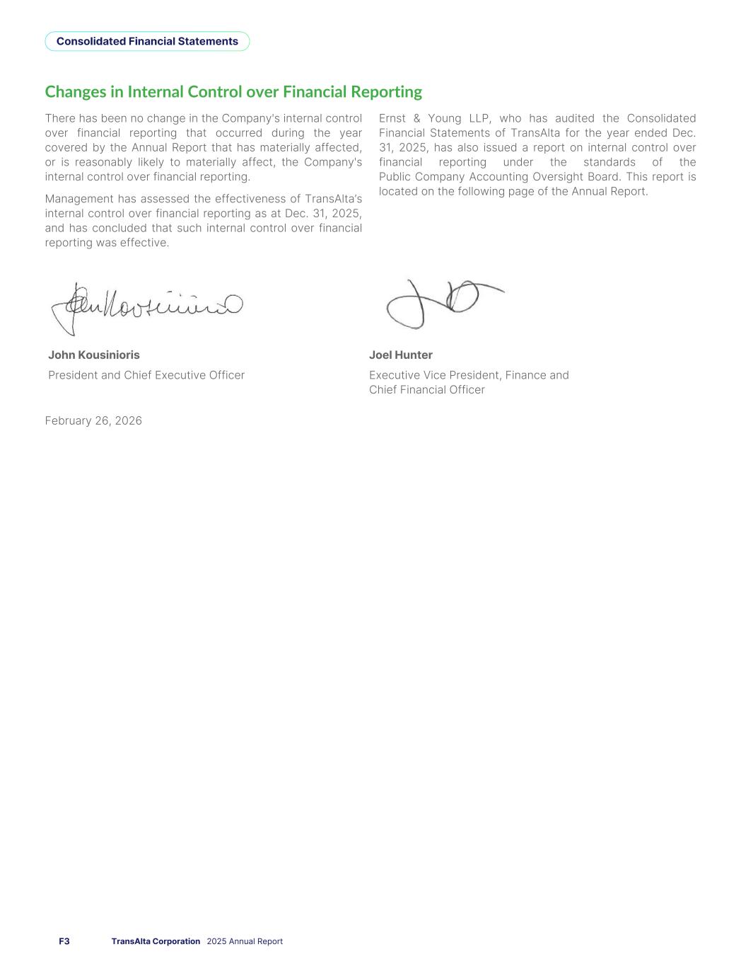 Changes in Internal Control over Financial Reporting There has been no change in the Company's internal control over financial reporting that occurred during the year covered by the Annual Report that has materially affected, or is reasonably likely to materially affect, the Company's internal control over financial reporting. Management has assessed the effectiveness of TransAlta’s internal control over financial reporting as at Dec. 31, 2025, and has concluded that such internal control over financial reporting was effective. Ernst  & Young LLP, who has audited the Consolidated Financial Statements of TransAlta for the year ended Dec. 31, 2025, has also issued a report on internal control over financial reporting under the standards of the Public Company Accounting Oversight Board. This report is located on the following page of the Annual Report. John Kousinioris Joel Hunter President and Chief Executive Officer Executive Vice President, Finance and Chief Financial Officer February 26, 2026 F3 TransAlta Corporation 2025 Annual Report