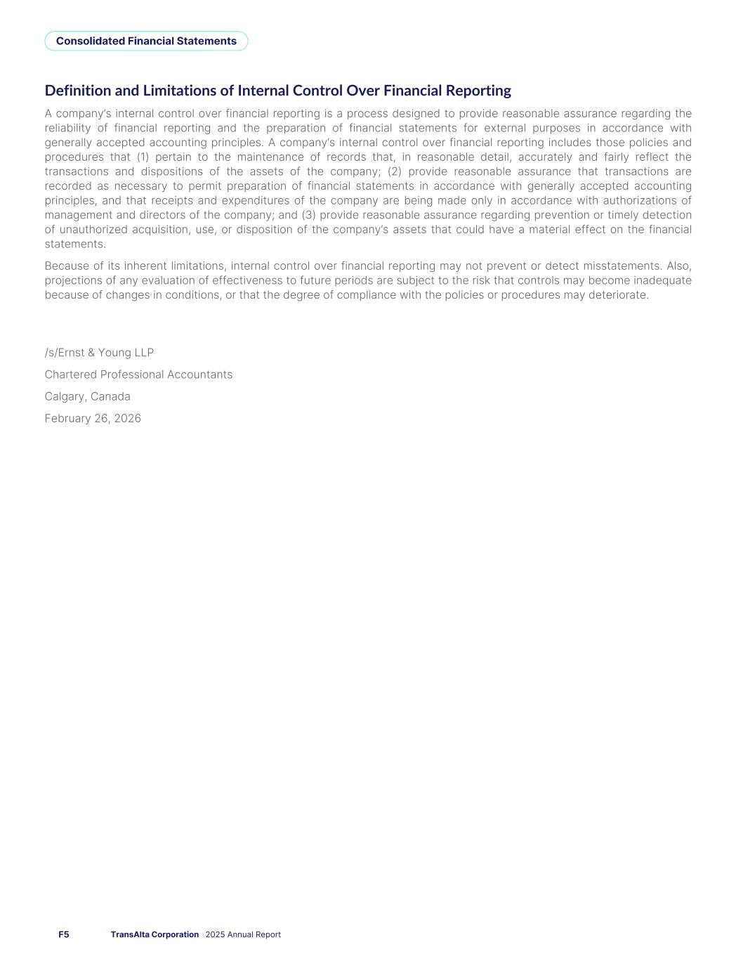 Definition and Limitations of Internal Control Over Financial Reporting A company’s internal control over financial reporting is a process designed to provide reasonable assurance regarding the reliability of financial reporting and the preparation of financial statements for external purposes in accordance with generally accepted accounting principles. A company’s internal control over financial reporting includes those policies and procedures that (1) pertain to the maintenance of records that, in reasonable detail, accurately and fairly reflect the transactions and dispositions of the assets of the company; (2) provide reasonable assurance that transactions are recorded as necessary to permit preparation of financial statements in accordance with generally accepted accounting principles, and that receipts and expenditures of the company are being made only in accordance with authorizations of management and directors of the company; and (3) provide reasonable assurance regarding prevention or timely detection of unauthorized acquisition, use, or disposition of the company’s assets that could have a material effect on the financial statements. Because of its inherent limitations, internal control over financial reporting may not prevent or detect misstatements. Also, projections of any evaluation of effectiveness to future periods are subject to the risk that controls may become inadequate because of changes in conditions, or that the degree of compliance with the policies or procedures may deteriorate. /s/Ernst & Young LLP Chartered Professional Accountants Calgary, Canada February 26, 2026 F5 TransAlta Corporation 2025 Annual Report