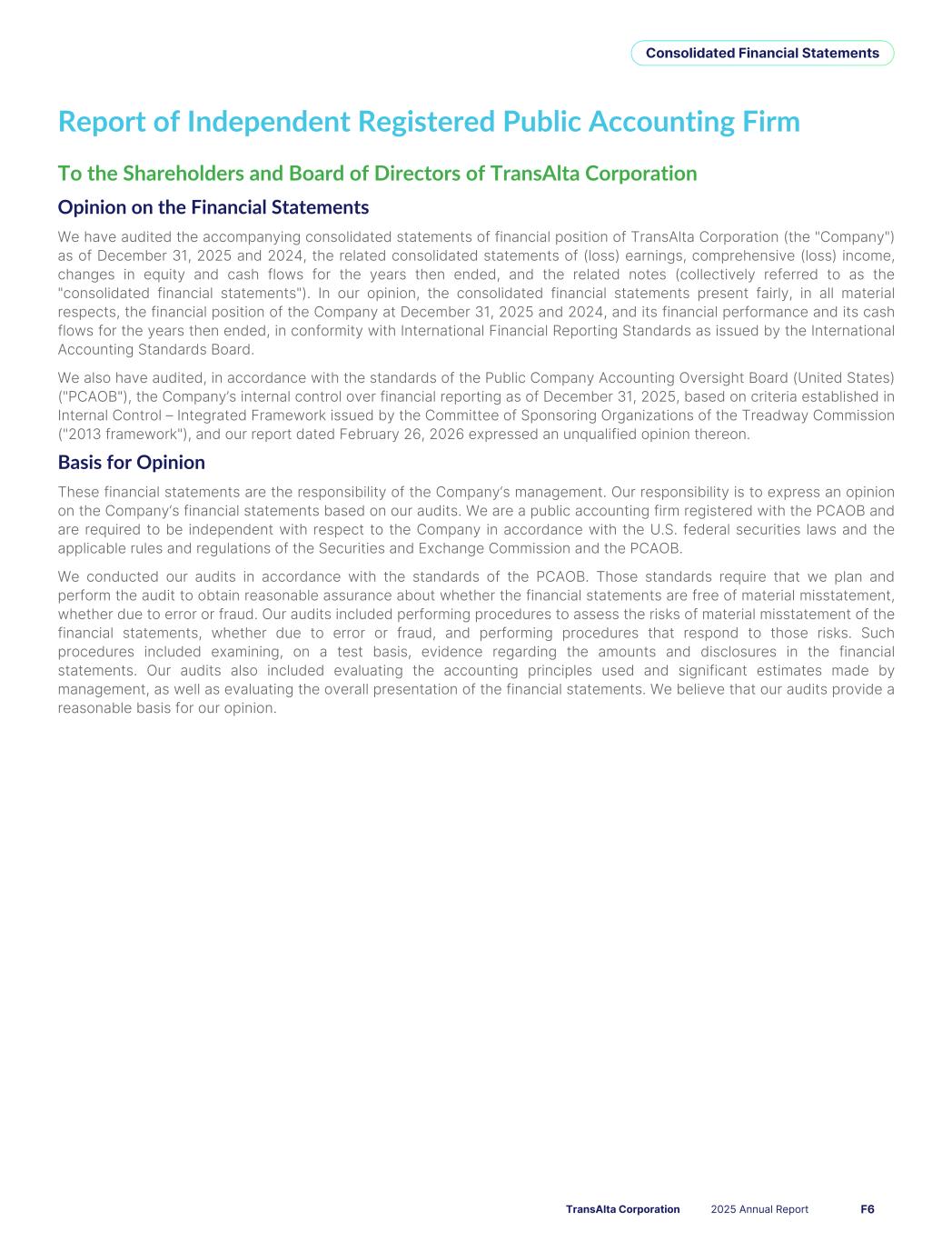 Report of Independent Registered Public Accounting Firm To the Shareholders and Board of Directors of TransAlta Corporation Opinion on the Financial Statements We have audited the accompanying consolidated statements of financial position of TransAlta Corporation (the "Company") as of December 31, 2025 and 2024, the related consolidated statements of (loss) earnings, comprehensive (loss) income, changes in equity and cash flows for the years then ended, and the related notes (collectively referred to as the "consolidated financial statements"). In our opinion, the consolidated financial statements present fairly, in all material respects, the financial position of the Company at December 31, 2025 and 2024, and its financial performance and its cash flows for the years then ended, in conformity with International Financial Reporting Standards as issued by the International Accounting Standards Board. We also have audited, in accordance with the standards of the Public Company Accounting Oversight Board (United States) ("PCAOB"), the Company’s internal control over financial reporting as of December 31, 2025, based on criteria established in Internal Control – Integrated Framework issued by the Committee of Sponsoring Organizations of the Treadway Commission ("2013 framework"), and our report dated February 26, 2026 expressed an unqualified opinion thereon. Basis for Opinion These financial statements are the responsibility of the Company‘s management. Our responsibility is to express an opinion on the Company‘s financial statements based on our audits. We are a public accounting firm registered with the PCAOB and are required to be independent with respect to the Company in accordance with the U.S. federal securities laws and the applicable rules and regulations of the Securities and Exchange Commission and the PCAOB. We conducted our audits in accordance with the standards of the PCAOB. Those standards require that we plan and perform the audit to obtain reasonable assurance about whether the financial statements are free of material misstatement, whether due to error or fraud. Our audits included performing procedures to assess the risks of material misstatement of the financial statements, whether due to error or fraud, and performing procedures that respond to those risks. Such procedures included examining, on a test basis, evidence regarding the amounts and disclosures in the financial statements. Our audits also included evaluating the accounting principles used and significant estimates made by management, as well as evaluating the overall presentation of the financial statements. We believe that our audits provide a reasonable basis for our opinion. TransAlta Corporation 2025 Annual Report F6