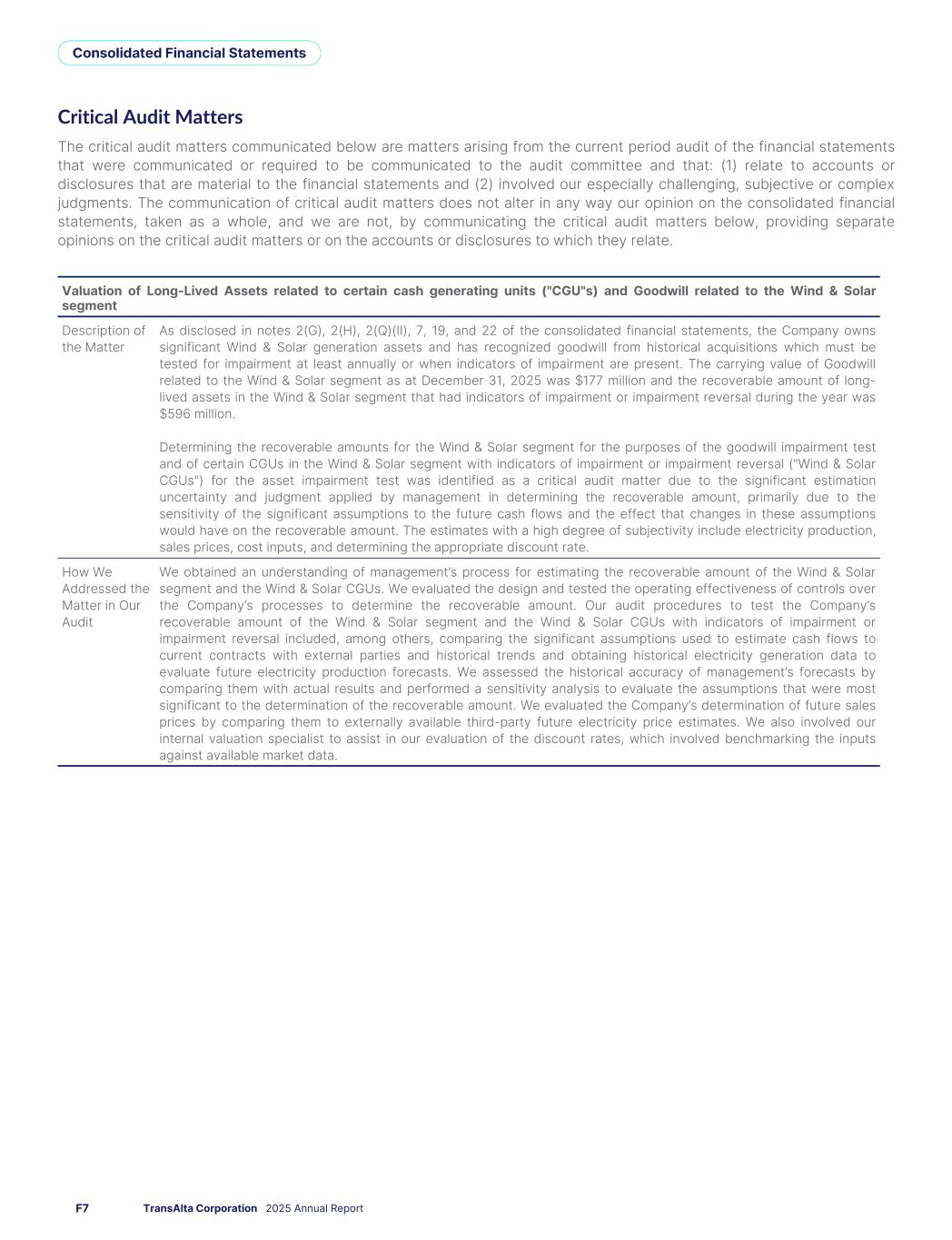 Critical Audit Matters The critical audit matters communicated below are matters arising from the current period audit of the financial statements that were communicated or required to be communicated to the audit committee and that: (1) relate to accounts or disclosures that are material to the financial statements and (2) involved our especially challenging, subjective or complex judgments. The communication of critical audit matters does not alter in any way our opinion on the consolidated financial statements, taken as a whole, and we are not, by communicating the critical audit matters below, providing separate opinions on the critical audit matters or on the accounts or disclosures to which they relate. Valuation of Long-Lived Assets related to certain cash generating units ("CGU"s) and Goodwill related to the Wind & Solar segment Description of the Matter As disclosed in notes 2(G), 2(H), 2(Q)(II), 7, 19, and 22 of the consolidated financial statements, the Company owns significant Wind & Solar generation assets and has recognized goodwill from historical acquisitions which must be tested for impairment at least annually or when indicators of impairment are present. The carrying value of Goodwill related to the Wind & Solar segment as at December 31, 2025 was $177 million and the recoverable amount of long- lived assets in the Wind & Solar segment that had indicators of impairment or impairment reversal during the year was $596 million. Determining the recoverable amounts for the Wind & Solar segment for the purposes of the goodwill impairment test and of certain CGUs in the Wind & Solar segment with indicators of impairment or impairment reversal ("Wind & Solar CGUs") for the asset impairment test was identified as a critical audit matter due to the significant estimation uncertainty and judgment applied by management in determining the recoverable amount, primarily due to the sensitivity of the significant assumptions to the future cash flows and the effect that changes in these assumptions would have on the recoverable amount. The estimates with a high degree of subjectivity include electricity production, sales prices, cost inputs, and determining the appropriate discount rate. How We Addressed the Matter in Our Audit We obtained an understanding of management’s process for estimating the recoverable amount of the Wind & Solar segment and the Wind & Solar CGUs. We evaluated the design and tested the operating effectiveness of controls over the Company’s processes to determine the recoverable amount. Our audit procedures to test the Company’s recoverable amount of the Wind & Solar segment and the Wind & Solar CGUs with indicators of impairment or impairment reversal included, among others, comparing the significant assumptions used to estimate cash flows to current contracts with external parties and historical trends and obtaining historical electricity generation data to evaluate future electricity production forecasts. We assessed the historical accuracy of management’s forecasts by comparing them with actual results and performed a sensitivity analysis to evaluate the assumptions that were most significant to the determination of the recoverable amount. We evaluated the Company’s determination of future sales prices by comparing them to externally available third-party future electricity price estimates. We also involved our internal valuation specialist to assist in our evaluation of the discount rates, which involved benchmarking the inputs against available market data. F7 TransAlta Corporation 2025 Annual Report