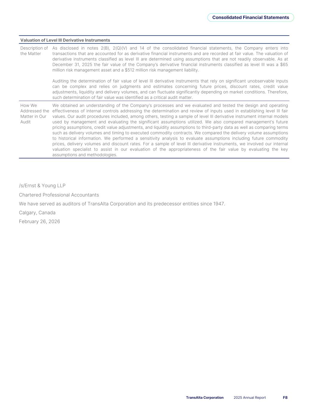 Valuation of Level III Derivative Instruments Description of the Matter As disclosed in notes 2(B), 2(Q)(V) and 14 of the consolidated financial statements, the Company enters into transactions that are accounted for as derivative financial instruments and are recorded at fair value. The valuation of derivative instruments classified as level III are determined using assumptions that are not readily observable. As at December 31, 2025 the fair value of the Company’s derivative financial instruments classified as level III was a $65 million risk management asset and a $512 million risk management liability. Auditing the determination of fair value of level III derivative instruments that rely on significant unobservable inputs can be complex and relies on judgments and estimates concerning future prices, discount rates, credit value adjustments, liquidity and delivery volumes, and can fluctuate significantly depending on market conditions. Therefore, such determination of fair value was identified as a critical audit matter. How We Addressed the Matter in Our Audit We obtained an understanding of the Company’s processes and we evaluated and tested the design and operating effectiveness of internal controls addressing the determination and review of inputs used in establishing level III fair values. Our audit procedures included, among others, testing a sample of level III derivative instrument internal models used by management and evaluating the significant assumptions utilized. We also compared management's future pricing assumptions, credit value adjustments, and liquidity assumptions to third-party data as well as comparing terms such as delivery volumes and timing to executed commodity contracts. We compared the delivery volume assumptions to historical information. We performed a sensitivity analysis to evaluate assumptions including future commodity prices, delivery volumes and discount rates. For a sample of level III derivative instruments, we involved our internal valuation specialist to assist in our evaluation of the appropriateness of the fair value by evaluating the key assumptions and methodologies. /s/Ernst & Young LLP Chartered Professional Accountants We have served as auditors of TransAlta Corporation and its predecessor entities since 1947. Calgary, Canada February 26, 2026 TransAlta Corporation 2025 Annual Report F8