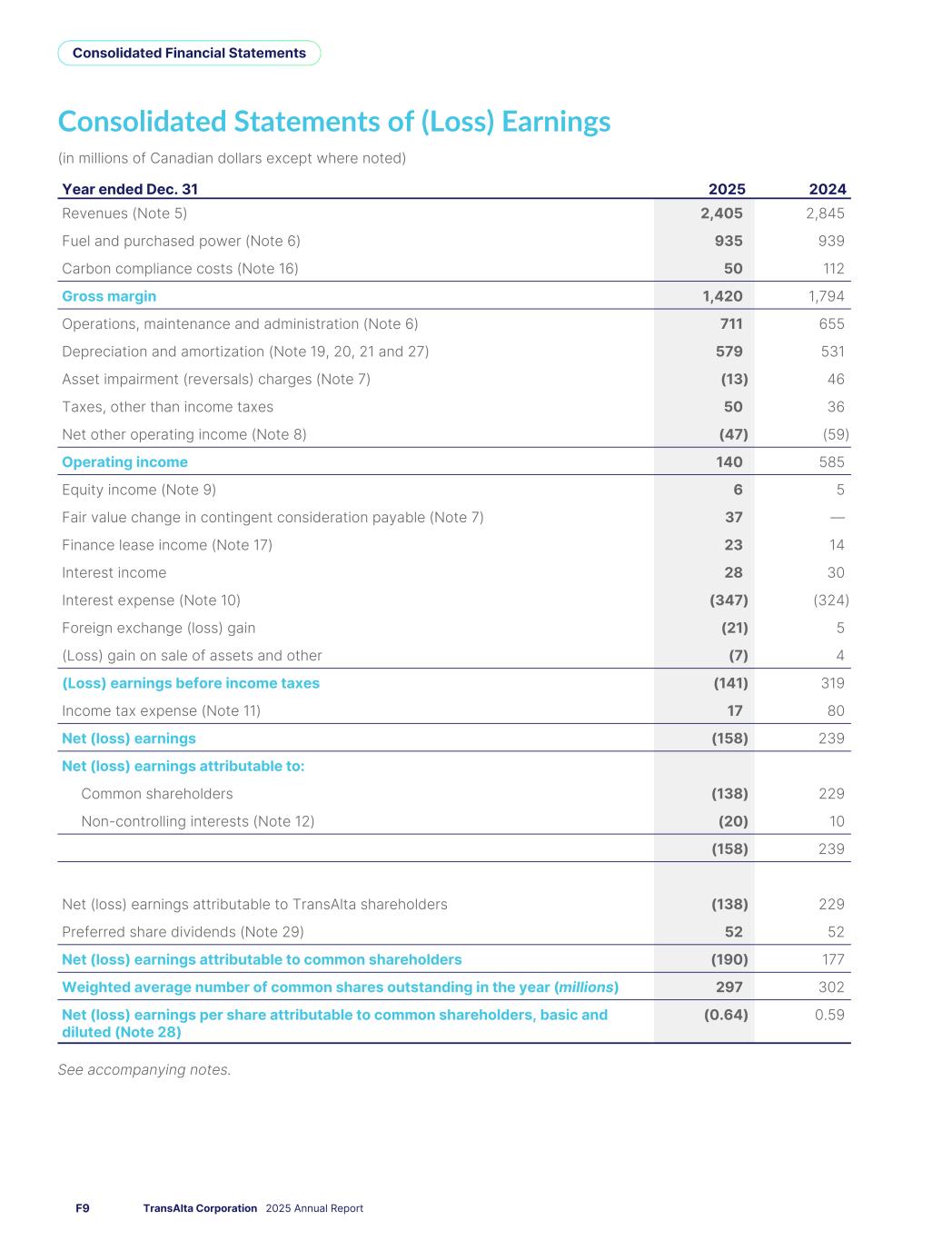 Consolidated Statements of (Loss) Earnings (in millions of Canadian dollars except where noted) Year ended Dec. 31 2025 2024 Revenues (Note 5) 2,405 2,845 Fuel and purchased power (Note 6) 935 939 Carbon compliance costs (Note 16) 50 112 Gross margin 1,420 1,794 Operations, maintenance and administration (Note 6) 711 655 Depreciation and amortization (Note 19, 20, 21 and 27) 579 531 Asset impairment (reversals) charges (Note 7) (13) 46 Taxes, other than income taxes 50 36 Net other operating income (Note 8) (47) (59) Operating income 140 585 Equity income (Note 9) 6 5 Fair value change in contingent consideration payable (Note 7) 37 — Finance lease income (Note 17) 23 14 Interest income 28 30 Interest expense (Note 10) (347) (324) Foreign exchange (loss) gain (21) 5 (Loss) gain on sale of assets and other (7) 4 (Loss) earnings before income taxes (141) 319 Income tax expense (Note 11) 17 80 Net (loss) earnings (158) 239 Net (loss) earnings attributable to:     Common shareholders (138) 229 Non-controlling interests (Note 12) (20) 10   (158) 239 Net (loss) earnings attributable to TransAlta shareholders (138) 229 Preferred share dividends (Note 29) 52 52 Net (loss) earnings attributable to common shareholders (190) 177 Weighted average number of common shares outstanding in the year (millions) 297 302 Net (loss) earnings per share attributable to common shareholders, basic and diluted (Note 28) (0.64) 0.59 See accompanying notes. F9 TransAlta Corporation 2025 Annual Report