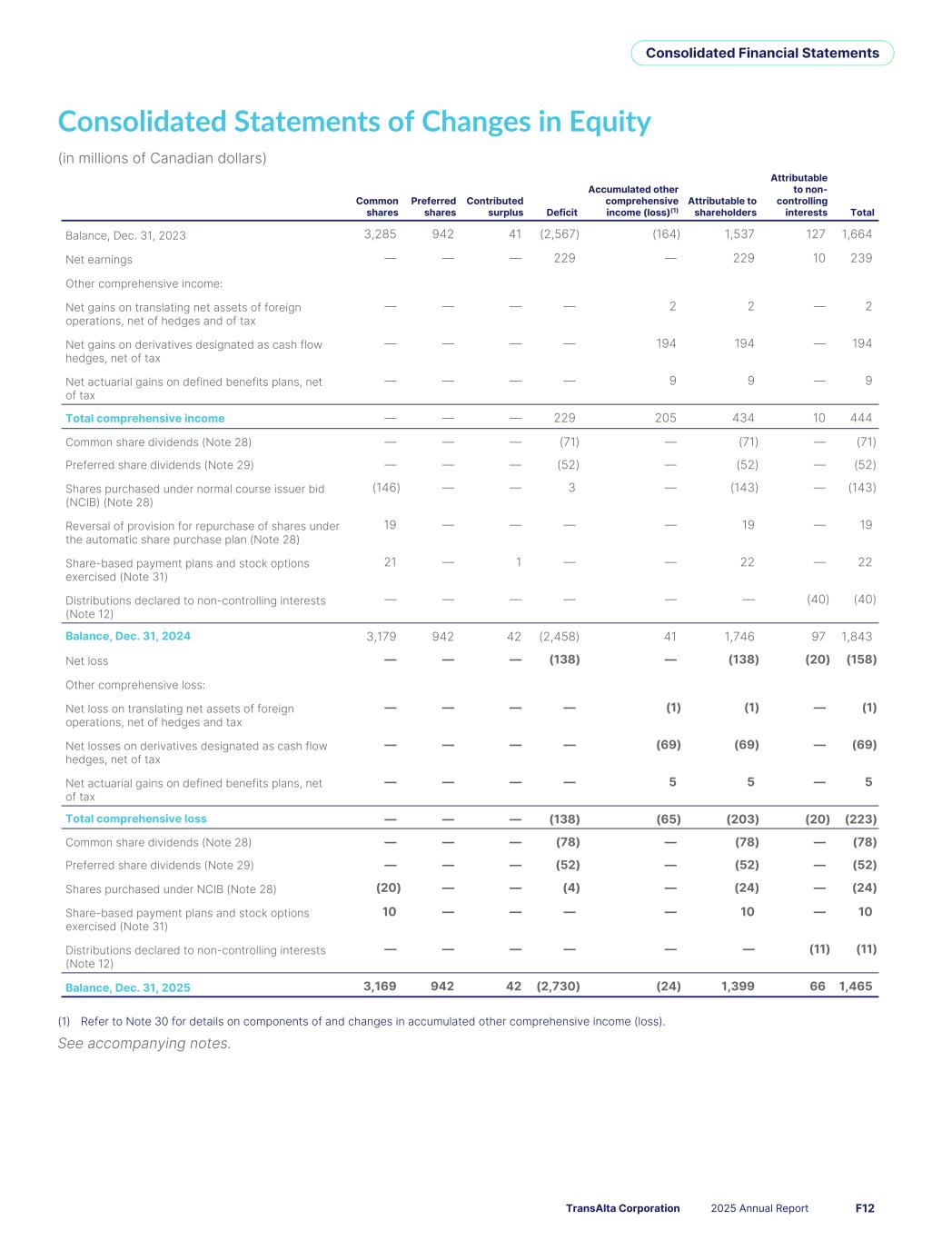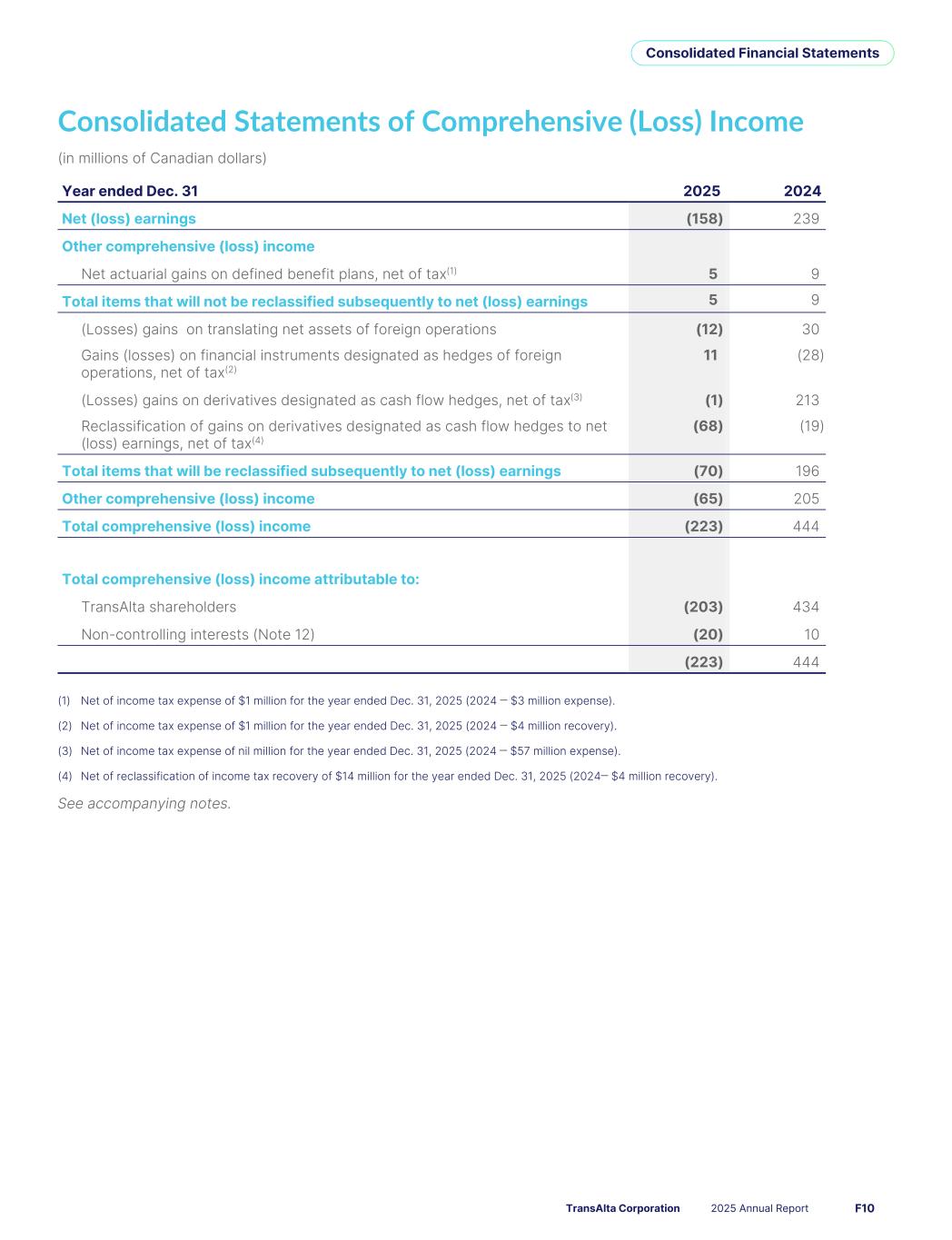 Consolidated Statements of Comprehensive (Loss) Income (in millions of Canadian dollars) Year ended Dec. 31 2025 2024 Net (loss) earnings (158) 239 Other comprehensive (loss) income   Net actuarial gains on defined benefit plans, net of tax(1) 5 9 Total items that will not be reclassified subsequently to net (loss) earnings 5 9 (Losses) gains on translating net assets of foreign operations (12) 30 Gains (losses) on financial instruments designated as hedges of foreign operations, net of tax(2) 11 (28) (Losses) gains on derivatives designated as cash flow hedges, net of tax(3) (1) 213 Reclassification of gains on derivatives designated as cash flow hedges to net (loss) earnings, net of tax(4) (68) (19) Total items that will be reclassified subsequently to net (loss) earnings (70) 196 Other comprehensive (loss) income (65) 205 Total comprehensive (loss) income (223) 444 Total comprehensive (loss) income attributable to:     TransAlta shareholders (203) 434 Non-controlling interests (Note 12) (20) 10   (223) 444 (1) Net of income tax expense of $1 million for the year ended Dec. 31, 2025 (2024 – $3 million expense). (2) Net of income tax expense of $1 million for the year ended Dec. 31, 2025 (2024 – $4 million recovery). (3) Net of income tax expense of nil million for the year ended Dec. 31, 2025 (2024 – $57 million expense). (4) Net of reclassification of income tax recovery of $14 million for the year ended Dec. 31, 2025 (2024– $4 million recovery). See accompanying notes. TransAlta Corporation 2025 Annual Report F10