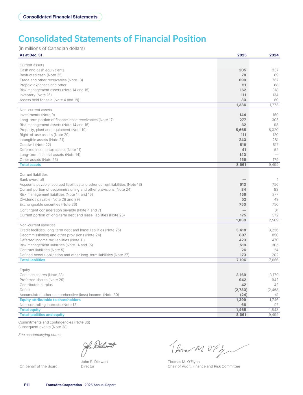 Consolidated Statements of Financial Position (in millions of Canadian dollars) As at Dec. 31 2025 2024 Current assets Cash and cash equivalents 205 337 Restricted cash (Note 25) 78 69 Trade and other receivables (Note 13) 699 767 Prepaid expenses and other 51 68 Risk management assets (Note 14 and 15) 162 318 Inventory (Note 16) 111 134 Assets held for sale (Note 4 and 18) 30 80   1,336 1,773 Non-current assets Investments (Note 9) 144 159 Long-term portion of finance lease receivables (Note 17) 277 305 Risk management assets (Note 14 and 15) 32 93 Property, plant and equipment (Note 19) 5,665 6,020 Right-of-use assets (Note 20) 111 120 Intangible assets (Note 21) 243 281 Goodwill (Note 22) 516 517 Deferred income tax assets (Note 11) 41 52 Long-term financial assets (Note 14) 140 — Other assets (Note 23) 156 179 Total assets 8,661 9,499 Current liabilities Bank overdraft — 1 Accounts payable, accrued liabilities and other current liabilities (Note 13) 613 756 Current portion of decommissioning and other provisions (Note 24) 84 83 Risk management liabilities (Note 14 and 15) 156 277 Dividends payable (Note 28 and 29) 52 49 Exchangeable securities (Note 26) 750 750 Contingent consideration payable (Note 4 and 7) — 81 Current portion of long-term debt and lease liabilities (Note 25) 175 572 1,830 2,569 Non-current liabilities Credit facilities, long-term debt and lease liabilities (Note 25) 3,418 3,236 Decommissioning and other provisions (Note 24) 807 850 Deferred income tax liabilities (Note 11) 423 470 Risk management liabilities (Note 14 and 15) 519 305 Contract liabilities (Note 5) 26 24 Defined benefit obligation and other long-term liabilities (Note 27) 173 202 Total liabilities 7,196 7,656 Equity     Common shares (Note 28) 3,169 3,179 Preferred shares (Note 29) 942 942 Contributed surplus 42 42 Deficit (2,730) (2,458) Accumulated other comprehensive (loss) income (Note 30) (24) 41 Equity attributable to shareholders 1,399 1,746 Non-controlling interests (Note 12) 66 97 Total equity 1,465 1,843 Total liabilities and equity 8,661 9,499 Commitments and contingencies (Note 36) Subsequent events (Note 38) See accompanying notes. On behalf of the Board: John P. Dielwart Director Thomas M. O'Flynn Chair of Audit, Finance and Risk Committee F11 TransAlta Corporation 2025 Annual Report