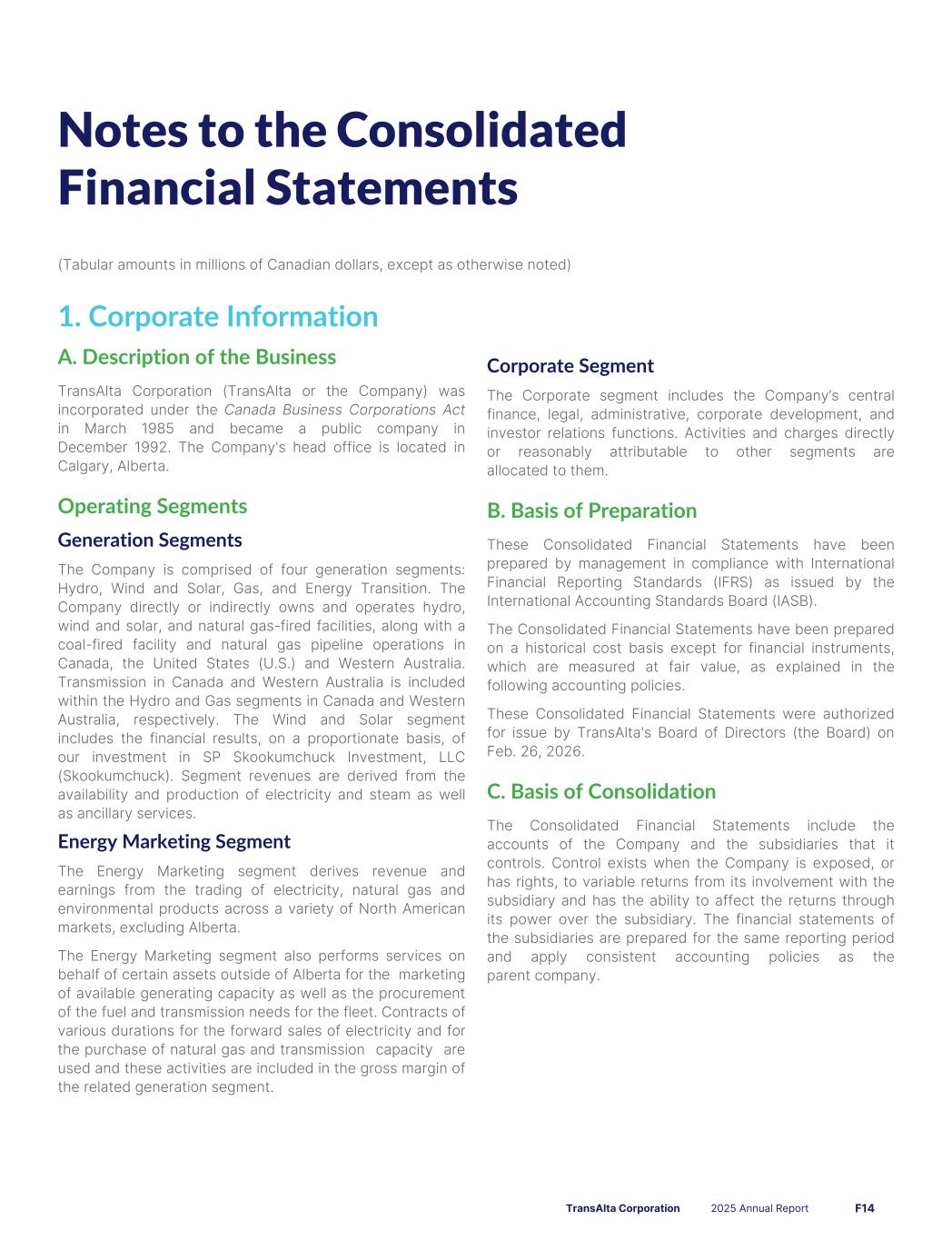 Notes to the Consolidated Financial Statements (Tabular amounts in millions of Canadian dollars, except as otherwise noted) 1. Corporate Information A. Description of the Business TransAlta Corporation (TransAlta or the Company) was incorporated under the Canada Business Corporations Act in March  1985 and became a public company in December  1992. The Company's head office is located in Calgary, Alberta. Operating Segments Generation Segments The Company is comprised of four generation segments: Hydro, Wind and Solar, Gas, and Energy Transition. The Company directly or indirectly owns and operates hydro, wind and solar, and natural gas-fired facilities, along with a coal-fired facility and natural gas pipeline operations in Canada, the United States (U.S.) and Western Australia. Transmission in Canada and Western Australia is included within the Hydro and Gas segments in Canada and Western Australia, respectively. The Wind and Solar segment includes the financial results, on a proportionate basis, of our investment in SP Skookumchuck Investment, LLC (Skookumchuck). Segment revenues are derived from the availability and production of electricity and steam as well as ancillary services. Energy Marketing Segment The Energy Marketing segment derives revenue and earnings from the trading of electricity, natural gas and environmental products across a variety of North American markets, excluding Alberta. The Energy Marketing segment also performs services on behalf of certain assets outside of Alberta for the marketing of available generating capacity as well as the procurement of the fuel and transmission needs for the fleet. Contracts of various durations for the forward sales of electricity and for the purchase of natural gas and transmission   capacity   are   used and these activities are included in the gross margin of the related generation segment. Corporate Segment The Corporate segment includes the Company’s central finance, legal, administrative, corporate development, and investor relations functions. Activities and charges directly or reasonably attributable to other segments are allocated to them. B. Basis of Preparation These Consolidated Financial Statements have been prepared by management in compliance with International Financial Reporting Standards (IFRS) as issued by the International Accounting Standards Board (IASB). The Consolidated Financial Statements have been prepared on a historical cost basis except for financial instruments, which are measured at fair value, as explained in the following accounting policies. These Consolidated Financial Statements were authorized for issue by TransAlta's Board of Directors (the Board) on Feb. 26, 2026. C. Basis of Consolidation The Consolidated Financial Statements include the accounts of the Company and the subsidiaries that it controls. Control exists when the Company is exposed, or has rights, to variable returns from its involvement with the subsidiary and has the ability to affect the returns through its power over the subsidiary. The financial statements of the subsidiaries are prepared for the same reporting period and apply consistent accounting policies as the parent company. TransAlta Corporation 2025 Annual Report F14