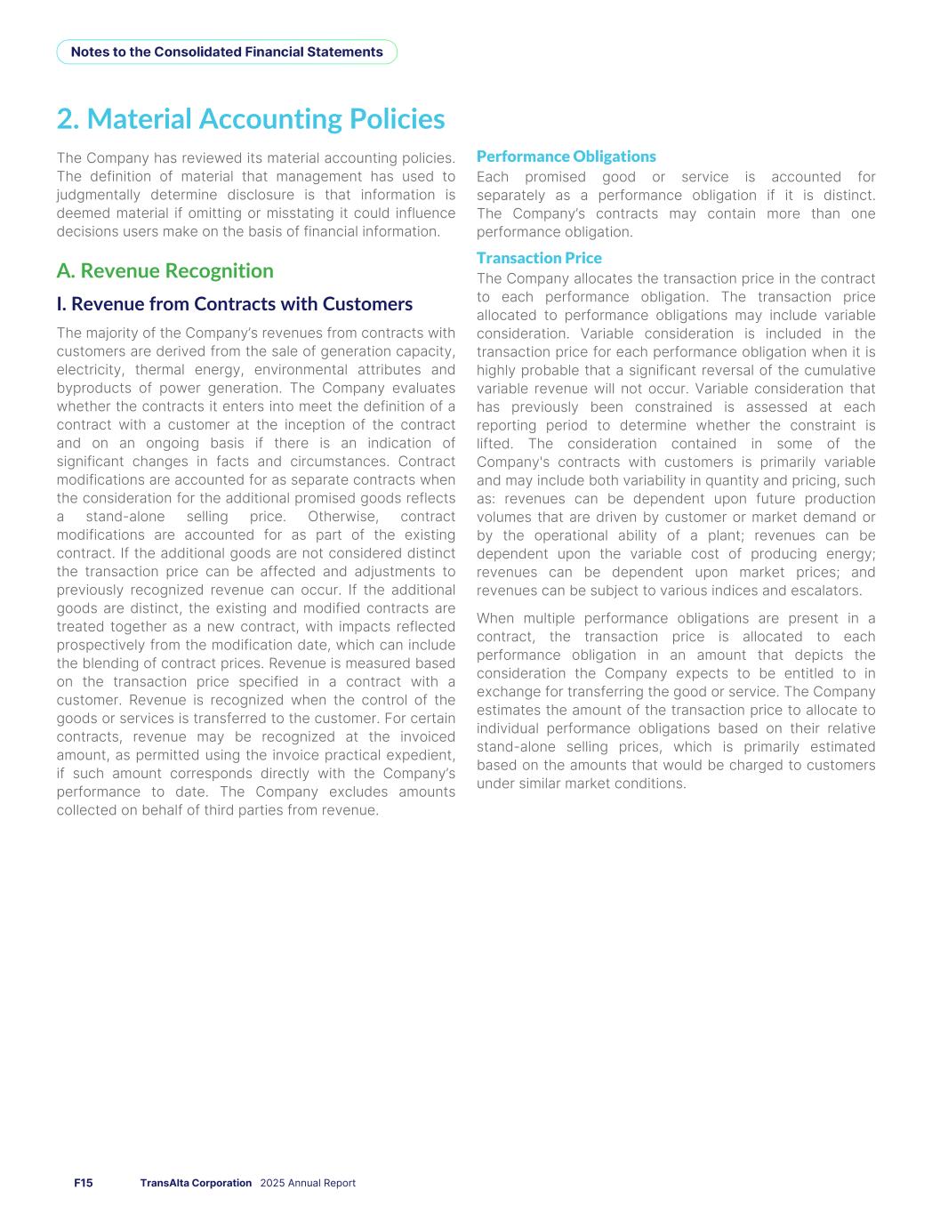 2. Material Accounting Policies The Company has reviewed its material accounting policies. The definition of material that management has used to judgmentally determine disclosure is that information is deemed material if omitting or misstating it could influence decisions users make on the basis of financial information. A. Revenue Recognition I. Revenue from Contracts with Customers The majority of the Company’s revenues from contracts with customers are derived from the sale of generation capacity, electricity, thermal energy, environmental attributes and byproducts of power generation. The Company evaluates whether the contracts it enters into meet the definition of a contract with a customer at the inception of the contract and on an ongoing basis if there is an indication of significant changes in facts and circumstances. Contract modifications are accounted for as separate contracts when the consideration for the additional promised goods reflects a stand-alone selling price. Otherwise, contract modifications are accounted for as part of the existing contract. If the additional goods are not considered distinct the transaction price can be affected and adjustments to previously recognized revenue can occur. If the additional goods are distinct, the existing and modified contracts are treated together as a new contract, with impacts reflected prospectively from the modification date, which can include the blending of contract prices. Revenue is measured based on the transaction price specified in a contract with a customer. Revenue is recognized when the control of the goods or services is transferred to the customer. For certain contracts, revenue may be recognized at the invoiced amount, as permitted using the invoice practical expedient, if such amount corresponds directly with the Company’s performance to date. The Company excludes amounts collected on behalf of third parties from revenue. Performance Obligations Each promised good or service is accounted for separately  as a performance obligation if it is distinct. The  Company’s contracts may contain more than one performance obligation. Transaction Price The Company allocates the transaction price in the contract to each performance obligation. The transaction price allocated to performance obligations may include variable consideration. Variable consideration is included in the transaction price for each performance obligation when it is highly probable that a significant reversal of the cumulative variable revenue will not occur. Variable consideration that has previously been constrained is assessed at each reporting period to determine whether the constraint is lifted. The consideration contained in some of the Company's contracts with customers is primarily variable and may include both variability in quantity and pricing, such as: revenues can be dependent upon future production volumes that are driven by customer or market demand or by the operational ability of a plant; revenues can be dependent upon the variable cost of producing energy; revenues can be dependent upon market prices; and revenues can be subject to various indices and escalators. When multiple performance obligations are present in a contract, the transaction price is allocated to each performance obligation in an amount that depicts the consideration the Company expects to be entitled to in exchange for transferring the good or service. The Company estimates the amount of the transaction price to allocate to individual performance obligations based on their relative stand-alone selling prices, which is primarily estimated based on the amounts that would be charged to customers under similar market conditions. F15 TransAlta Corporation 2025 Annual Report