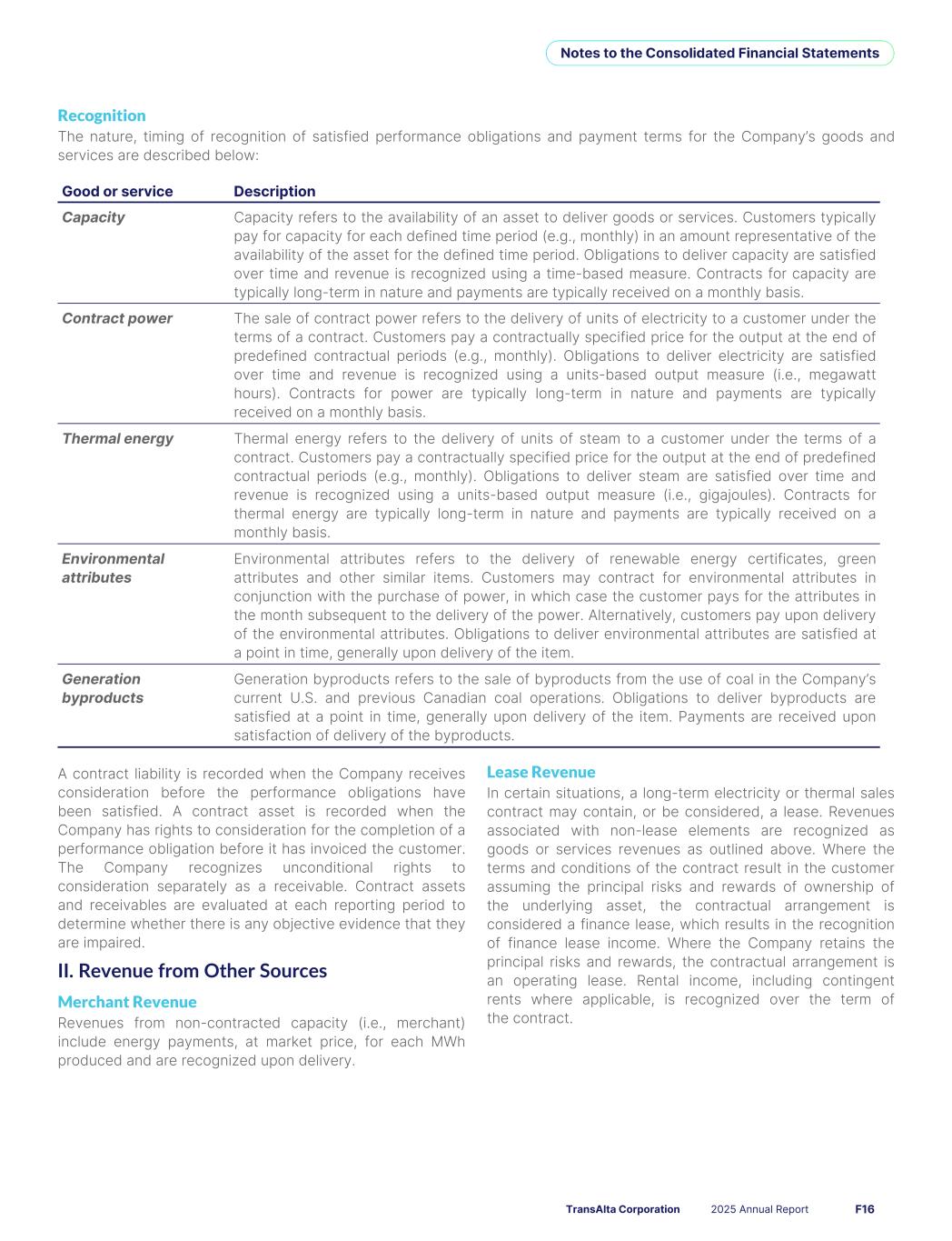 Recognition The nature, timing of recognition of satisfied performance obligations and payment terms for the Company’s goods and services are described below: Good or service Description Capacity Capacity refers to the availability of an asset to deliver goods or services. Customers typically pay for capacity for each defined time period (e.g., monthly) in an amount representative of the availability of the asset for the defined time period. Obligations to deliver capacity are satisfied over time and revenue is recognized using a time-based measure. Contracts for capacity are typically long-term in nature and payments are typically received on a monthly basis. Contract power The sale of contract power refers to the delivery of units of electricity to a customer under the terms of a contract. Customers pay a contractually specified price for the output at the end of predefined contractual periods (e.g., monthly). Obligations to deliver electricity are satisfied over time and revenue is recognized using a units-based output measure (i.e., megawatt hours). Contracts for power are typically long-term in nature and payments are typically received on a monthly basis. Thermal energy Thermal energy refers to the delivery of units of steam to a customer under the terms of a contract. Customers pay a contractually specified price for the output at the end of predefined contractual periods (e.g., monthly). Obligations to deliver steam are satisfied over time and revenue is recognized using a units-based output measure (i.e., gigajoules). Contracts for thermal energy are typically long-term in nature and payments are typically received on a monthly basis. Environmental attributes Environmental attributes refers to the delivery of renewable energy certificates, green attributes and other similar items. Customers may contract for environmental attributes in conjunction with the purchase of power, in which case the customer pays for the attributes in the month subsequent to the delivery of the power. Alternatively, customers pay upon delivery of the environmental attributes. Obligations to deliver environmental attributes are satisfied at a point in time, generally upon delivery of the item. Generation byproducts Generation byproducts refers to the sale of byproducts from the use of coal in the Company’s current U.S. and previous Canadian coal operations. Obligations to deliver byproducts are satisfied at a point in time, generally upon delivery of the item. Payments are received upon satisfaction of delivery of the byproducts. A contract liability is recorded when the Company receives consideration before the performance obligations have been satisfied. A contract asset is recorded when the Company has rights to consideration for the completion of a performance obligation before it has invoiced the customer. The Company recognizes unconditional rights to consideration separately as a receivable. Contract assets and receivables are evaluated at each reporting period to determine whether there is any objective evidence that they are impaired. II. Revenue from Other Sources Merchant Revenue Revenues from non-contracted capacity (i.e., merchant) include energy payments, at market price, for each MWh produced and are recognized upon delivery. Lease Revenue In certain situations, a long-term electricity or thermal sales contract may contain, or be considered, a lease. Revenues associated with non-lease elements are recognized as goods or services revenues as outlined above. Where the terms and conditions of the contract result in the customer assuming the principal risks and rewards of ownership of the underlying asset, the contractual arrangement is considered a finance lease, which results in the recognition of finance lease income. Where the Company retains the principal risks and rewards, the contractual arrangement is an operating lease. Rental income, including contingent rents where applicable, is recognized over the term of the contract. TransAlta Corporation 2025 Annual Report F16