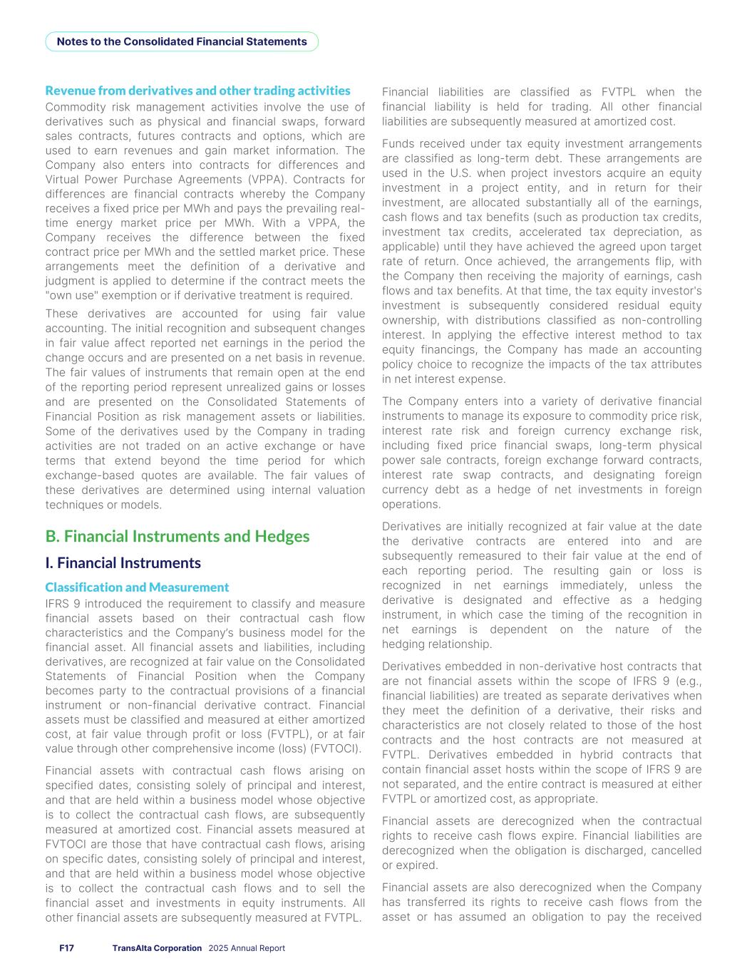 Revenue from derivatives and other trading activities Commodity risk management activities involve the use of derivatives such as physical and financial swaps, forward sales contracts, futures contracts and options, which are used to earn revenues and gain market information. The Company also enters into contracts for differences and Virtual Power Purchase Agreements (VPPA). Contracts for differences are financial contracts whereby the Company receives a fixed price per MWh and pays the prevailing real- time energy market price per MWh. With a VPPA, the Company receives the difference between the fixed contract price per MWh and the settled market price. These arrangements meet the definition of a derivative and judgment is applied to determine if the contract meets the "own use" exemption or if derivative treatment is required. These derivatives are accounted for using fair value accounting. The initial recognition and subsequent changes in fair value affect reported net earnings in the period the change occurs and are presented on a net basis in revenue. The fair values of instruments that remain open at the end of the reporting period represent unrealized gains or losses and are presented on the Consolidated Statements of Financial Position as risk management assets or liabilities. Some of the derivatives used by the Company in trading activities are not traded on an active exchange or have terms that extend beyond the time period for which exchange-based quotes are available. The fair values of these derivatives are determined using internal valuation techniques or models. B. Financial Instruments and Hedges I. Financial Instruments Classification and Measurement IFRS 9 introduced the requirement to classify and measure financial assets based on their contractual cash flow characteristics and the Company’s business model for the financial asset. All financial assets and liabilities, including derivatives, are recognized at fair value on the Consolidated Statements of Financial Position when the Company becomes party to the contractual provisions of a financial instrument or non-financial derivative contract. Financial assets must be classified and measured at either amortized cost, at fair value through profit or loss (FVTPL), or at fair value through other comprehensive income (loss) (FVTOCI). Financial assets with contractual cash flows arising on specified dates, consisting solely of principal and interest, and that are held within a business model whose objective is to collect the contractual cash flows, are subsequently measured at amortized cost. Financial assets measured at FVTOCI are those that have contractual cash flows, arising on specific dates, consisting solely of principal and interest, and that are held within a business model whose objective is to collect the contractual cash flows and to sell the financial asset and investments in equity instruments. All other financial assets are subsequently measured at FVTPL. Financial liabilities are classified as FVTPL when the financial liability is held for trading. All other financial liabilities are subsequently measured at amortized cost. Funds received under tax equity investment arrangements are classified as long-term debt. These arrangements are used in the U.S. when project investors acquire an equity investment in a project entity, and in return for their investment, are allocated substantially all of the earnings, cash flows and tax benefits (such as production tax credits, investment tax credits, accelerated tax depreciation, as applicable) until they have achieved the agreed upon target rate of return. Once achieved, the arrangements flip, with the Company then receiving the majority of earnings, cash flows and tax benefits. At that time, the tax equity investor's investment is subsequently considered residual equity ownership, with distributions classified as non-controlling interest. In applying the effective interest method to tax equity financings, the Company has made an accounting policy choice to recognize the impacts of the tax attributes in net interest expense. The Company enters into a variety of derivative financial instruments to manage its exposure to commodity price risk, interest rate risk and foreign currency exchange risk, including fixed price financial swaps, long-term physical power sale contracts, foreign exchange forward contracts, interest rate swap contracts, and designating foreign currency debt as a hedge of net investments in foreign operations. Derivatives are initially recognized at fair value at the date the derivative contracts are entered into and are subsequently remeasured to their fair value at the end of each reporting period. The resulting gain or loss is recognized in net earnings immediately, unless the derivative is designated and effective as a hedging instrument, in which case the timing of the recognition in net earnings is dependent on the nature of the hedging relationship. Derivatives embedded in non-derivative host contracts that are not financial assets within the scope of IFRS 9 (e.g., financial liabilities) are treated as separate derivatives when they meet the definition of a derivative, their risks and characteristics are not closely related to those of the host contracts and the host contracts are not measured at FVTPL. Derivatives embedded in hybrid contracts that contain financial asset hosts within the scope of IFRS 9 are not separated, and the entire contract is measured at either FVTPL or amortized cost, as appropriate. Financial assets are derecognized when the contractual rights to receive cash flows expire. Financial liabilities are derecognized when the obligation is discharged, cancelled or expired. Financial assets are also derecognized when the Company has transferred its rights to receive cash flows from the asset or has assumed an obligation to pay the received F17 TransAlta Corporation 2025 Annual Report
