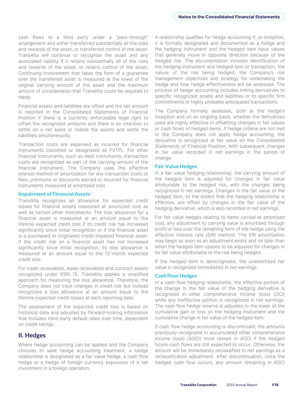 cash flows to a third party under a "pass-through" arrangement and either transferred substantially all the risks and rewards of the asset, or transferred control of the asset. TransAlta will continue to recognize the asset and any associated liability if it retains substantially all of the risks and rewards of the asset, or retains control of the asset. Continuing involvement that takes the form of a guarantee over the transferred asset is measured at the lower of the original carrying amount of the asset and the maximum amount of consideration that TransAlta could be required to repay. Financial assets and liabilities are offset and the net amount is reported in the Consolidated Statements of Financial Position if there is a currently enforceable legal right to offset the recognized amounts and there is an intention to settle on a net basis or realize the assets and settle the liabilities simultaneously. Transaction costs are expensed as incurred for financial instruments classified or designated as FVTPL. For other financial instruments, such as debt instruments, transaction costs are recognized as part of the carrying amount of the financial instrument. The Company uses the effective interest method of amortization for any transaction costs or fees, premiums or discounts earned or incurred for financial instruments measured at amortized cost. Impairment of Financial Assets TransAlta recognizes an allowance for expected credit losses for financial assets measured at amortized cost as well as certain other instruments. The loss allowance for a financial asset is measured at an amount equal to the lifetime expected credit loss if its credit risk has increased significantly since initial recognition or if the financial asset is a purchased or originated credit-impaired financial asset. If the credit risk on a financial asset has not increased significantly since initial recognition, its loss allowance is measured at an amount equal to the 12-month expected credit loss. For trade receivables, lease receivables and contract assets recognized under IFRS 15, TransAlta applies a simplified approach for measuring the loss allowance. Therefore, the Company does not track changes in credit risk but instead recognizes a loss allowance at an amount equal to the lifetime expected credit losses at each reporting date. The assessment of the expected credit loss is based on historical data and adjusted by forward-looking information that includes third-party default rates over time, dependent on credit ratings. II. Hedges Where hedge accounting can be applied and the Company chooses to seek hedge accounting treatment, a hedge relationship is designated as a fair value hedge, a cash flow hedge or a hedge of foreign currency exposures of a net investment in a foreign operation. A relationship qualifies for hedge accounting if, at inception, it is formally designated and documented as a hedge and the hedging instrument and the hedged item have values that generally move in opposite direction because of the hedged risk. The documentation includes identification of the hedging instrument and hedged item or transaction, the nature of the risk being hedged, the Company’s risk management objectives and strategy for undertaking the hedge and how hedge effectiveness will be assessed. The process of hedge accounting includes linking derivatives to specific recognized assets and liabilities or to specific firm commitments or highly probable anticipated transactions. The Company formally assesses, both at the hedge’s inception and on an ongoing basis, whether the derivatives used are highly effective in offsetting changes in fair values or cash flows of hedged items. If hedge criteria are not met or the Company does not apply hedge accounting, the derivative is recognized at fair value on the Consolidated Statements of Financial Position, with subsequent changes in fair value recorded in net earnings in the period of change. Fair Value Hedges In a fair value hedging relationship, the carrying amount of the hedged item is adjusted for changes in fair value attributable to the hedged risk, with the changes being recognized in net earnings. Changes in the fair value of the hedged item, to the extent that the hedging relationship is effective, are offset by changes in the fair value of the hedging derivative, which is also recorded in net earnings. For fair value hedges relating to items carried at amortized cost, any adjustment to carrying value is amortized through profit or loss over the remaining term of the hedge using the effective interest rate (EIR) method. The EIR amortization may begin as soon as an adjustment exists and no later than when the hedged item ceases to be adjusted for changes in its fair value attributable to the risk being hedged. If the hedged item is derecognized, the unamortized fair value is recognized immediately in net earnings. Cash Flow Hedges In a cash flow hedging relationship, the effective portion of the change in the fair value of the hedging derivative is recognized in other comprehensive income (loss) (OCI) while any ineffective portion is recognized in net earnings. The cash flow hedge reserve is adjusted to the lower of the cumulative gain or loss on the hedging instrument and the cumulative change in fair value of the hedged item. If cash flow hedge accounting is discontinued, the amounts previously recognized in accumulated other comprehensive income (loss) (AOCI) must remain in AOCI if the hedged future cash flows are still expected to occur. Otherwise, the amount will be immediately reclassified to net earnings as a reclassification adjustment. After discontinuation, once the hedged cash flow occurs, any amount remaining in AOCI TransAlta Corporation 2025 Annual Report F18