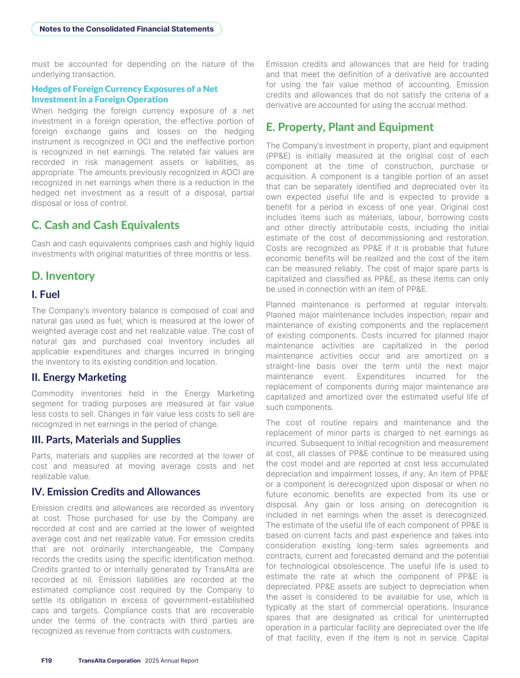 must be accounted for depending on the nature of the underlying transaction. Hedges of Foreign Currency Exposures of a Net Investment in a Foreign Operation When hedging the foreign currency exposure of a net investment in a foreign operation, the effective portion of foreign exchange gains and losses on the hedging instrument is recognized in OCI and the ineffective portion is recognized in net earnings. The related fair values are recorded in risk management assets or liabilities, as appropriate. The amounts previously recognized in AOCI are recognized in net earnings when there is a reduction in the hedged net investment as a result of a disposal, partial disposal or loss of control. C. Cash and Cash Equivalents Cash and cash equivalents comprises cash and highly liquid investments with original maturities of three months or less. D. Inventory I. Fuel The Company’s inventory balance is composed of coal and natural gas used as fuel, which is measured at the lower of weighted average cost and net realizable value. The cost of natural gas and purchased coal inventory includes all applicable expenditures and charges incurred in bringing the inventory to its existing condition and location. II. Energy Marketing Commodity inventories held in the Energy Marketing segment for trading purposes are measured at fair value less costs to sell. Changes in fair value less costs to sell are recognized in net earnings in the period of change. III. Parts, Materials and Supplies Parts, materials and supplies are recorded at the lower of cost and measured at moving average costs and net realizable value. IV. Emission Credits and Allowances Emission credits and allowances are recorded as inventory at cost. Those purchased for use by the Company are recorded at cost and are carried at the lower of weighted average cost and net realizable value. For emission credits that are not ordinarily interchangeable, the Company records the credits using the specific identification method. Credits granted to or internally generated by TransAlta are recorded at nil. Emission liabilities are recorded at the estimated compliance cost required by the Company to settle its obligation in excess of government-established caps and targets. Compliance costs that are recoverable under the terms of the contracts with third parties are recognized as revenue from contracts with customers. Emission credits and allowances that are held for trading and that meet the definition of a derivative are accounted for using the fair value method of accounting. Emission credits and allowances that do not satisfy the criteria of a derivative are accounted for using the accrual method. E. Property, Plant and Equipment The Company’s investment in property, plant and equipment (PP&E) is initially measured at the original cost of each component at the time of construction, purchase or acquisition. A component is a tangible portion of an asset that can be separately identified and depreciated over its own expected useful life and is expected to provide a benefit for a period in excess of one year. Original cost includes items such as materials, labour, borrowing costs and other directly attributable costs, including the initial estimate of the cost of decommissioning and restoration. Costs are recognized as PP&E if it is probable that future economic benefits will be realized and the cost of the item can be measured reliably. The cost of major spare parts is capitalized and classified as PP&E, as these items can only be used in connection with an item of PP&E. Planned maintenance is performed at regular intervals. Planned major maintenance includes inspection, repair and maintenance of existing components and the replacement of existing components. Costs incurred for planned major maintenance activities are capitalized in the period maintenance activities occur and are amortized on a straight-line basis over the term until the next major maintenance event. Expenditures incurred for the replacement of components during major maintenance are capitalized and amortized over the estimated useful life of such components. The cost of routine repairs and maintenance and the replacement of minor parts is charged to net earnings as incurred. Subsequent to initial recognition and measurement at cost, all classes of PP&E continue to be measured using the cost model and are reported at cost less accumulated depreciation and impairment losses, if any. An item of PP&E or a component is derecognized upon disposal or when no future economic benefits are expected from its use or disposal. Any gain or loss arising on derecognition is included in net earnings when the asset is derecognized. The estimate of the useful life of each component of PP&E is based on current facts and past experience and takes into consideration existing long-term sales agreements and contracts, current and forecasted demand and the potential for technological obsolescence. The useful life is used to estimate the rate at which the component of PP&E is depreciated. PP&E assets are subject to depreciation when the asset is considered to be available for use, which is typically at the start of commercial operations. Insurance spares that are designated as critical for uninterrupted operation in a particular facility are depreciated over the life of that facility, even if the item is not in service. Capital F19 TransAlta Corporation 2025 Annual Report