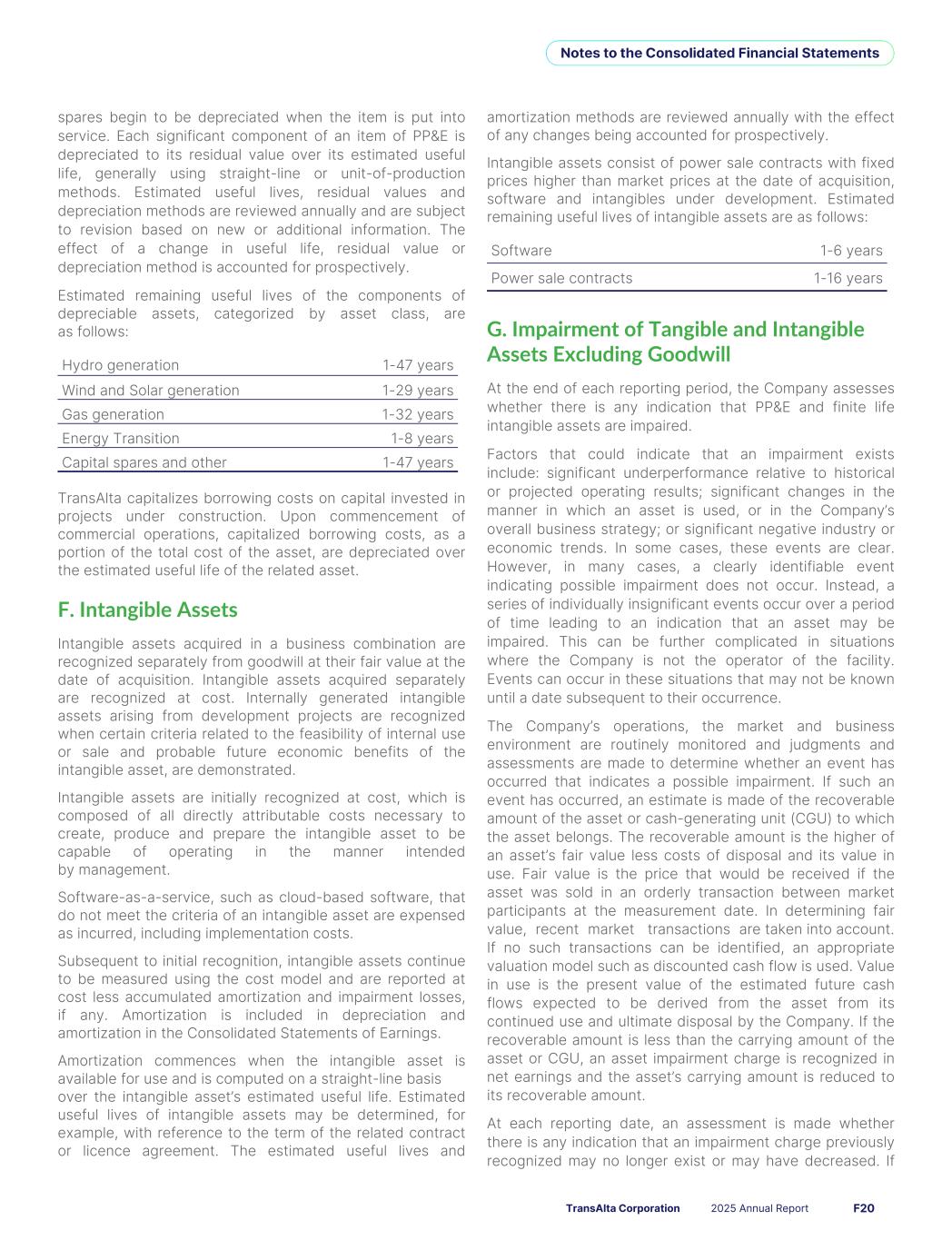 spares begin to be depreciated when the item is put into service. Each significant component of an item of PP&E is depreciated to its residual value over its estimated useful life, generally using straight-line or unit-of-production methods. Estimated useful lives, residual values and depreciation methods are reviewed annually and are subject to revision based on new or additional information. The effect of a change in useful life, residual value or depreciation method is accounted for prospectively. Estimated remaining useful lives of the components of depreciable assets, categorized by asset class, are as follows: Hydro generation 1-47 years Wind and Solar generation 1-29 years Gas generation 1-32 years Energy Transition 1-8 years Capital spares and other 1-47 years TransAlta capitalizes borrowing costs on capital invested in projects under construction. Upon commencement of commercial operations, capitalized borrowing costs, as a portion of the total cost of the asset, are depreciated over the estimated useful life of the related asset. F. Intangible Assets Intangible assets acquired in a business combination are recognized separately from goodwill at their fair value at the date of acquisition. Intangible assets acquired separately are recognized at cost. Internally generated intangible assets arising from development projects are recognized when certain criteria related to the feasibility of internal use or sale and probable future economic benefits of the intangible asset, are demonstrated. Intangible assets are initially recognized at cost, which is composed of all directly attributable costs necessary to create, produce and prepare the intangible asset to be capable of operating in the manner intended by management. Software-as-a-service, such as cloud-based software, that do not meet the criteria of an intangible asset are expensed as incurred, including implementation costs. Subsequent to initial recognition, intangible assets continue to be measured using the cost model and are reported at cost less accumulated amortization and impairment losses, if any. Amortization is included in depreciation and amortization in the Consolidated Statements of Earnings. Amortization commences when the intangible asset is available for use and is computed on a straight-line basis over the intangible asset’s estimated useful life. Estimated useful lives of intangible assets may be determined, for example, with reference to the term of the related contract or licence agreement. The estimated useful lives and amortization methods are reviewed annually with the effect of any changes being accounted for prospectively. Intangible assets consist of power sale contracts with fixed prices higher than market prices at the date of acquisition, software and intangibles under development. Estimated remaining useful lives of intangible assets are as follows: Software 1-6 years Power sale contracts 1-16 years G. Impairment of Tangible and Intangible Assets Excluding Goodwill At the end of each reporting period, the Company assesses whether there is any indication that PP&E and finite life intangible assets are impaired. Factors that could indicate that an impairment exists include: significant underperformance relative to historical or projected operating results; significant changes in the manner in which an asset is used, or in the Company’s overall business strategy; or significant negative industry or economic trends. In some cases, these events are clear. However, in many cases, a clearly identifiable event indicating possible impairment does not occur. Instead, a series of individually insignificant events occur over a period of time leading to an indication that an asset may be impaired. This can be further complicated in situations where the Company is not the operator of the facility. Events can occur in these situations that may not be known until a date subsequent to their occurrence. The Company’s operations, the market and business environment are routinely monitored and judgments and assessments are made to determine whether an event has occurred that indicates a possible impairment. If such an event has occurred, an estimate is made of the recoverable amount of the asset or cash-generating unit (CGU) to which the asset belongs. The recoverable amount is the higher of an asset’s fair value less costs of disposal and its value in use. Fair value is the price that would be received if the asset was sold in an orderly transaction between market participants at the measurement date. In determining fair   value,   recent   market   transactions   are taken into account. If no such transactions can be identified, an appropriate valuation model such as discounted cash flow is used. Value in use is the present value of the estimated future cash flows expected to be derived from the asset from its continued use and ultimate disposal by the Company. If the recoverable amount is less than the carrying amount of the asset or CGU, an asset impairment charge is recognized in net earnings and the asset’s carrying amount is reduced to its recoverable amount. At each reporting date, an assessment is made whether there is any indication that an impairment charge previously recognized may no longer exist or may have decreased. If TransAlta Corporation 2025 Annual Report F20