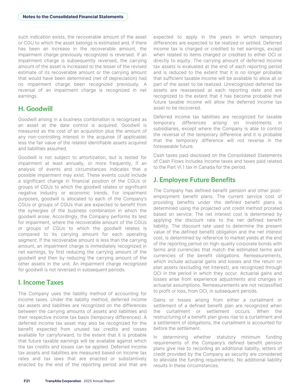 such indication exists, the recoverable amount of the asset or CGU to which the asset belongs is estimated and, if there has been an increase in the recoverable amount, the impairment charge previously recognized is reversed. If an impairment charge is subsequently reversed, the carrying amount of the asset is increased to the lesser of the revised estimate of its recoverable amount or the carrying amount that would have been determined (net of depreciation) had no impairment charge been recognized previously. A reversal of an impairment charge is recognized in net earnings.  H. Goodwill Goodwill arising in a business combination is recognized as an asset at the date control is acquired. Goodwill is measured as the cost of an acquisition plus the amount of any non-controlling interest in the acquiree (if applicable) less the fair value of the related identifiable assets acquired and liabilities assumed. Goodwill is not subject to amortization, but is tested for impairment at least annually, or more frequently, if an analysis of events and circumstances indicates that a possible impairment may exist. These events could include a significant change in financial position of the CGUs or groups of CGUs to which the goodwill relates or significant negative industry or economic trends. For impairment purposes, goodwill is allocated to each of the Company’s CGUs or groups of CGUs that are expected to benefit from the synergies of the business combination in which the goodwill arose. Accordingly, the Company performs its test for impairment, where the recoverable amount of the CGUs or groups of CGUs to which the goodwill relates is compared to its carrying amount for each operating segment. If the recoverable amount is less than the carrying amount, an impairment charge is immediately recognized in net earnings, by first reducing the carrying amount of the goodwill and then by reducing the carrying amount of the other assets in the unit. An impairment charge recognized for goodwill is not reversed in subsequent periods. I. Income Taxes The Company uses the liability method of accounting for income taxes. Under the liability method, deferred income tax assets and liabilities are recognized on the differences between the carrying amounts of assets and liabilities and their respective income tax basis (temporary differences). A deferred income tax asset may also be recognized for the benefit expected from unused tax credits and losses available for carryforward, to the extent that it is probable that future taxable earnings will be available against which the tax credits and losses can be applied. Deferred income tax assets and liabilities are measured based on income tax rates and tax laws that are enacted or substantively enacted by the end of the reporting period and that are expected to apply in the years in which temporary differences are expected to be realized or settled. Deferred income tax is charged or credited to net earnings, except when related to items charged or credited to either OCI or directly to equity. The carrying amount of deferred income tax assets is evaluated at the end of each reporting period and is reduced to the extent that it is no longer probable that sufficient taxable income will be available to allow all or part of the asset to be realized. Unrecognized deferred tax assets are reassessed at each reporting date and are recognized to the extent that it has become probable that future taxable income will allow the deferred income tax asset to be recovered. Deferred income tax liabilities are recognized for taxable temporary differences arising on investments in subsidiaries, except where the Company is able to control the reversal of the temporary difference and it is probable that the temporary difference will not reverse in the foreseeable future.  Cash taxes paid disclosed on the Consolidated Statements of Cash Flows includes income taxes and taxes paid related to the Part VI.1 tax in Canada for the period. J. Employee Future Benefits The Company has defined benefit pension and other post- employment benefit plans. The current service cost of providing benefits under the defined benefit plans is determined using the projected unit credit method prorated based on service. The net interest cost is determined by applying the discount rate to the net defined benefit liability.  The discount rate used to determine the present value of the defined benefit obligation and the net interest cost, is determined by reference to market yields at the end of the reporting period on high-quality corporate bonds with terms and currencies that match the estimated terms and currencies of the benefit obligations. Remeasurements, which include actuarial gains and losses and the return on plan assets (excluding net interest), are recognized through OCI in the period in which they occur. Actuarial gains and losses arise from experience adjustments and changes in actuarial assumptions. Remeasurements are not reclassified to profit or loss, from OCI, in subsequent periods. Gains or losses arising from either a curtailment or settlement of a defined benefit plan are recognized when the curtailment or settlement occurs.  When the restructuring of a benefit plan gives rise to a curtailment and a settlement of obligations, the curtailment is accounted for before the settlement. In determining whether statutory minimum funding requirements of the Company’s defined benefit pension plans give rise to recording an additional liability, letters of credit provided by the Company as security are considered to alleviate the funding requirements. No additional liability results in these circumstances. F21 TransAlta Corporation 2025 Annual Report