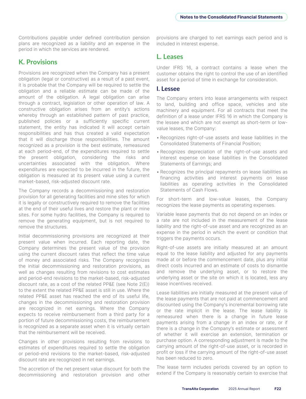 Contributions payable under defined contribution pension plans are recognized as a liability and an expense in the period in which the services are rendered. K. Provisions Provisions are recognized when the Company has a present obligation (legal or constructive) as a result of a past event, it is probable that the Company will be required to settle the obligation and a reliable estimate can be made of the amount of the obligation. A legal obligation can arise through a contract, legislation or other operation of law. A constructive obligation arises from an entity’s actions whereby through an established pattern of past practice, published policies or a sufficiently specific current statement, the entity has indicated it will accept certain responsibilities and has thus created a valid expectation that it will discharge those responsibilities. The amount recognized as a provision is the best estimate, remeasured at each period-end, of the expenditures required to settle the present obligation, considering the risks and uncertainties associated with the obligation. Where expenditures are expected to be incurred in the future, the obligation is measured at its present value using a current market-based, risk-adjusted discount rate. The Company records a decommissioning and restoration provision for all generating facilities and mine sites for which it is legally or constructively required to remove the facilities at the end of their useful lives and restore the plant or mine sites. For some hydro facilities, the Company is required to remove the generating equipment, but is not required to remove the structures. Initial decommissioning provisions are recognized at their present value when incurred. Each reporting date, the Company determines the present value of the provision using the current discount rates that reflect the time value of money and associated risks. The Company recognizes the initial decommissioning and restoration provisions, as well as changes resulting from revisions to cost estimates and period-end revisions to the market-based, risk-adjusted discount rate, as a cost of the related PP&E (see Note 2(E)) to the extent the related PP&E asset is still in use. Where the related PP&E asset has reached the end of its useful life, changes in the decommissioning and restoration provision are recognized in net earnings. Where the Company expects to receive reimbursement from a third party for a portion of future decommissioning costs, the reimbursement is recognized as a separate asset when it is virtually certain that the reimbursement will be received. Changes in other provisions resulting from revisions to estimates of expenditures required to settle the obligation or period-end revisions to the market-based, risk-adjusted discount rate are recognized in net earnings. The accretion of the net present value discount for both the decommissioning and restoration provision and other provisions are charged to net earnings each period and is included in interest expense. L. Leases Under IFRS 16, a contract contains a lease when the customer obtains the right to control the use of an identified asset for a period of time in exchange for consideration. I. Lessee The Company enters into lease arrangements with respect to land, building and office space, vehicles and site machinery and equipment. For all contracts that meet the definition of a lease under IFRS 16 in which the Company is the lessee and which are not exempt as short-term or low- value leases, the Company: • Recognizes right-of-use assets and lease liabilities in the Consolidated Statements of Financial Position; • Recognizes depreciation of the right-of-use assets and interest expense on lease liabilities in the Consolidated Statements of Earnings; and • Recognizes the principal repayments on lease liabilities as financing activities and interest payments on lease liabilities as operating activities in the Consolidated Statements of Cash Flows. For short-term and low-value leases, the Company recognizes the lease payments as operating expenses. Variable lease payments that do not depend on an index or a rate are not included in the measurement of the lease liability and the right-of-use asset and are recognized as an expense in the period in which the event or condition that triggers the payments occurs. Right-of-use assets are initially measured at an amount equal to the lease liability and adjusted for any payments made at or before the commencement date, plus any initial direct costs incurred and an estimate of costs to dismantle and remove the underlying asset, or to restore the underlying asset or the site on which it is located, less any lease incentives received. Lease liabilities are initially measured at the present value of the lease payments that are not paid at commencement and discounted using the Company's incremental borrowing rate or the rate implicit in the lease. The lease liability is remeasured when there is a change in future lease payments arising from a change in an index or rate, or if there is a change in the Company’s estimate or assessment of whether it will exercise an extension, termination or purchase option. A corresponding adjustment is made to the carrying amount of the right-of-use asset, or is recorded in profit or loss if the carrying amount of the right-of-use asset has been reduced to zero. The lease term includes periods covered by an option to extend if the Company is reasonably certain to exercise that TransAlta Corporation 2025 Annual Report F22