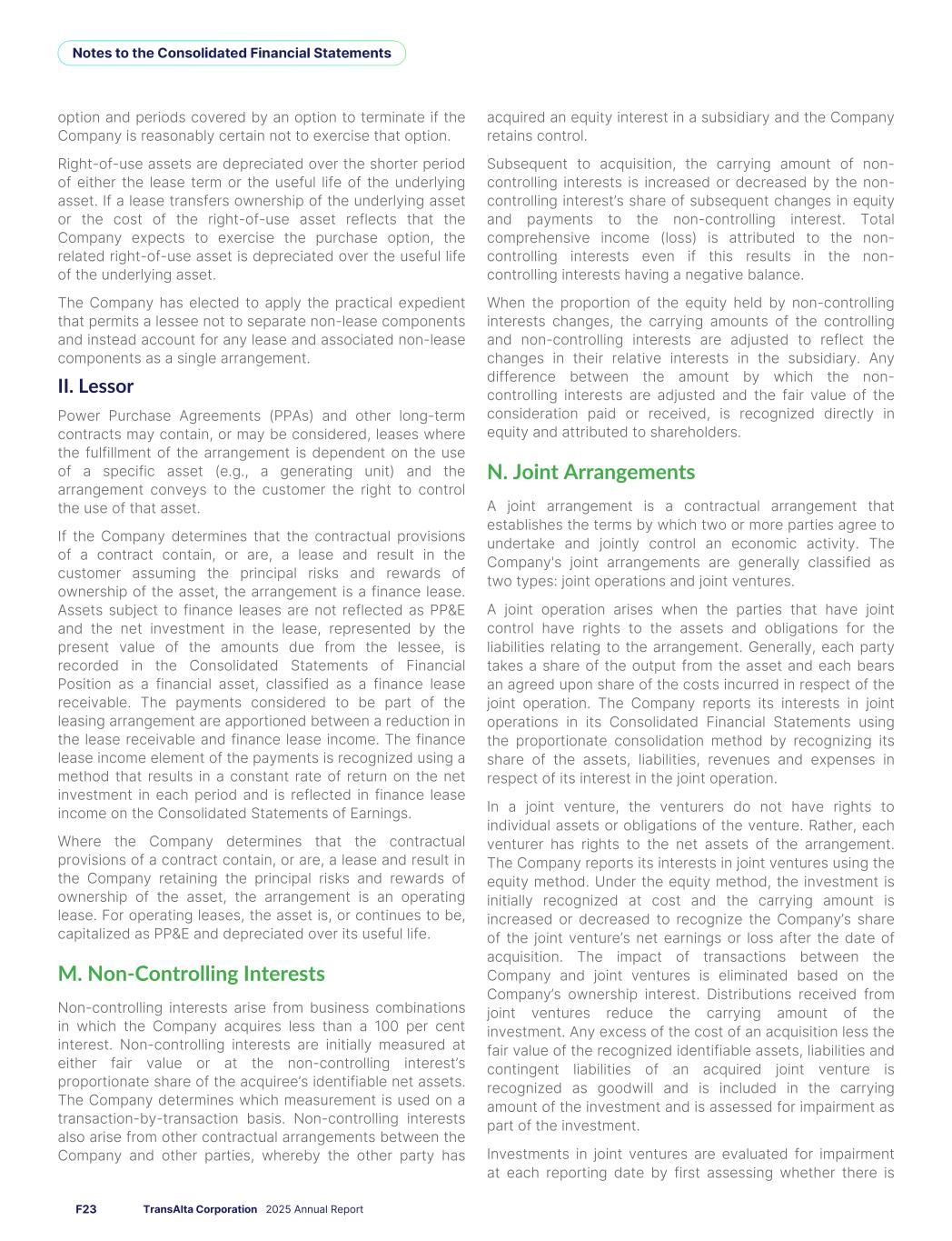 option and periods covered by an option to terminate if the Company is reasonably certain not to exercise that option. Right-of-use assets are depreciated over the shorter period of either the lease term or the useful life of the underlying asset. If a lease transfers ownership of the underlying asset or the cost of the right-of-use asset reflects that the Company expects to exercise the purchase option, the related right-of-use asset is depreciated over the useful life of the underlying asset. The Company has elected to apply the practical expedient that permits a lessee not to separate non-lease components and instead account for any lease and associated non-lease components as a single arrangement. II. Lessor Power Purchase Agreements (PPAs) and other long-term contracts may contain, or may be considered, leases where the fulfillment of the arrangement is dependent on the use of a specific asset (e.g., a generating unit) and the arrangement conveys to the customer the right to control the use of that asset. If the Company determines that the contractual provisions of a contract contain, or are, a lease and result in the customer assuming the principal risks and rewards of ownership of the asset, the arrangement is a finance lease. Assets subject to finance leases are not reflected as PP&E and the net investment in the lease, represented by the present value of the amounts due from the lessee, is recorded in the Consolidated Statements of Financial Position as a financial asset, classified as a finance lease receivable. The payments considered to be part of the leasing arrangement are apportioned between a reduction in the lease receivable and finance lease income. The finance lease income element of the payments is recognized using a method that results in a constant rate of return on the net investment in each period and is reflected in finance lease income on the Consolidated Statements of Earnings. Where the Company determines that the contractual provisions of a contract contain, or are, a lease and result in the Company retaining the principal risks and rewards of ownership of the asset, the arrangement is an operating lease. For operating leases, the asset is, or continues to be, capitalized as PP&E and depreciated over its useful life. M. Non-Controlling Interests Non-controlling interests arise from business combinations in which the Company acquires less than a 100 per cent interest. Non-controlling interests are initially measured at either fair value or at the non-controlling interest’s proportionate share of the acquiree’s identifiable net assets. The Company determines which measurement is used on a transaction-by-transaction basis. Non-controlling interests also arise from other contractual arrangements between the Company and other parties, whereby the other party has acquired an equity interest in a subsidiary and the Company retains control. Subsequent to acquisition, the carrying amount of non- controlling interests is increased or decreased by the non- controlling interest’s share of subsequent changes in equity and payments to the non-controlling interest. Total comprehensive income (loss) is attributed to the non- controlling interests even if this results in the non- controlling interests having a negative balance. When the proportion of the equity held by non-controlling interests changes, the carrying amounts of the controlling and non-controlling interests are adjusted to reflect the changes in their relative interests in the subsidiary. Any difference between the amount by which the non- controlling interests are adjusted and the fair value of the consideration paid or received, is recognized directly in equity and attributed to shareholders. N. Joint Arrangements A joint arrangement is a contractual arrangement that establishes the terms by which two or more parties agree to undertake and jointly control an economic activity. The Company's joint arrangements are generally classified as two types: joint operations and joint ventures. A joint operation arises when the parties that have joint control have rights to the assets and obligations for the liabilities relating to the arrangement. Generally, each party takes a share of the output from the asset and each bears an agreed upon share of the costs incurred in respect of the joint operation. The Company reports its interests in joint operations in its Consolidated Financial Statements using the proportionate consolidation method by recognizing its share of the assets, liabilities, revenues and expenses in respect of its interest in the joint operation. In a joint venture, the venturers do not have rights to individual assets or obligations of the venture. Rather, each venturer has rights to the net assets of the arrangement. The Company reports its interests in joint ventures using the equity method. Under the equity method, the investment is initially recognized at cost and the carrying amount is increased or decreased to recognize the Company’s share of the joint venture’s net earnings or loss after the date of acquisition. The impact of transactions between the Company and joint ventures is eliminated based on the Company’s ownership interest. Distributions received from joint ventures reduce the carrying amount of the investment. Any excess of the cost of an acquisition less the fair value of the recognized identifiable assets, liabilities and contingent liabilities of an acquired joint venture is recognized as goodwill and is included in the carrying amount of the investment and is assessed for impairment as part of the investment. Investments in joint ventures are evaluated for impairment at each reporting date by first assessing whether there is F23 TransAlta Corporation 2025 Annual Report