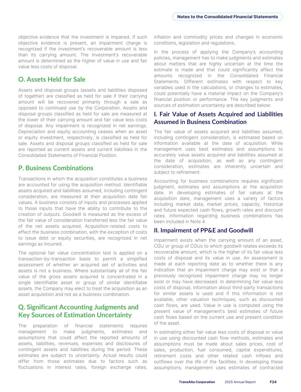 objective evidence that the investment is impaired. If such objective evidence is present, an impairment charge is recognized if the investment’s recoverable amount is less than its carrying amount. The investment’s recoverable amount is determined as the higher of value in use and fair value less costs of disposal. O. Assets Held for Sale Assets and disposal groups (assets and liabilities disposed of together) are classified as held for sale if their carrying amount will be recovered primarily through a sale as opposed to continued use by the Corporation. Assets and disposal groups classified as held for sale are measured at the lower of their carrying amount and fair value less costs of disposal. Any impairment is recognized in net earnings. Depreciation and equity accounting ceases when an asset or equity investment, respectively, is classified as held for sale. Assets and disposal groups classified as held for sale are reported as current assets and current liabilities in the Consolidated Statements of Financial Position. P. Business Combinations Transactions in which the acquisition constitutes a business are accounted for using the acquisition method. Identifiable assets acquired and liabilities assumed, including contingent consideration, are measured at their acquisition date fair values. A business consists of inputs and processes applied to those inputs that have the ability to contribute to the creation of outputs. Goodwill is measured as the excess of the fair value of consideration transferred less the fair value of the net assets acquired. Acquisition-related costs to effect the business combination, with the exception of costs to issue debt or equity securities, are recognized in net earnings as incurred. The optional fair value concentration test is applied on a transaction-by-transaction basis to permit a simplified assessment of whether an acquired set of activities and assets is not a business. Where substantially all of the fair value of the gross assets acquired is concentrated in a single identifiable asset or group of similar identifiable assets, the Company may elect to treat the acquisition as an asset acquisition and not as a business combination. Q. Significant Accounting Judgments and Key Sources of Estimation Uncertainty The preparation of financial statements requires management to make judgments, estimates and assumptions that could affect the reported amounts of assets, liabilities, revenues, expenses and disclosures of contingent assets and liabilities during the period. These estimates are subject to uncertainty. Actual results could differ from those estimates due to factors such as fluctuations in interest rates, foreign exchange rates, inflation and commodity prices and changes in economic conditions, legislation and regulations. In the process of applying the Company’s accounting policies, management has to make judgments and estimates about matters that are highly uncertain at the time the estimate is made and that could significantly affect the amounts recognized in the Consolidated Financial Statements. Different estimates with respect to key variables used in the calculations, or changes to estimates, could potentially have a material impact on the Company’s financial position or performance. The key judgments and sources of estimation uncertainty are described below: I. Fair Value of Assets Acquired and Liabilities Assumed in Business Combination The fair value of assets acquired and liabilities assumed, including contingent consideration, is estimated based on information available at the date of acquisition. While management uses best estimates and assumptions to accurately value assets acquired and liabilities assumed at the date of acquisition, as well as any contingent consideration, estimates are inherently uncertain and subject to refinement. Accounting for business combinations requires significant judgment, estimates and assumptions at the acquisition date. In developing estimates of fair values at the acquisition date, management uses a variety of factors including market data, market prices, capacity, historical and future expected cash flows, growth rates and discount rates. Information regarding business combinations has been included in Note 4. II. Impairment of PP&E and Goodwill Impairment exists when the carrying amount of an asset, CGU or group of CGUs to which goodwill relates exceeds its recoverable amount, which is the higher of its fair value less costs of disposal and its value in use. An assessment is made at each reporting date as to whether there is any indication that an impairment charge may exist or that a previously recognized impairment charge may no longer exist or may have decreased. In determining fair value less costs of disposal, information about third-party transactions for similar assets is used and if this information is not available, other valuation techniques, such as discounted cash flows, are used. Value in use is computed using the present value of management’s best estimates of future cash flows based on the current use and present condition of the asset. In estimating either fair value less costs of disposal or value in use using discounted cash flow methods, estimates and assumptions must be made about sales prices, cost of sales, production, fuel consumed, capital expenditures, retirement costs and other related cash inflows and outflows over the life of the facilities. In developing these assumptions, management uses estimates of contracted TransAlta Corporation 2025 Annual Report F24