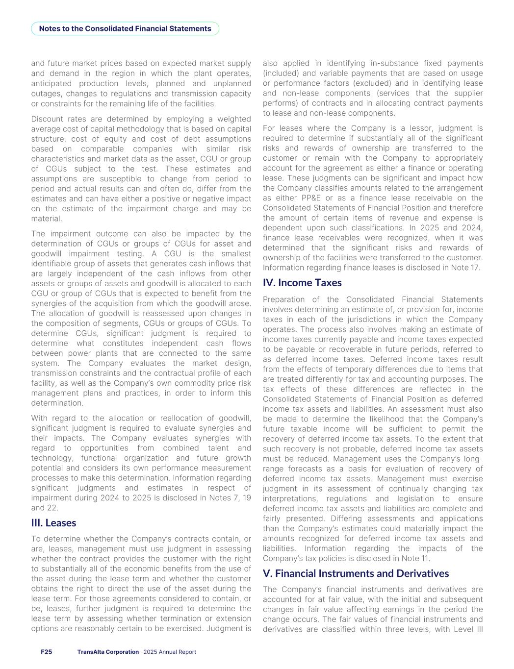 and future market prices based on expected market supply and demand in the region in which the plant operates, anticipated production levels, planned and unplanned outages, changes to regulations and transmission capacity or constraints for the remaining life of the facilities. Discount rates are determined by employing a weighted average cost of capital methodology that is based on capital structure, cost of equity and cost of debt assumptions based on comparable companies with similar risk characteristics and market data as the asset, CGU or group of CGUs subject to the test.  These estimates and assumptions are susceptible to change from period to period and actual results can and often do, differ from the estimates and can have either a positive or negative impact on the estimate of the impairment charge and may be material. The impairment outcome can also be impacted by the determination of CGUs or groups of CGUs for asset and goodwill impairment testing. A CGU is the smallest identifiable group of assets that generates cash inflows that are largely independent of the cash inflows from other assets or groups of assets and goodwill is allocated to each CGU or group of CGUs that is expected to benefit from the synergies of the acquisition from which the goodwill arose. The allocation of goodwill is reassessed upon changes in the composition of segments, CGUs or groups of CGUs. To determine CGUs, significant judgment is required to determine what constitutes independent cash flows between power plants that are connected to the same system. The Company evaluates the market design, transmission constraints and the contractual profile of each facility, as well as the Company’s own commodity price risk management plans and practices, in order to inform this determination. With regard to the allocation or reallocation of goodwill, significant judgment is required to evaluate synergies and their impacts. The Company evaluates synergies with regard to opportunities from combined talent and technology,  functional organization and future growth potential and considers its own performance measurement processes to make this determination. Information regarding significant judgments and estimates in respect of impairment during 2024 to 2025 is disclosed in Notes 7, 19 and 22. III. Leases To determine whether the Company’s contracts contain, or are, leases, management must use judgment in assessing whether the contract provides the customer with the right to substantially all of the economic benefits from the use of the asset during the lease term and whether the customer obtains the right to direct the use of the asset during the lease term. For those agreements considered to contain, or be, leases, further judgment is required to determine the lease term by assessing whether termination or extension options are reasonably certain to be exercised. Judgment is also applied in identifying in-substance fixed payments (included) and variable payments that are based on usage or performance factors (excluded) and in identifying lease and non-lease components (services that the supplier performs) of contracts and in allocating contract payments to lease and non-lease components. For leases where the Company is a lessor, judgment is required to determine if substantially all of the significant risks and rewards of ownership are transferred to the customer or remain with the Company to appropriately account for the agreement as either a finance or operating lease. These judgments can be significant and impact how the Company classifies amounts related to the arrangement as either PP&E or as a finance lease receivable on the Consolidated Statements of Financial Position and therefore the amount of certain items of revenue and expense is dependent upon such  classifications. In 2025 and 2024, finance lease receivables were recognized, when it was determined that the significant risks and rewards of ownership of the facilities were transferred to the customer. Information regarding finance leases is disclosed in Note 17. IV. Income Taxes Preparation of the Consolidated Financial Statements involves determining an estimate of, or provision for, income taxes in each of the jurisdictions in which the Company operates. The process also involves making an estimate of income taxes currently payable and income taxes expected to be payable or recoverable in future periods, referred to as deferred income taxes. Deferred income taxes result from the effects of temporary differences due to items that are treated differently for tax and accounting purposes. The tax effects of these differences are reflected in the Consolidated Statements of Financial Position as deferred income tax assets and liabilities. An assessment must also be made to determine the likelihood that the Company’s future taxable income will be sufficient to permit the recovery of deferred income tax assets. To the extent that such recovery is not probable, deferred income tax assets must be reduced. Management uses the Company’s long- range forecasts as a basis for evaluation of recovery of deferred income tax assets. Management must exercise judgment in its assessment of continually changing tax interpretations, regulations and legislation to ensure deferred income tax assets and liabilities are complete and fairly presented. Differing assessments and applications than the Company’s estimates could materially impact the amounts recognized for deferred income tax assets and liabilities. Information regarding the impacts of the Company’s tax policies is disclosed in Note 11. V. Financial Instruments and Derivatives The Company’s financial instruments and derivatives are accounted for at fair value, with the initial and subsequent changes in fair value affecting earnings in the period the change occurs. The fair values of financial instruments and derivatives are classified within three levels, with Level III F25 TransAlta Corporation 2