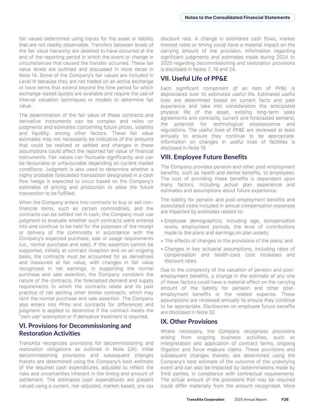 fair values determined using inputs for the asset or liability that are not readily observable. Transfers between levels of the fair value hierarchy are deemed to have occurred at the end of the reporting period in which the event or change in circumstances that caused the transfer occurred. These fair value levels are outlined and discussed in more detail in Note 14. Some of the Company’s fair values are included in Level III because they are not traded on an active exchange or have terms that extend beyond the time period for which exchange-based quotes are available and require the use of internal valuation techniques or models to determine fair value. The determination of the fair value of these contracts and derivative instruments can be complex and relies on judgments and estimates concerning future prices, volatility and liquidity, among other factors. These fair value estimates may not necessarily be indicative of the amounts that could be realized or settled and changes in these assumptions could affect the reported fair value of financial instruments. Fair values can fluctuate significantly and can be favourable or unfavourable depending on current market conditions. Judgment is also used to determine whether a highly probable forecasted transaction designated in a cash flow hedge is expected to occur based on the Company’s estimates of pricing and production to allow the future transaction to be fulfilled. When the Company enters into contracts to buy or sell non- financial items, such as certain commodities, and the contracts can be settled net in cash, the Company must use judgment to evaluate whether such contracts were entered into and continue to be held for the purposes of the receipt or delivery of the commodity in accordance with the Company's expected purchase, sale or usage requirements (i.e., normal purchase and sale). If this assertion cannot be supported, initially at contract inception and on an ongoing basis, the contracts must be accounted for as derivatives and measured at fair value, with changes in fair value recognized in net earnings. In supporting the normal purchase and sale assertion, the Company considers the nature of the contracts, the forecasted demand and supply requirements to which the contracts relate and its past practice of net settling other similar contracts, which may taint the normal purchase and sale assertion. The Company also enters into PPAs and contracts for differences and judgment is applied to determine if the contract meets the "own use" exemption or if derivative treatment is required. VI. Provisions for Decommissioning and Restoration Activities TransAlta recognizes provisions for decommissioning and restoration obligations as outlined in Note 2(K). Initial decommissioning provisions and subsequent changes thereto are determined using the Company’s best estimate of the required cash expenditures, adjusted to reflect the risks and uncertainties inherent in the timing and amount of settlement. The estimated cash expenditures are present valued using a current, risk-adjusted, market-based, pre-tax discount rate. A change in estimated cash flows, market interest rates or timing could have a material impact on the carrying amount of the provision. Information regarding significant judgments and estimates made during 2024 to 2025 regarding decommissioning and restoration provisions is disclosed in Notes 7, 19 and 24. VII. Useful Life of PP&E Each significant component of an item of PP&E is depreciated over its estimated useful life. Estimated useful lives are determined based on current facts and past experience and take into consideration the anticipated physical life of the asset, existing long-term sales agreements and contracts, current and forecasted demand, the potential for technological obsolescence and regulations. The useful lives of PP&E are reviewed at least annually to ensure they continue to be appropriate. Information on changes in useful lives of facilities is disclosed in Note 19. VIII. Employee Future Benefits The Company provides pension and other post-employment benefits, such as health and dental benefits, to employees. The cost of providing these benefits is dependent upon many factors, including actual plan experience and estimates and assumptions about future experience. The liability for pension and post-employment benefits and associated costs included in annual compensation expenses are impacted by estimates related to:  • Employee demographics, including age, compensation levels, employment periods, the level of contributions made to the plans and earnings on plan assets; • The effects of changes to the provisions of the plans; and • Changes in key actuarial assumptions, including rates of compensation and health-care cost increases and discount rates. Due to the complexity of the valuation of pension and post- employment benefits, a change in the estimate of any one of these factors could have a material effect on the carrying amount of the liability for pension and other post- employment benefits or the related expense. These assumptions are reviewed annually to ensure they continue to be appropriate. Disclosures on employee future benefits are disclosed in Note 32. IX. Other Provisions Where necessary, the Company recognizes provisions arising from ongoing business activities, such as interpretation and application of contract terms, ongoing litigation and force majeure claims. These provisions and subsequent changes thereto, are determined using the Company’s best estimate of the outcome of the underlying event and can also be impacted by determinations made by third parties, in compliance with contractual requirements. The actual amount of the provisions that may be required could differ materially from the amount recognized. More TransAlta Corporation 2025 Annual Report F26