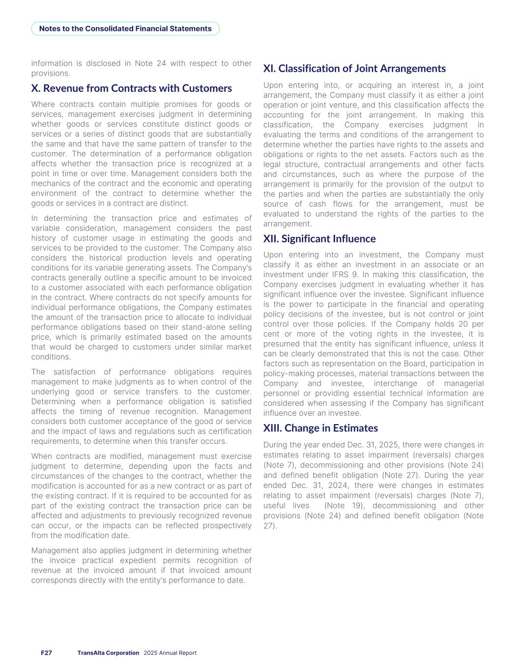 information is disclosed in Note 24 with respect to other provisions. X. Revenue from Contracts with Customers Where contracts contain multiple promises for goods or services, management exercises judgment in determining whether goods or services constitute distinct goods or services or a series of distinct goods that are substantially the same and that have the same pattern of transfer to the customer. The determination of a performance obligation affects whether the transaction price is recognized at a point in time or over time. Management considers both the mechanics of the contract and the economic and operating environment of the contract to determine whether the goods or services in a contract are distinct. In determining the transaction price and estimates of variable consideration, management considers the past history of customer usage in estimating the goods and services to be provided to the customer. The Company also considers the historical production levels and operating conditions for its variable generating assets. The Company’s contracts generally outline a specific amount to be invoiced to a customer associated with each performance obligation in the contract. Where contracts do not specify amounts for individual performance obligations, the Company estimates the amount of the transaction price to allocate to individual performance obligations based on their stand-alone selling price, which is primarily estimated based on the amounts that would be charged to customers under similar market conditions. The satisfaction of performance obligations requires management to make judgments as to when control of the underlying good or service transfers to the customer. Determining when a performance obligation is satisfied affects   the   timing   of   revenue   recognition.   Management considers both customer acceptance of the good or service and the impact of laws and regulations such as certification requirements, to determine when this transfer occurs. When contracts are modified, management must exercise judgment to determine, depending upon the facts and circumstances of the changes to the contract, whether the modification is accounted for as a new contract or as part of the existing contract. If it is required to be accounted for as part of the existing contract the transaction price can be affected and adjustments to previously recognized revenue can occur, or the impacts can be reflected prospectively from the modification date. Management also applies judgment in determining whether the invoice practical expedient permits recognition of revenue at the invoiced amount if that invoiced amount corresponds directly with the entity's performance to date. XI. Classification of Joint Arrangements Upon entering into, or acquiring an interest in, a joint arrangement, the Company must classify it as either a joint operation or joint venture, and this classification affects the accounting for the joint arrangement. In making this classification, the Company exercises judgment in evaluating the terms and conditions of the arrangement to determine whether the parties have rights to the assets and obligations or rights to the net assets. Factors such as the legal structure, contractual arrangements and other facts and circumstances, such as where the purpose of the arrangement is primarily for the provision of the output to the parties and when the parties are substantially the only source of cash flows for the arrangement, must be evaluated to understand the rights of the parties to the arrangement. XII. Significant Influence Upon entering into an investment, the Company must classify it as either an investment in an associate or an investment under IFRS 9. In making this classification, the Company exercises judgment in evaluating whether it has significant influence over the investee. Significant influence is the power to participate in the financial and operating policy decisions of the investee, but is not control or joint control over those policies. If the Company holds 20 per cent or more of the voting rights in the investee, it is presumed that the entity has significant influence, unless it can be clearly demonstrated that this is not the case. Other factors such as representation on the Board, participation in policy-making processes, material transactions between the Company and investee, interchange of managerial personnel or providing essential technical information are considered when assessing if the Company has significant influence over an investee. XIII. Change in Estimates During the year ended Dec. 31, 2025, there were changes in estimates relating to asset impairment (reversals) charges (Note 7), decommissioning and other provisions (Note 24) and defined benefit obligation (Note 27). During the year ended Dec. 31, 2024, there were changes in estimates relating to asset impairment (reversals) charges (Note 7), useful lives (Note 19), decommissioning and other provisions (Note 24) and defined benefit obligation (Note 27). F27 TransAlta Corporation 2025 Annual Report