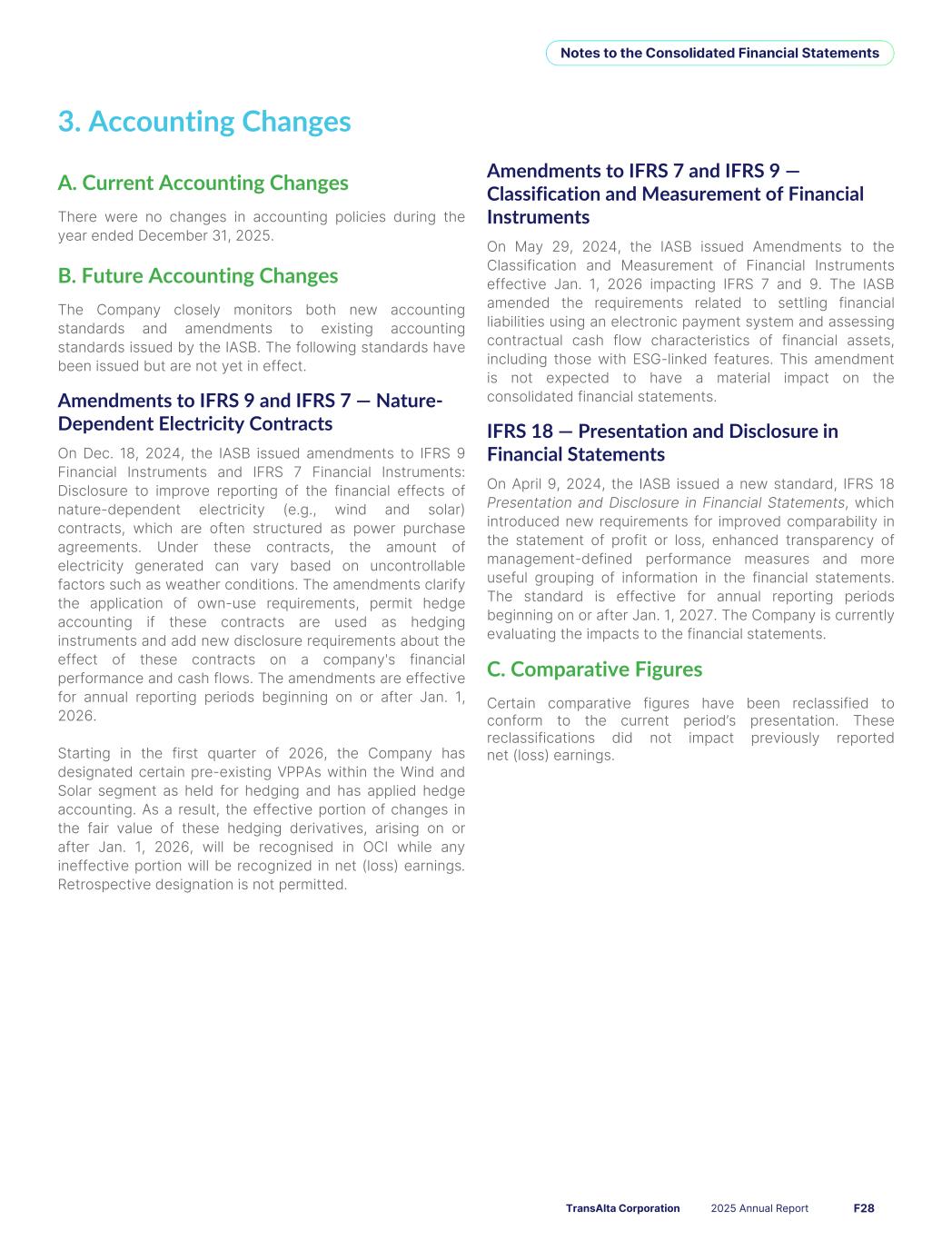 3. Accounting Changes A. Current Accounting Changes There were no changes in accounting policies during the year ended December 31, 2025. B. Future Accounting Changes The Company closely monitors both new accounting standards and amendments to existing accounting standards issued by the IASB. The following standards have been issued but are not yet in effect. Amendments to IFRS 9 and IFRS 7 — Nature- Dependent Electricity Contracts On Dec. 18, 2024, the IASB issued amendments to IFRS 9 Financial Instruments and IFRS 7 Financial Instruments: Disclosure to improve reporting of the financial effects of nature-dependent electricity (e.g., wind and solar) contracts, which are often structured as power purchase agreements. Under these contracts, the amount of electricity generated can vary based on uncontrollable factors such as weather conditions. The amendments clarify the application of own-use requirements, permit hedge accounting if these contracts are used as hedging instruments and add new disclosure requirements about the effect of these contracts on a company's financial performance and cash flows. The amendments are effective for annual reporting periods beginning on or after Jan. 1, 2026. Starting in the first quarter of 2026, the Company has designated certain pre-existing VPPAs within the Wind and Solar segment as held for hedging and has applied hedge accounting. As a result, the effective portion of changes in the fair value of these hedging derivatives, arising on or after Jan. 1, 2026, will be recognised in OCI while any ineffective portion will be recognized in net (loss) earnings. Retrospective designation is not permitted. Amendments to IFRS 7 and IFRS 9 — Classification and Measurement of Financial Instruments On May 29, 2024, the IASB issued Amendments to the Classification and Measurement of Financial Instruments effective Jan. 1, 2026 impacting IFRS 7 and 9. The IASB amended the requirements related to settling financial liabilities using an electronic payment system and assessing contractual cash flow characteristics of financial assets, including those with ESG-linked features. This amendment is not expected to have a material impact on the consolidated financial statements. IFRS 18 — Presentation and Disclosure in Financial Statements On April 9, 2024, the IASB issued a new standard, IFRS 18 Presentation and Disclosure in Financial Statements, which introduced new requirements for improved comparability in the statement of profit or loss, enhanced transparency of management-defined performance measures and more useful grouping of information in the financial statements. The standard is effective for annual reporting periods beginning on or after Jan. 1, 2027. The Company is currently evaluating the impacts to the financial statements. C. Comparative Figures Certain comparative figures have been reclassified to conform to the current period’s presentation. These reclassifications did not impact previously reported net (loss) earnings. TransAlta Corporation 2025 Annual Report F28