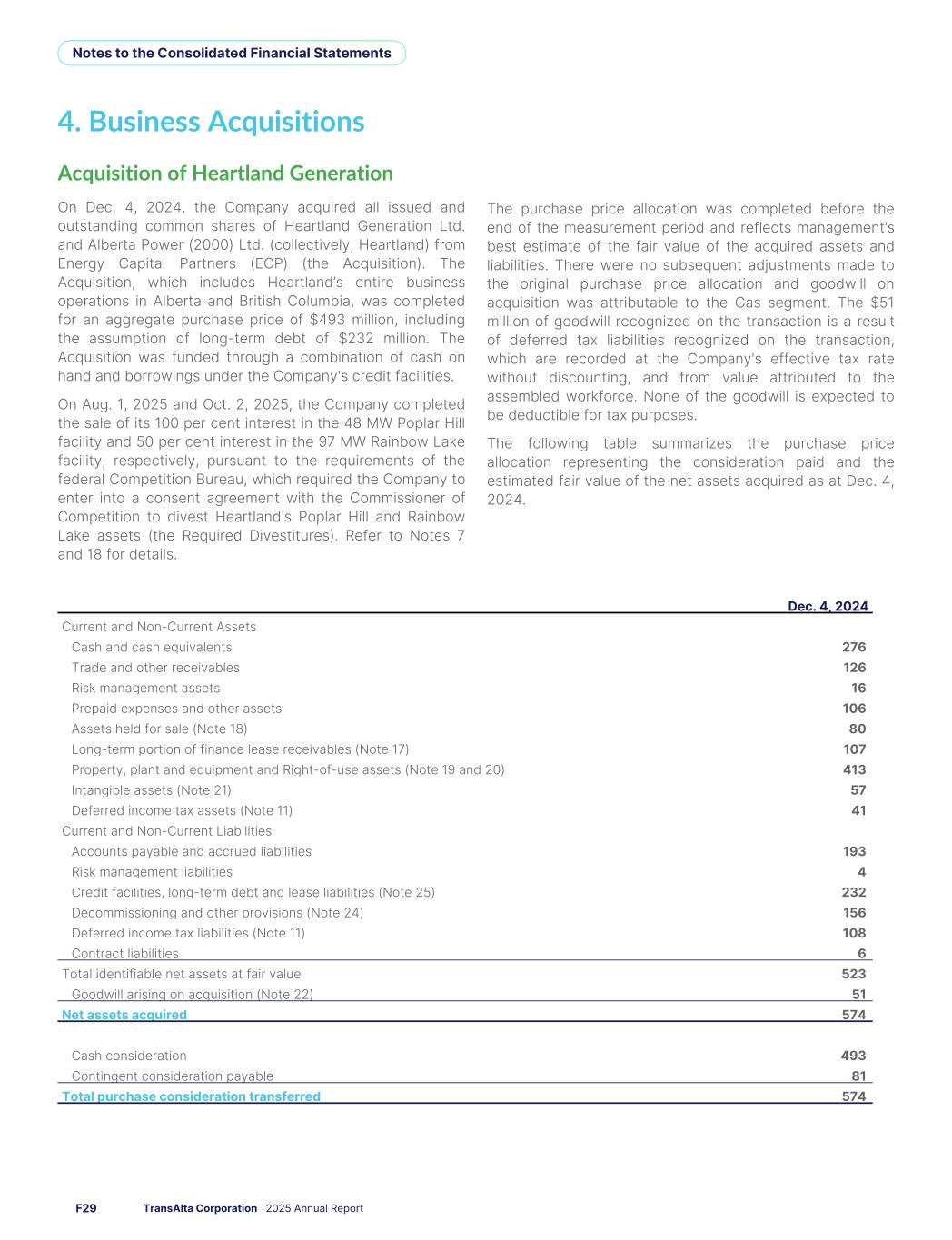 4. Business Acquisitions Acquisition of Heartland Generation On Dec. 4, 2024, the Company acquired all issued and outstanding common shares of Heartland Generation Ltd. and Alberta Power (2000) Ltd. (collectively, Heartland) from Energy Capital Partners (ECP) (the Acquisition). The Acquisition, which includes Heartland’s entire business operations in Alberta and British Columbia, was completed for an aggregate purchase price of $493 million, including the assumption of long-term debt of $232 million. The Acquisition was funded through a combination of cash on hand and borrowings under the Company's credit facilities. On Aug. 1, 2025 and Oct. 2, 2025, the Company completed the sale of its 100 per cent interest in the 48 MW Poplar Hill facility and 50 per cent interest in the 97 MW Rainbow Lake facility, respectively, pursuant to the requirements of the federal Competition Bureau, which required the Company to enter into a consent agreement with the Commissioner of Competition to divest Heartland's Poplar Hill and Rainbow Lake assets (the Required Divestitures). Refer to Notes 7 and 18 for details. The purchase price allocation was completed before the end of the measurement period and reflects management’s best estimate of the fair value of the acquired assets and liabilities. There were no subsequent adjustments made to the original purchase price allocation and goodwill on acquisition was attributable to the Gas segment. The $51 million of goodwill recognized on the transaction is a result of deferred tax liabilities recognized on the transaction, which are recorded at the Company's effective tax rate without discounting, and from value attributed to the assembled workforce. None of the goodwill is expected to be deductible for tax purposes. The following table summarizes the purchase price allocation representing the consideration paid and the estimated fair value of the net assets acquired as at Dec. 4, 2024. Dec. 4, 2024 Current and Non-Current Assets Cash and cash equivalents 276 Trade and other receivables 126 Risk management assets 16 Prepaid expenses and other assets 106 Assets held for sale (Note 18) 80 Long-term portion of finance lease receivables (Note 17) 107 Property, plant and equipment and Right-of-use assets (Note 19 and 20) 413 Intangible assets (Note 21) 57 Deferred income tax assets (Note 11) 41 Current and Non-Current Liabilities Accounts payable and accrued liabilities 193 Risk management liabilities 4 Credit facilities, long-term debt and lease liabilities (Note 25) 232 Decommissioning and other provisions (Note 24) 156 Deferred income tax liabilities (Note 11) 108 Contract liabilities 6 Total identifiable net assets at fair value 523 Goodwill arising on acquisition (Note 22) 51 Net assets acquired 574 Cash consideration 493 Contingent consideration payable 81 Total purchase consideration transferred 574 F29 TransAlta Corporation 2025 Annual Report