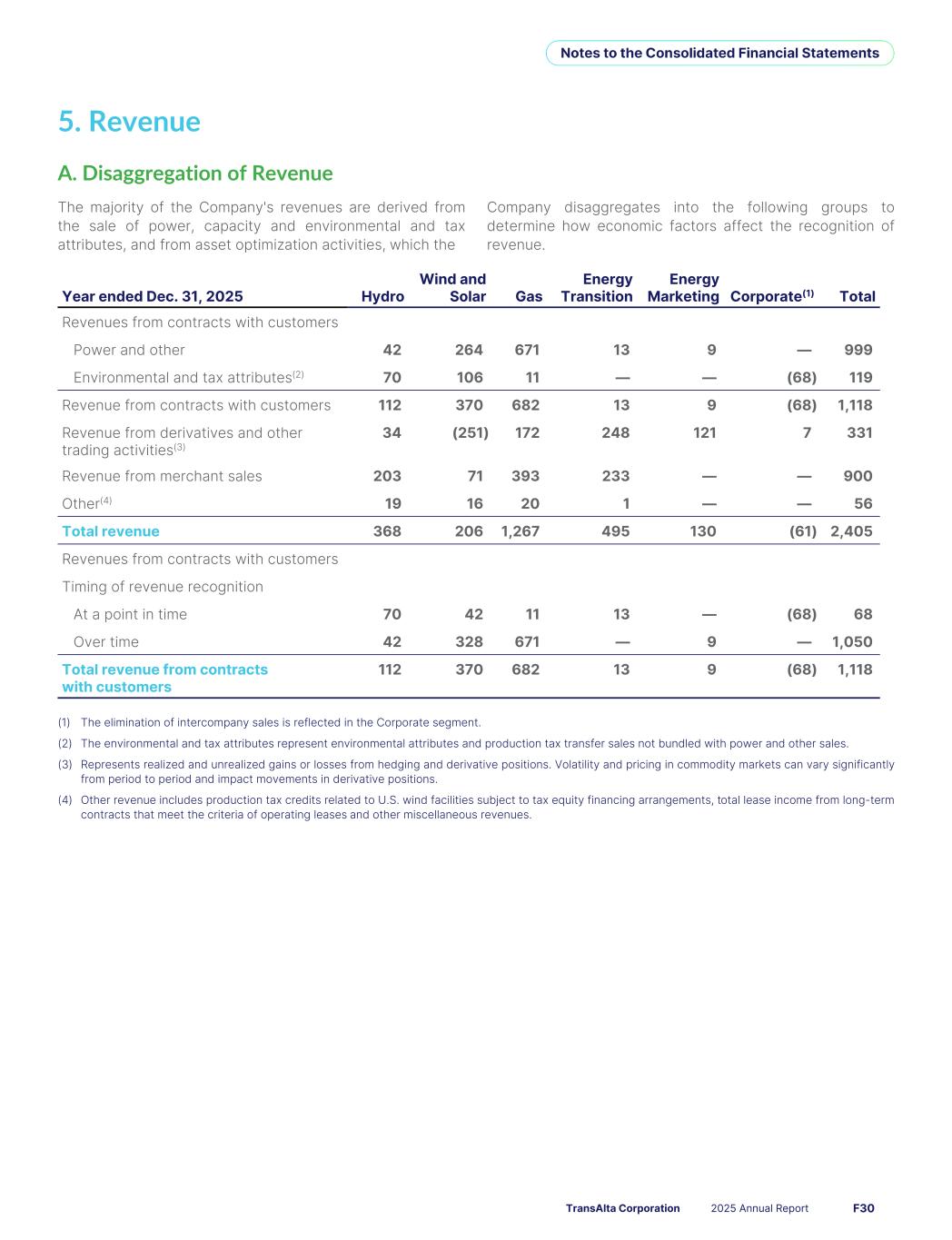 5. Revenue A. Disaggregation of Revenue The majority of the Company's revenues are derived from the sale of power, capacity and environmental and tax attributes, and from asset optimization activities, which the Company disaggregates into the following groups to determine how economic factors affect the recognition of revenue. Year ended Dec. 31, 2025 Hydro Wind and Solar Gas Energy Transition Energy Marketing Corporate(1) Total Revenues from contracts with customers Power and other 42 264 671 13 9 — 999 Environmental and tax attributes(2) 70 106 11 — — (68) 119 Revenue from contracts with customers 112 370 682 13 9 (68) 1,118 Revenue from derivatives and other trading activities(3) 34 (251) 172 248 121 7 331 Revenue from merchant sales 203 71 393 233 — — 900 Other(4) 19 16 20 1 — — 56 Total revenue 368 206 1,267 495 130 (61) 2,405 Revenues from contracts with customers Timing of revenue recognition At a point in time 70 42 11 13 — (68) 68 Over time 42 328 671 — 9 — 1,050 Total revenue from contracts with customers 112 370 682 13 9 (68) 1,118 (1) The elimination of intercompany sales is reflected in the Corporate segment. (2) The environmental and tax attributes represent environmental attributes and production tax transfer sales not bundled with power and other sales. (3) Represents realized and unrealized gains or losses from hedging and derivative positions. Volatility and pricing in commodity markets can vary significantly from period to period and impact movements in derivative positions. (4) Other revenue includes production tax credits related to U.S. wind facilities subject to tax equity financing arrangements, total lease income from long-term contracts that meet the criteria of operating leases and other miscellaneous revenues. TransAlta Corporation 2025 Annual Report F30