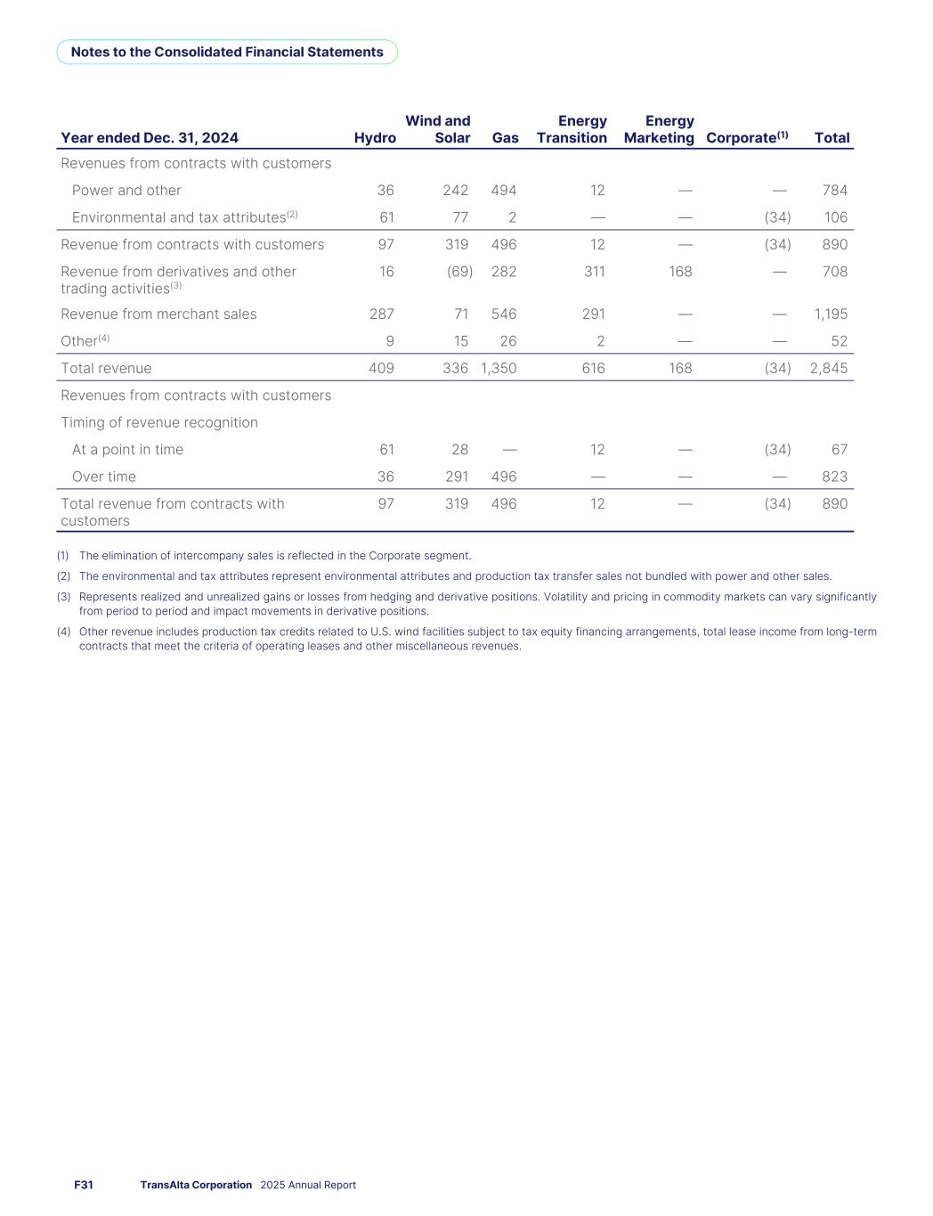Year ended Dec. 31, 2024 Hydro Wind and Solar Gas Energy Transition Energy Marketing Corporate(1) Total Revenues from contracts with customers Power and other 36 242 494 12 — — 784 Environmental and tax attributes(2) 61 77 2 — — (34) 106 Revenue from contracts with customers 97 319 496 12 — (34) 890 Revenue from derivatives and other trading activities(3) 16 (69) 282 311 168 — 708 Revenue from merchant sales 287 71 546 291 — — 1,195 Other(4) 9 15 26 2 — — 52 Total revenue 409 336 1,350 616 168 (34) 2,845 Revenues from contracts with customers Timing of revenue recognition At a point in time 61 28 — 12 — (34) 67 Over time 36 291 496 — — — 823 Total revenue from contracts with customers 97 319 496 12 — (34) 890 (1) The elimination of intercompany sales is reflected in the Corporate segment. (2) The environmental and tax attributes represent environmental attributes and production tax transfer sales not bundled with power and other sales. (3) Represents realized and unrealized gains or losses from hedging and derivative positions. Volatility and pricing in commodity markets can vary significantly from period to period and impact movements in derivative positions. (4) Other revenue includes production tax credits related to U.S. wind facilities subject to tax equity financing arrangements, total lease income from long-term contracts that meet the criteria of operating leases and other miscellaneous revenues. F31 TransAlta Corporation 2025 Annual Report