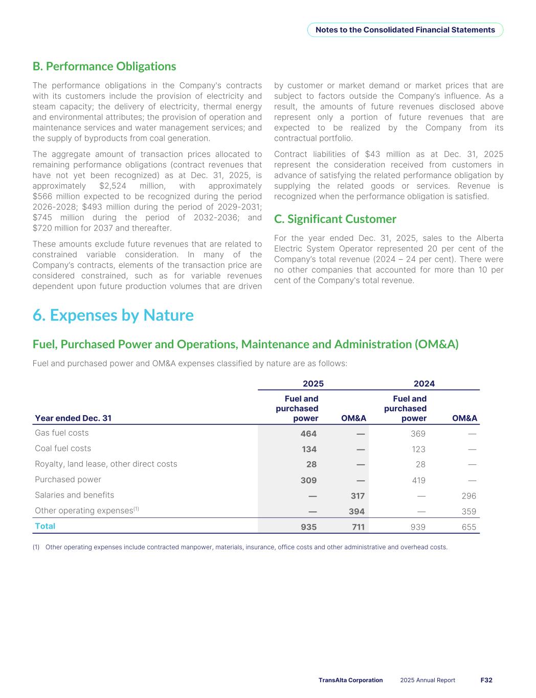 B. Performance Obligations The performance obligations in the Company's contracts with its customers include the provision of electricity and steam capacity; the delivery of electricity, thermal energy and environmental attributes; the provision of operation and maintenance services and water management services; and the supply of byproducts from coal generation. The aggregate amount of transaction prices allocated to remaining performance obligations (contract revenues that have not yet been recognized) as at Dec. 31, 2025, is approximately $2,524  million, with approximately $566  million expected to be recognized during the period 2026-2028; $493  million during the period of 2029-2031; $745  million during the period of 2032-2036; and $720 million for 2037 and thereafter. These amounts exclude future revenues that are related to constrained variable consideration. In many of the Company’s contracts, elements of the transaction price are considered constrained, such as for variable revenues dependent upon future production volumes that are driven by customer or market demand or market prices that are subject to factors outside the Company’s influence. As a result, the amounts of future revenues disclosed above represent only a portion of future revenues that are expected to be realized by the Company from its contractual portfolio. Contract liabilities of $43  million as at Dec. 31, 2025 represent the consideration received from customers in advance of satisfying the related performance obligation by supplying the related goods or services. Revenue is recognized when the performance obligation is satisfied. C. Significant Customer For the year ended Dec. 31, 2025, sales to the Alberta Electric System Operator represented 20 per cent of the Company’s total revenue (2024 – 24 per cent). There were no other companies that accounted for more than 10 per cent of the Company's total revenue. 6. Expenses by Nature Fuel, Purchased Power and Operations, Maintenance and Administration (OM&A) Fuel and purchased power and OM&A expenses classified by nature are as follows: Year ended Dec. 31 2025 2024 Fuel and purchased power OM&A Fuel and purchased power OM&A Gas fuel costs 464 — 369 — Coal fuel costs 134 — 123 — Royalty, land lease, other direct costs 28 — 28 — Purchased power 309 — 419 — Salaries and benefits — 317 — 296 Other operating expenses(1) — 394 — 359 Total 935 711 939 655 (1) Other operating expenses include contracted manpower, materials, insurance, office costs and other administrative and overhead costs. TransAlta Corporation 2025 Annual Report F32