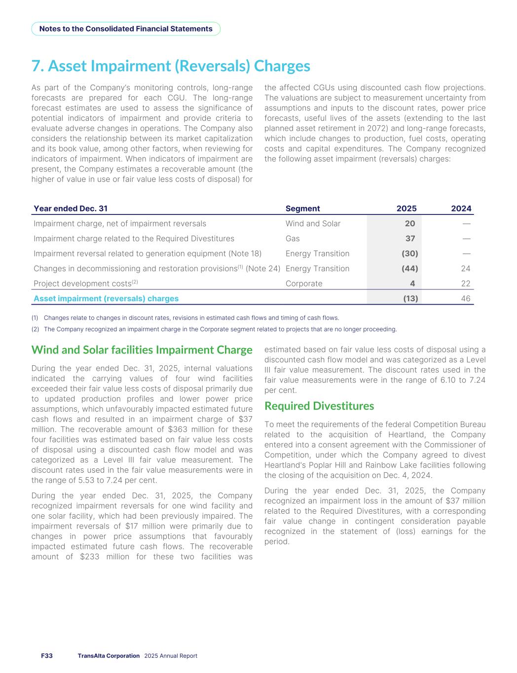 7. Asset Impairment (Reversals) Charges As part of the Company’s monitoring controls, long-range forecasts are prepared for each CGU. The long-range forecast estimates are used to assess the significance of potential indicators of impairment and provide criteria to evaluate adverse changes in operations. The Company also considers the relationship between its market capitalization and its book value, among other factors, when reviewing for indicators of impairment. When indicators of impairment are present, the Company estimates a recoverable amount (the higher of value in use or fair value less costs of disposal) for the affected CGUs using discounted cash flow projections. The valuations are subject to measurement uncertainty from assumptions and inputs to the discount rates, power price forecasts, useful lives of the assets (extending to the last planned asset retirement in 2072) and long-range forecasts, which include changes to production, fuel costs, operating costs and capital expenditures. The Company recognized the following asset impairment (reversals) charges: Year ended Dec. 31 Segment 2025 2024 Impairment charge, net of impairment reversals Wind and Solar 20 — Impairment charge related to the Required Divestitures Gas 37 — Impairment reversal related to generation equipment (Note 18) Energy Transition (30) — Changes in decommissioning and restoration provisions(1) (Note 24) Energy Transition (44) 24 Project development costs(2) Corporate 4 22 Asset impairment (reversals) charges (13) 46 (1) Changes relate to changes in discount rates, revisions in estimated cash flows and timing of cash flows. (2) The Company recognized an impairment charge in the Corporate segment related to projects that are no longer proceeding. Wind and Solar facilities Impairment Charge During the year ended Dec. 31, 2025, internal valuations indicated the carrying values of four wind facilities exceeded their fair value less costs of disposal primarily due to updated production profiles and lower power price assumptions, which unfavourably impacted estimated future cash flows and resulted in an impairment charge of $37 million. The recoverable amount of $363 million for these four facilities was estimated based on fair value less costs of disposal using a discounted cash flow model and was categorized as a Level III fair value measurement. The discount rates used in the fair value measurements were in the range of 5.53 to 7.24 per cent. During the year ended Dec. 31, 2025, the Company recognized impairment reversals for one wind facility and one solar facility, which had been previously impaired. The impairment reversals of $17 million were primarily due to changes in power price assumptions that favourably impacted estimated future cash flows. The recoverable amount of $233 million for these two facilities was estimated based on fair value less costs of disposal using a discounted cash flow model and was categorized as a Level III fair value measurement. The discount rates used in the fair value measurements were in the range of 6.10 to 7.24 per cent. Required Divestitures To meet the requirements of the federal Competition Bureau related to the acquisition of Heartland, the Company entered into a consent agreement with the Commissioner of Competition, under which the Company agreed to divest Heartland's Poplar Hill and Rainbow Lake facilities following the closing of the acquisition on Dec. 4, 2024. During the year ended Dec. 31, 2025, the Company recognized an impairment loss in the amount of $37 million related to the Required Divestitures, with a corresponding fair value change in contingent consideration payable recognized in the statement of (loss) earnings for the period. F33 TransAlta Corporation 2025 Annual Report