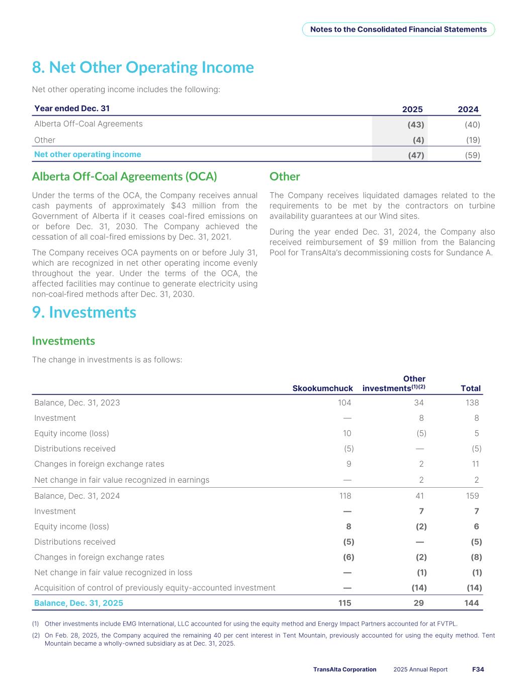 8. Net Other Operating Income Net other operating income includes the following: Year ended Dec. 31 2025 2024 Alberta Off-Coal Agreements (43) (40) Other (4) (19) Net other operating income (47) (59) Alberta Off-Coal Agreements (OCA) Under the terms of the OCA, the Company receives annual cash payments of approximately $43 million from the Government of Alberta if it ceases coal-fired emissions on or before Dec. 31, 2030. The Company achieved the cessation of all coal-fired emissions by Dec. 31, 2021. The Company receives OCA payments on or before July 31, which are recognized in net other operating income evenly throughout the year. Under the terms of the OCA, the affected facilities may continue to generate electricity using non‑coal‑fired methods after Dec. 31, 2030. Other The Company receives liquidated damages related to the requirements to be met by the contractors on turbine availability guarantees at our Wind sites. During the year ended Dec. 31, 2024, the Company also received reimbursement of $9  million from the Balancing Pool for TransAlta’s decommissioning costs for Sundance A. 9. Investments Investments The change in investments is as follows: Skookumchuck Other investments(1)(2) Total Balance, Dec. 31, 2023 104 34 138 Investment — 8 8 Equity income (loss) 10 (5) 5 Distributions received (5) — (5) Changes in foreign exchange rates 9 2 11 Net change in fair value recognized in earnings — 2 2 Balance, Dec. 31, 2024 118 41 159 Investment — 7 7 Equity income (loss) 8 (2) 6 Distributions received (5) — (5) Changes in foreign exchange rates (6) (2) (8) Net change in fair value recognized in loss — (1) (1) Acquisition of control of previously equity-accounted investment — (14) (14) Balance, Dec. 31, 2025 115 29 144 (1) Other investments include EMG International, LLC accounted for using the equity method and Energy Impact Partners accounted for at FVTPL. (2) On Feb. 28, 2025, the Company acquired the remaining 40 per cent interest in Tent Mountain, previously accounted for using the equity method. Tent Mountain became a wholly-owned subsidiary as at Dec. 31, 2025. TransAlta Corporation 2025 Annual Report F34