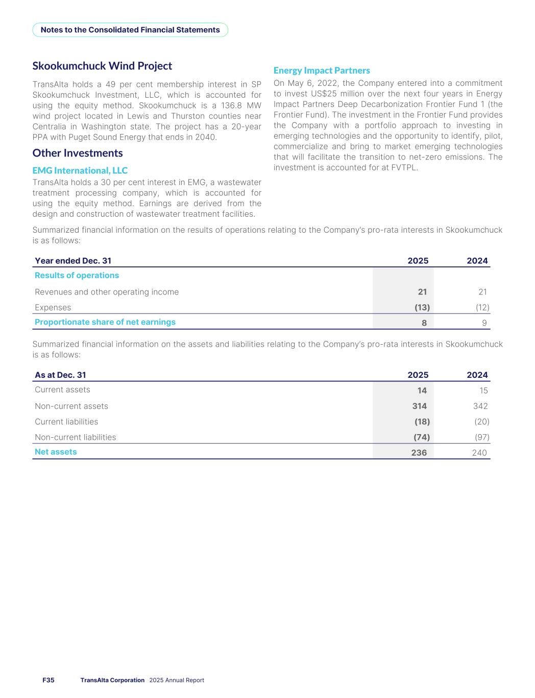 Skookumchuck Wind Project TransAlta holds a 49 per cent membership interest in SP Skookumchuck Investment, LLC, which is accounted for using the equity method. Skookumchuck is a 136.8 MW wind project located in Lewis and Thurston counties near Centralia in Washington state. The project has a 20-year PPA with Puget Sound Energy that ends in 2040. Other Investments EMG International, LLC TransAlta holds a 30 per cent interest in EMG, a wastewater treatment processing company, which is accounted for using the equity method. Earnings are derived from the design and construction of wastewater treatment facilities. Energy Impact Partners On May 6, 2022, the Company entered into a commitment to invest US$25  million over the next four years in Energy Impact Partners Deep Decarbonization Frontier Fund 1 (the Frontier Fund). The investment in the Frontier Fund provides the Company with a portfolio approach to investing in emerging technologies and the opportunity to identify, pilot, commercialize and bring to market emerging technologies that will facilitate the transition to net-zero emissions. The investment is accounted for at FVTPL. Summarized financial information on the results of operations relating to the Company’s pro-rata interests in Skookumchuck is as follows: Year ended Dec. 31 2025 2024 Results of operations Revenues and other operating income 21 21 Expenses (13) (12) Proportionate share of net earnings 8 9 Summarized financial information on the assets and liabilities relating to the Company’s pro-rata interests in Skookumchuck is as follows: As at Dec. 31 2025 2024 Current assets 14 15 Non-current assets 314 342 Current liabilities (18) (20) Non-current liabilities (74) (97) Net assets 236 240 F35 TransAlta Corporation 2025 Annual Report
