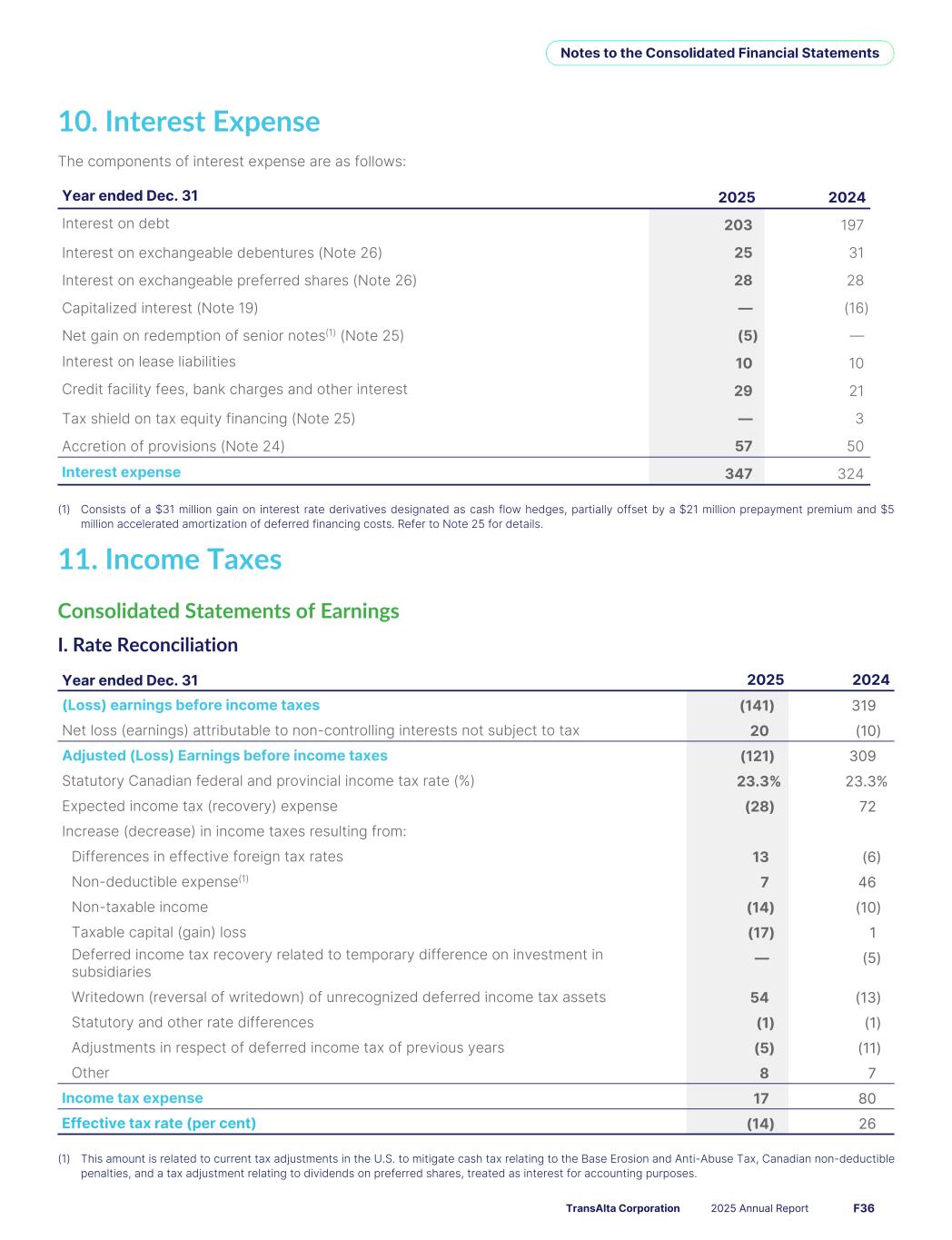 10. Interest Expense The components of interest expense are as follows: Year ended Dec. 31 2025 2024 Interest on debt 203 197 Interest on exchangeable debentures (Note 26) 25 31 Interest on exchangeable preferred shares (Note 26) 28 28 Capitalized interest (Note 19) — (16) Net gain on redemption of senior notes(1) (Note 25) (5) — Interest on lease liabilities 10 10 Credit facility fees, bank charges and other interest 29 21 Tax shield on tax equity financing (Note 25) — 3 Accretion of provisions (Note 24) 57 50 Interest expense 347 324 (1) Consists of a $31 million gain on interest rate derivatives designated as cash flow hedges, partially offset by a $21 million prepayment premium and $5 million accelerated amortization of deferred financing costs. Refer to Note 25 for details. 11. Income Taxes Consolidated Statements of Earnings I. Rate Reconciliation Year ended Dec. 31 2025 2024 (Loss) earnings before income taxes (141) 319 Net loss (earnings) attributable to non-controlling interests not subject to tax 20 (10) Adjusted (Loss) Earnings before income taxes (121) 309 Statutory Canadian federal and provincial income tax rate (%) 23.3% 23.3% Expected income tax (recovery) expense (28) 72 Increase (decrease) in income taxes resulting from: Differences in effective foreign tax rates 13 (6) Non-deductible expense(1) 7 46 Non-taxable income (14) (10) Taxable capital (gain) loss (17) 1 Deferred income tax recovery related to temporary difference on investment in subsidiaries — (5) Writedown (reversal of writedown) of unrecognized deferred income tax assets 54 (13) Statutory and other rate differences (1) (1) Adjustments in respect of deferred income tax of previous years (5) (11) Other 8 7 Income tax expense 17 80 Effective tax rate (per cent) (14) 26 (1) This amount is related to current tax adjustments in the U.S. to mitigate cash tax relating to the Base Erosion and Anti-Abuse Tax, Canadian non-deductible penalties, and a tax adjustment relating to dividends on preferred shares, treated as interest for accounting purposes. TransAlta Corporation 2025 Annual Report F36
