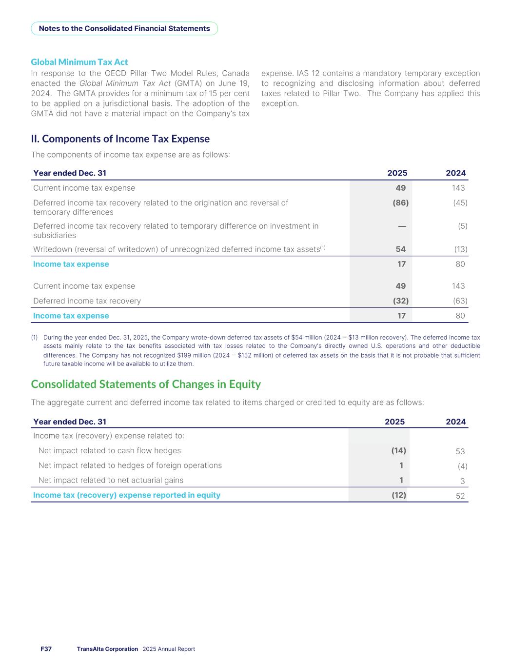Global Minimum Tax Act In response to the OECD Pillar Two Model Rules, Canada enacted the Global Minimum Tax Act (GMTA) on June 19, 2024. The GMTA provides for a minimum tax of 15 per cent to be applied on a jurisdictional basis. The adoption of the GMTA did not have a material impact on the Company’s tax expense. IAS 12 contains a mandatory temporary exception to recognizing and disclosing information about deferred taxes related to Pillar Two. The Company has applied this exception. II. Components of Income Tax Expense The components of income tax expense are as follows: Year ended Dec. 31 2025 2024 Current income tax expense 49 143 Deferred income tax recovery related to the origination and reversal of temporary differences (86) (45) Deferred income tax recovery related to temporary difference on investment in subsidiaries — (5) Writedown (reversal of writedown) of unrecognized deferred income tax assets(1) 54 (13) Income tax expense 17 80 Current income tax expense 49 143 Deferred income tax recovery (32) (63) Income tax expense 17 80 (1) During the year ended Dec. 31, 2025, the Company wrote-down deferred tax assets of $54 million (2024 – $13 million recovery). The deferred income tax assets mainly relate to the tax benefits associated with tax losses related to the Company's directly owned U.S. operations and other deductible differences. The Company has not recognized $199 million (2024 – $152 million) of deferred tax assets on the basis that it is not probable that sufficient future taxable income will be available to utilize them. Consolidated Statements of Changes in Equity The aggregate current and deferred income tax related to items charged or credited to equity are as follows: Year ended Dec. 31 2025 2024 Income tax (recovery) expense related to:     Net impact related to cash flow hedges (14) 53 Net impact related to hedges of foreign operations 1 (4) Net impact related to net actuarial gains 1 3 Income tax (recovery) expense reported in equity (12) 52 F37 TransAlta Corporation 2025 Annual Report