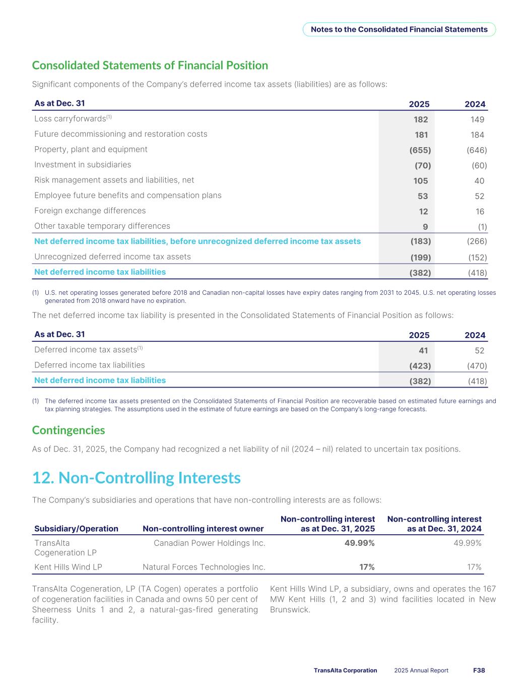 Consolidated Statements of Financial Position Significant components of the Company’s deferred income tax assets (liabilities) are as follows: As at Dec. 31 2025 2024 Loss carryforwards(1) 182 149 Future decommissioning and restoration costs 181 184 Property, plant and equipment (655) (646) Investment in subsidiaries (70) (60) Risk management assets and liabilities, net 105 40 Employee future benefits and compensation plans 53 52 Foreign exchange differences 12 16 Other taxable temporary differences 9 (1) Net deferred income tax liabilities, before unrecognized deferred income tax assets (183) (266) Unrecognized deferred income tax assets (199) (152) Net deferred income tax liabilities (382) (418) (1) U.S. net operating losses generated before 2018 and Canadian non-capital losses have expiry dates ranging from 2031 to 2045. U.S. net operating losses generated from 2018 onward have no expiration. The net deferred income tax liability is presented in the Consolidated Statements of Financial Position as follows: As at Dec. 31 2025 2024 Deferred income tax assets(1) 41 52 Deferred income tax liabilities (423) (470) Net deferred income tax liabilities (382) (418) (1) The deferred income tax assets presented on the Consolidated Statements of Financial Position are recoverable based on estimated future earnings and tax planning strategies. The assumptions used in the estimate of future earnings are based on the Company’s long-range forecasts. Contingencies As of Dec. 31, 2025, the Company had recognized a net liability of nil (2024 – nil) related to uncertain tax positions. 12. Non-Controlling Interests The Company’s subsidiaries and operations that have non-controlling interests are as follows: Subsidiary/Operation Non-controlling interest owner Non-controlling interest as at Dec. 31, 2025 Non-controlling interest as at Dec. 31, 2024 TransAlta Cogeneration LP Canadian Power Holdings Inc. 49.99% 49.99% Kent Hills Wind LP Natural Forces Technologies Inc. 17% 17% TransAlta Cogeneration, LP (TA Cogen) operates a portfolio of cogeneration facilities in Canada and owns 50 per cent of Sheerness Units 1 and 2, a natural-gas-fired generating facility. Kent Hills Wind LP, a subsidiary, owns and operates the 167 MW Kent Hills (1, 2 and 3) wind facilities located in New Brunswick. TransAlta Corporation 2025 Annual Report F38