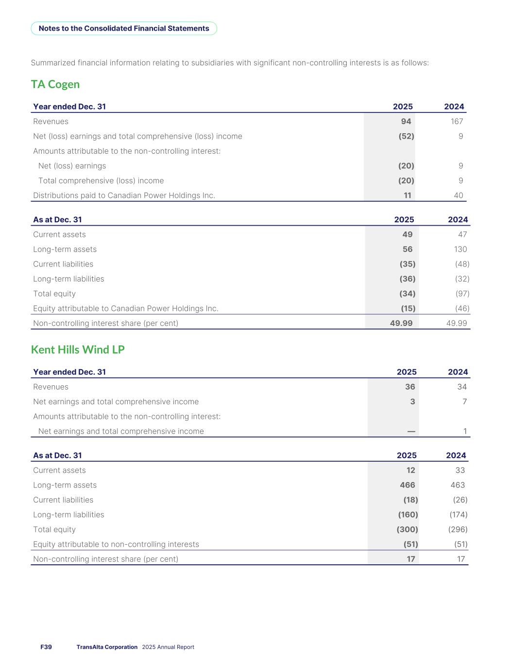 Summarized financial information relating to subsidiaries with significant non-controlling interests is as follows: TA Cogen Year ended Dec. 31 2025 2024 Revenues 94 167 Net (loss) earnings and total comprehensive (loss) income (52) 9 Amounts attributable to the non-controlling interest: Net (loss) earnings (20) 9 Total comprehensive (loss) income (20) 9 Distributions paid to Canadian Power Holdings Inc. 11 40 As at Dec. 31 2025 2024 Current assets 49 47 Long-term assets 56 130 Current liabilities (35) (48) Long-term liabilities (36) (32) Total equity (34) (97) Equity attributable to Canadian Power Holdings Inc. (15) (46) Non-controlling interest share (per cent) 49.99 49.99 Kent Hills Wind LP Year ended Dec. 31 2025 2024 Revenues 36 34 Net earnings and total comprehensive income 3 7 Amounts attributable to the non-controlling interest: Net earnings and total comprehensive income — 1 As at Dec. 31 2025 2024 Current assets 12 33 Long-term assets 466 463 Current liabilities (18) (26) Long-term liabilities (160) (174) Total equity (300) (296) Equity attributable to non-controlling interests (51) (51) Non-controlling interest share (per cent) 17 17 F39 TransAlta Corporation 2025 Annual Report