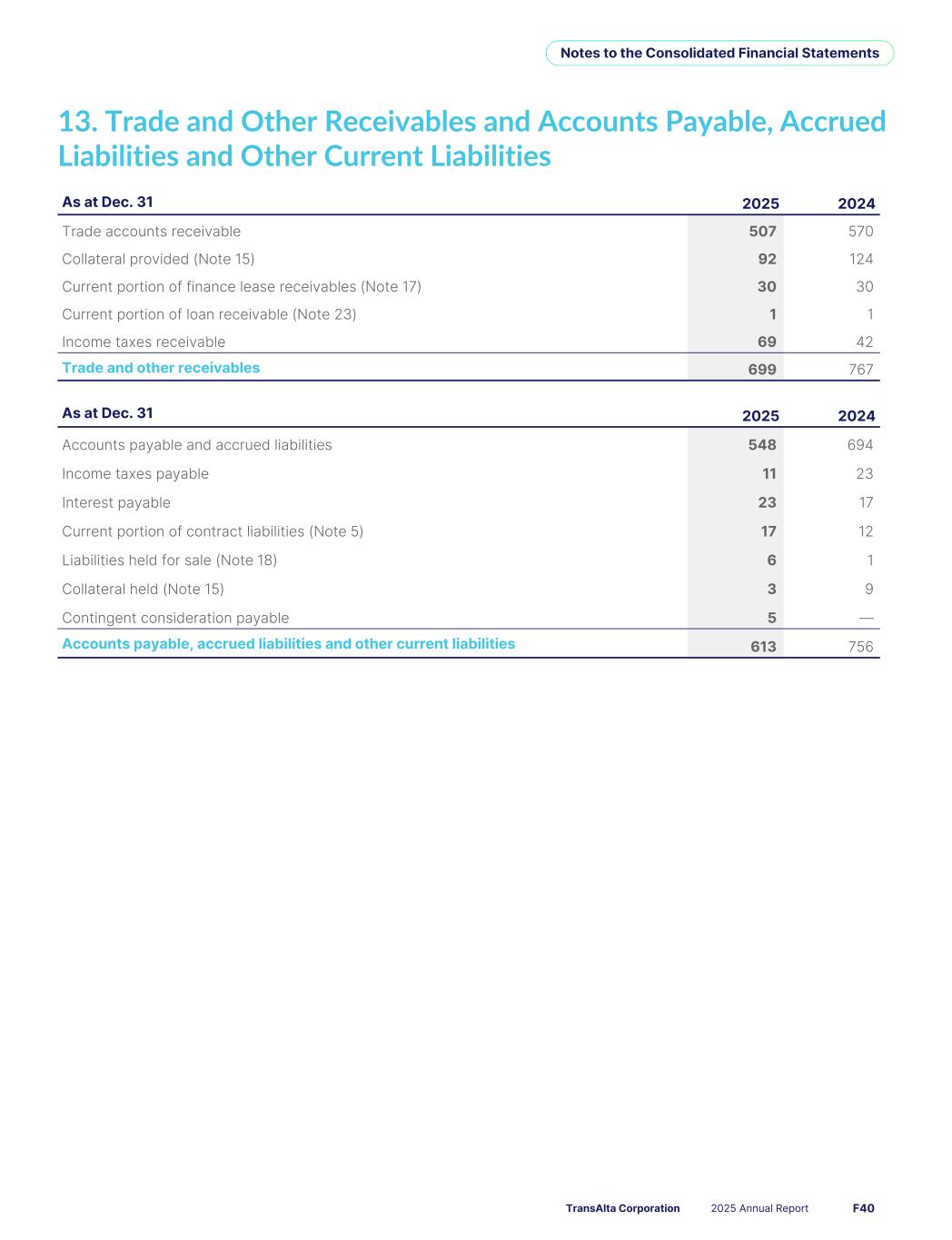 13. Trade and Other Receivables and Accounts Payable, Accrued Liabilities and Other Current Liabilities As at Dec. 31 2025 2024 Trade accounts receivable 507 570 Collateral provided (Note 15) 92 124 Current portion of finance lease receivables (Note 17) 30 30 Current portion of loan receivable (Note 23) 1 1 Income taxes receivable 69 42 Trade and other receivables 699 767 As at Dec. 31 2025 2024 Accounts payable and accrued liabilities 548 694 Income taxes payable 11 23 Interest payable 23 17 Current portion of contract liabilities (Note 5) 17 12 Liabilities held for sale (Note 18) 6 1 Collateral held (Note 15) 3 9 Contingent consideration payable 5 — Accounts payable, accrued liabilities and other current liabilities 613 756 TransAlta Corporation 2025 Annual Report F40