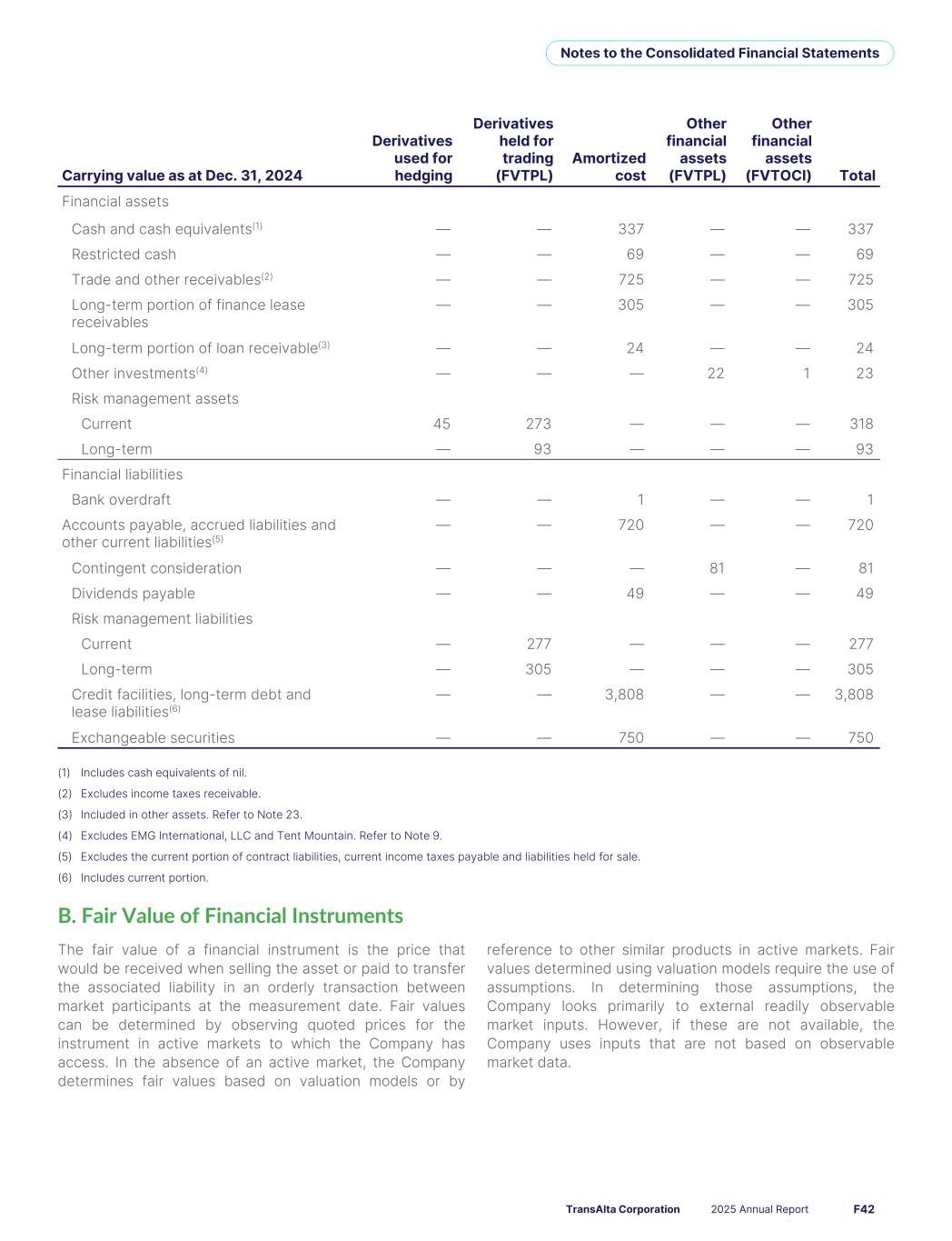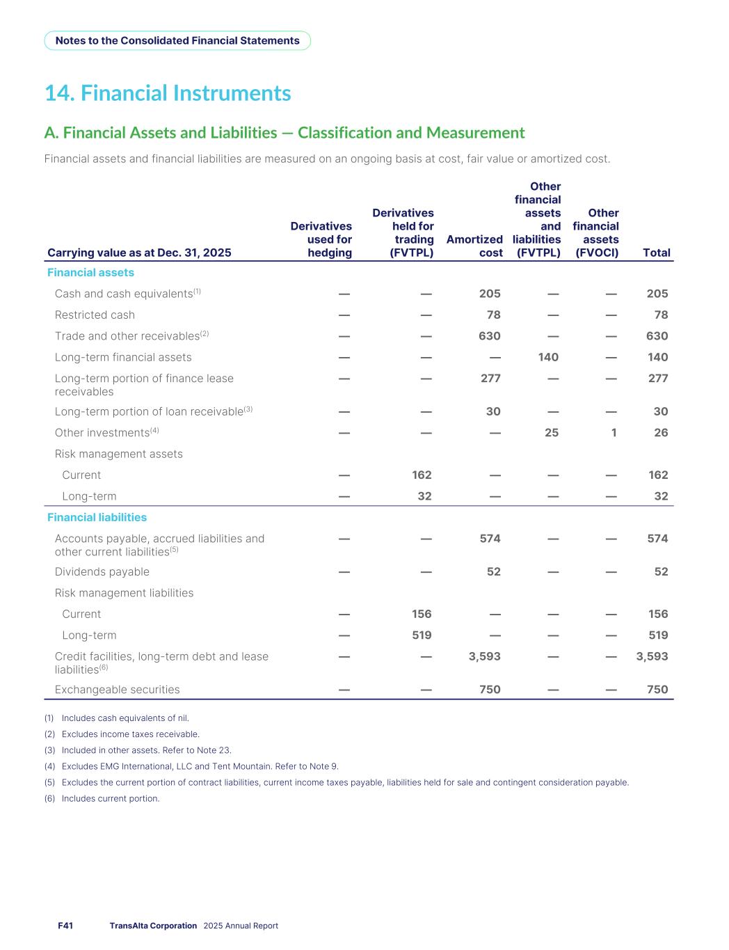 14. Financial Instruments A. Financial Assets and Liabilities — Classification and Measurement Financial assets and financial liabilities are measured on an ongoing basis at cost, fair value or amortized cost. Carrying value as at Dec. 31, 2025 Derivatives used for hedging Derivatives held for trading (FVTPL) Amortized cost Other financial assets and liabilities (FVTPL) Other financial assets (FVOCI) Total Financial assets         Cash and cash equivalents(1) — — 205 — — 205 Restricted cash — — 78 — — 78 Trade and other receivables(2) — — 630 — — 630 Long-term financial assets — — — 140 — 140 Long-term portion of finance lease receivables — — 277 — — 277 Long-term portion of loan receivable(3) — — 30 — — 30 Other investments(4) — — — 25 1 26 Risk management assets         Current — 162 — — — 162 Long-term — 32 — — — 32 Financial liabilities         Accounts payable, accrued liabilities and other current liabilities(5) — — 574 — — 574 Dividends payable — — 52 — — 52 Risk management liabilities       Current — 156 — — — 156 Long-term — 519 — — — 519 Credit facilities, long-term debt and lease liabilities(6) — — 3,593 — — 3,593 Exchangeable securities — — 750 — — 750 (1) Includes cash equivalents of nil. (2) Excludes income taxes receivable. (3) Included in other assets. Refer to Note 23. (4) Excludes EMG International, LLC and Tent Mountain. Refer to Note 9. (5) Excludes the current portion of contract liabilities, current income taxes payable, liabilities held for sale and contingent consideration payable. (6) Includes current portion. F41 TransAlta Corporation 2025 Annual Report