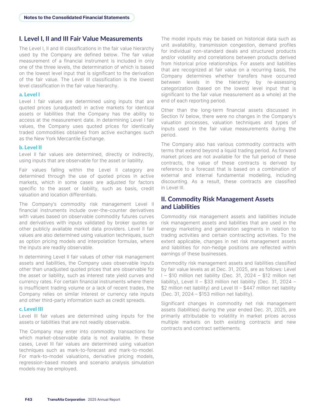I. Level I, II and III Fair Value Measurements The Level I, II and III classifications in the fair value hierarchy used by the Company are defined below. The fair value measurement of a financial instrument is included in only one of the three levels, the determination of which is based on the lowest level input that is significant to the derivation of the fair value. The Level III classification is the lowest level classification in the fair value hierarchy. a. Level I Level I fair values are determined using inputs that are quoted prices (unadjusted) in active markets for identical assets or liabilities that the Company has the ability to access at the measurement date. In determining Level I fair values, the Company uses quoted prices for identically traded commodities obtained from active exchanges such as the New York Mercantile Exchange. b. Level II Level II fair values are determined, directly or indirectly, using inputs that are observable for the asset or liability. Fair values falling within the Level II category are determined through the use of quoted prices in active markets, which in some cases are adjusted for factors specific to the asset or liability, such as basis, credit valuation and location differentials. The Company’s commodity risk management Level II financial instruments include over-the-counter derivatives with values based on observable commodity futures curves and derivatives with inputs validated by broker quotes or other publicly available market data providers. Level II fair values are also determined using valuation techniques, such as option pricing models and interpolation formulas, where the inputs are readily observable. In determining Level II fair values of other risk management assets and liabilities, the Company uses observable inputs other than unadjusted quoted prices that are observable for the asset or liability, such as interest rate yield curves and currency rates. For certain financial instruments where there is insufficient trading volume or a lack of recent trades, the Company relies on similar interest or currency rate inputs and other third-party information such as credit spreads. c. Level III Level III fair values are determined using inputs for the assets or liabilities that are not readily observable. The Company may enter into commodity transactions for which market-observable data is not available. In these cases, Level III fair values are determined using valuation techniques such as mark-to-forecast and mark-to-model. For mark-to-model valuations, derivative pricing models, regression-based models and scenario analysis simulation models may be employed. The model inputs may be based on historical data such as unit availability, transmission congestion, demand profiles for individual non-standard deals and structured products and/or volatility and correlations between products derived from historical price relationships. For assets and liabilities that are recognized at fair value on a recurring basis, the Company determines whether transfers have occurred between levels in the hierarchy by re-assessing categorization (based on the lowest level input that is significant to the fair value measurement as a whole) at the end of each reporting period. Other than the long-term financial assets discussed in Section IV below, there were no changes in the Company's valuation processes, valuation techniques and types of inputs used in the fair value measurements during the period. The Company also has various commodity contracts with terms that extend beyond a liquid trading period. As forward market prices are not available for the full period of these contracts, the value of these contracts is derived by reference to a forecast that is based on a combination of external and internal fundamental modelling, including discounting. As a result, these contracts are classified in Level III. II. Commodity Risk Management Assets and Liabilities Commodity risk management assets and liabilities include risk management assets and liabilities that are used in the energy marketing and generation segments in relation to trading activities and certain contracting activities. To the extent applicable, changes in net risk management assets and liabilities for non-hedge positions are reflected within earnings of these businesses. Commodity risk management assets and liabilities classified by fair value levels as at Dec. 31, 2025, are as follows: Level I – $10 million net liability (Dec. 31, 2024 – $12  million net liability), Level II – $33 million net liability (Dec. 31, 2024 – $2 million net liability) and Level III – $447 million net liability (Dec. 31, 2024 – $153 million net liability). Significant changes in commodity net risk management assets (liabilities) during the year ended Dec. 31, 2025, are primarily attributable to volatility in market prices across multiple markets on both existing contracts and new contracts and contract settlements. F43 TransAlta Corporation 2025 Annual Report