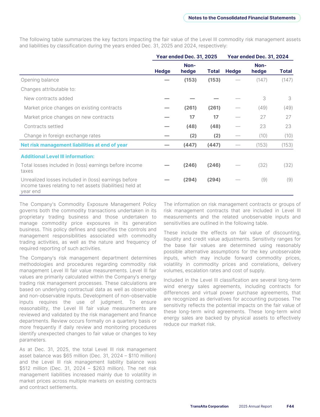 The following table summarizes the key factors impacting the fair value of the Level III commodity risk management assets and liabilities by classification during the years ended Dec. 31, 2025 and 2024, respectively: Year ended Dec. 31, 2025 Year ended Dec. 31, 2024 Hedge Non- hedge Total Hedge Non- hedge Total Opening balance — (153) (153) — (147) (147) Changes attributable to: New contracts added — — — — 3 3 Market price changes on existing contracts — (261) (261) — (49) (49) Market price changes on new contracts — 17 17 — 27 27 Contracts settled — (48) (48) — 23 23 Change in foreign exchange rates — (2) (2) — (10) (10) Net risk management liabilities at end of year — (447) (447) — (153) (153) Additional Level III information: Total losses included in (loss) earnings before income taxes — (246) (246) — (32) (32) Unrealized losses included in (loss) earnings before income taxes relating to net assets (liabilities) held at year end — (294) (294) — (9) (9) The Company's Commodity Exposure Management Policy governs both the commodity transactions undertaken in its proprietary trading business and those undertaken to manage commodity price exposures in its generation business. This policy defines and specifies the controls and management responsibilities associated with commodity trading activities, as well as the nature and frequency of required reporting of such activities.  The Company's risk management department determines methodologies and procedures regarding commodity risk management Level III fair value measurements. Level III fair values are primarily calculated within the Company’s energy trading risk management processes. These calculations are based on underlying contractual data as well as observable and non-observable inputs. Development of non-observable inputs requires the use of judgment. To ensure reasonability, the Level III fair value measurements are reviewed and validated by the risk management and finance departments. Review occurs formally on a quarterly basis or more frequently if daily review and monitoring procedures identify unexpected changes to fair value or changes to key parameters. As at Dec. 31, 2025, the total Level III risk management asset balance was $65 million (Dec. 31, 2024 – $110 million) and the Level III risk management liability balance was $512  million (Dec. 31, 2024 – $263 million). The net risk management liabilities increased mainly due to volatility in market prices across multiple markets on existing contracts and contract settlements. The information on risk management contracts or groups of risk management contracts that are included in Level III measurements and the related unobservable inputs and sensitivities are outlined in the following table. These include the effects on fair value of discounting, liquidity and credit value adjustments. Sensitivity ranges for the base fair values are determined using reasonably possible alternative assumptions for the key unobservable inputs, which may include forward commodity prices, volatility in commodity prices and correlations, delivery volumes, escalation rates and cost of supply. Included in the Level III classification are several long-term wind energy sales agreements, including contracts for differences and virtual power purchase agreements, that are recognized as derivatives for accounting purposes. The sensitivity reflects the potential impacts on the fair value of these long-term wind agreements. These long-term wind energy sales are backed by physical assets to effectively reduce our market risk. TransAlta Corporation 2025 Annual Report F44