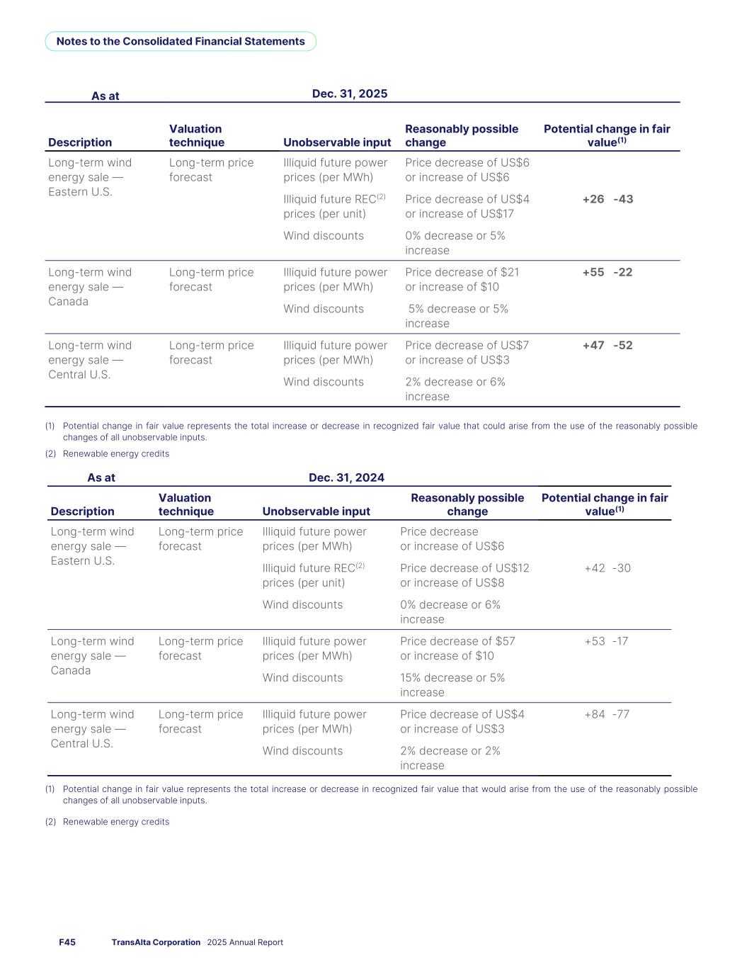 As at Dec. 31, 2025 Description Valuation technique Unobservable input Reasonably possible change Potential change in fair value(1) Long-term wind energy sale — Eastern U.S. Long-term price forecast Illiquid future power prices (per MWh) Price decrease of US$6 or increase of US$6 Illiquid future REC(2) prices (per unit) Price decrease of US$4 or increase of US$17 +26 -43 Wind discounts 0% decrease or 5% increase Long-term wind energy sale — Canada Long-term price forecast Illiquid future power prices (per MWh) Price decrease of $21 or increase of $10 +55 -22 Wind discounts 5% decrease or 5% increase Long-term wind energy sale — Central U.S. Long-term price forecast Illiquid future power prices (per MWh) Price decrease of US$7 or increase of US$3 +47 -52 Wind discounts 2% decrease or 6% increase (1) Potential change in fair value represents the total increase or decrease in recognized fair value that could arise from the use of the reasonably possible changes of all unobservable inputs. (2) Renewable energy credits As at Dec. 31, 2024 Description Valuation technique Unobservable input Reasonably possible change Potential change in fair value(1) Long-term wind energy sale — Eastern U.S. Long-term price forecast Illiquid future power prices (per MWh) Price decrease or increase of US$6 Illiquid future REC(2) prices (per unit) Price decrease of US$12 or increase of US$8 +42 -30 Wind discounts 0% decrease or 6% increase Long-term wind energy sale — Canada Long-term price forecast Illiquid future power prices (per MWh) Price decrease of $57 or increase of $10 +53 -17 Wind discounts 15% decrease or 5% increase Long-term wind energy sale — Central U.S. Long-term price forecast Illiquid future power prices (per MWh) Price decrease of US$4 or increase of US$3 +84 -77 Wind discounts 2% decrease or 2% increase (1) Potential change in fair value represents the total increase or decrease in recognized fair value that would arise from the use of the reasonably possible changes of all unobservable inputs. (2) Renewable energy credits F45 TransAlta Corporation 2025 Annual Report