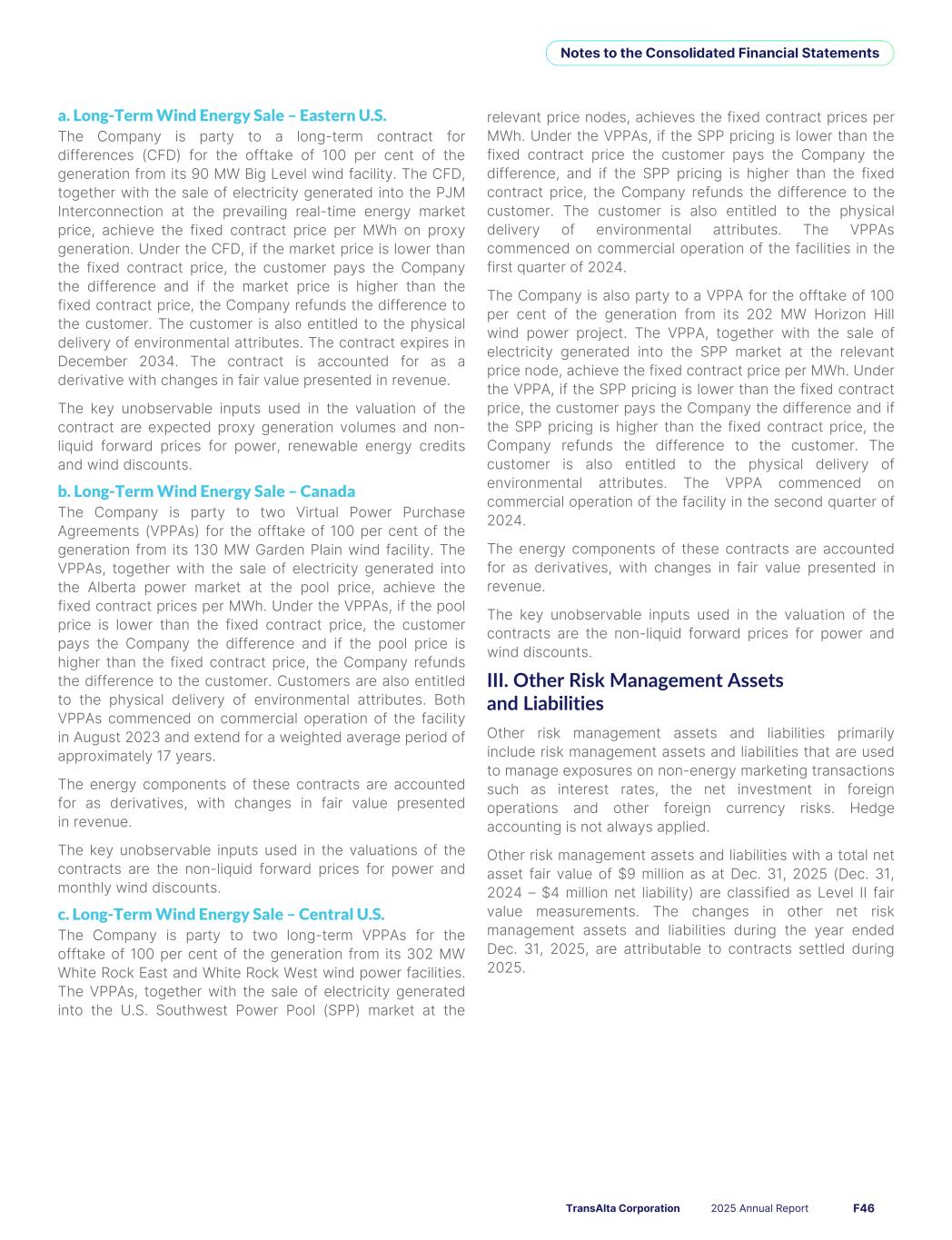 a. Long-Term Wind Energy Sale – Eastern U.S. The Company is party to a long-term contract for differences (CFD) for the offtake of 100 per cent of the generation from its 90 MW Big Level wind facility. The CFD, together with the sale of electricity generated into the PJM Interconnection at the prevailing real-time energy market price, achieve the fixed contract price per MWh on proxy generation. Under the CFD, if the market price is lower than the fixed contract price, the customer pays the Company the difference and if the market price is higher than the fixed contract price, the Company refunds the difference to the customer. The customer is also entitled to the physical delivery of environmental attributes. The contract expires in December 2034. The contract is accounted for as a derivative with changes in fair value presented in revenue. The key unobservable inputs used in the valuation of the contract are expected proxy generation volumes and non- liquid forward prices for power, renewable energy credits and wind discounts. b. Long-Term Wind Energy Sale – Canada The Company is party to two Virtual Power Purchase Agreements (VPPAs) for the offtake of 100 per cent of the generation from its 130 MW Garden Plain wind facility. The VPPAs, together with the sale of electricity generated into the Alberta power market at the pool price, achieve the fixed contract prices per MWh. Under the VPPAs, if the pool price is lower than the fixed contract price, the customer pays the Company the difference and if the pool price is higher than the fixed contract price, the Company refunds the difference to the customer. Customers are also entitled to the physical delivery of environmental attributes. Both VPPAs commenced on commercial operation of the facility in August 2023 and extend for a weighted average period of approximately 17 years. The energy components of these contracts are accounted for as derivatives, with changes in fair value presented in revenue. The key unobservable inputs used in the valuations of the contracts are the non-liquid forward prices for power and monthly wind discounts. c. Long-Term Wind Energy Sale – Central U.S. The Company is party to two long-term VPPAs for the offtake of 100 per cent of the generation from its 302 MW White Rock East and White Rock West wind power facilities. The VPPAs, together with the sale of electricity generated into the U.S. Southwest Power Pool (SPP) market at the relevant price nodes, achieves the fixed contract prices per MWh. Under the VPPAs, if the SPP pricing is lower than the fixed contract price the customer pays the Company the difference, and if the SPP pricing is higher than the fixed contract price, the Company refunds the difference to the customer. The customer is also entitled to the physical delivery of environmental attributes. The VPPAs commenced on commercial operation of the facilities in the first quarter of 2024. The Company is also party to a VPPA for the offtake of 100 per cent of the generation from its 202 MW Horizon Hill wind power project. The VPPA, together with the sale of electricity generated into the SPP market at the relevant price node, achieve the fixed contract price per MWh. Under the VPPA, if the SPP pricing is lower than the fixed contract price, the customer pays the Company the difference and if the SPP pricing is higher than the fixed contract price, the Company refunds the difference to the customer. The customer is also entitled to the physical delivery of environmental attributes. The VPPA commenced on commercial operation of the facility in the second quarter of 2024. The energy components of these contracts are accounted for as derivatives, with changes in fair value presented in revenue. The key unobservable inputs used in the valuation of the contracts are the non-liquid forward prices for power and wind discounts. III. Other Risk Management Assets and Liabilities Other risk management assets and liabilities primarily include risk management assets and liabilities that are used to manage exposures on non-energy marketing transactions such as interest rates, the net investment in foreign operations and other foreign currency risks. Hedge accounting is not always applied. Other risk management assets and liabilities with a total net asset fair value of $9 million as at Dec. 31, 2025 (Dec. 31, 2024 – $4 million net liability) are classified as Level II fair value measurements. The changes in other net risk management assets and liabilities during the year ended Dec. 31, 2025, are attributable to contracts settled during 2025. TransAlta Corporation 2025 Annual Report F46