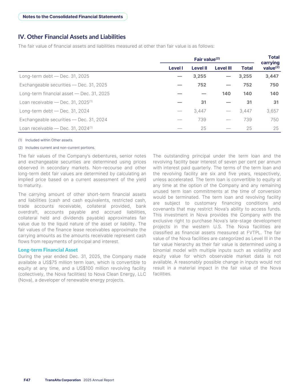 IV. Other Financial Assets and Liabilities The fair value of financial assets and liabilities measured at other than fair value is as follows:   Fair value(2) Total carrying value(2)  Level I Level II Level III Total Long-term debt — Dec. 31, 2025 — 3,255 — 3,255 3,447 Exchangeable securities — Dec. 31, 2025 — 752 — 752 750 Long-term financial asset — Dec. 31, 2025 — — 140 140 140 Loan receivable — Dec. 31, 2025(1) — 31 — 31 31 Long-term debt — Dec. 31, 2024 — 3,447 — 3,447 3,657 Exchangeable securities — Dec. 31, 2024 — 739 — 739 750 Loan receivable — Dec. 31, 2024(1) — 25 — 25 25 (1) Included within Other assets. (2) Includes current and non-current portions. The fair values of the Company’s debentures, senior notes and exchangeable securities are determined using prices observed in secondary markets. Non-recourse and other long-term debt fair values are determined by calculating an implied price based on a current assessment of the yield to maturity. The carrying amount of other short-term financial assets and liabilities (cash and cash equivalents, restricted cash, trade accounts receivable, collateral provided, bank overdraft, accounts payable and accrued liabilities, collateral held and dividends payable) approximates fair value due to the liquid nature of the asset or liability. The fair values of the finance lease receivables approximate the carrying amounts as the amounts receivable represent cash flows from repayments of principal and interest. Long-term Financial Asset During the year ended Dec. 31, 2025, the Company made available a US$75 million term loan, which is convertible to equity at any time, and a US$100  million revolving facility (collectively, the Nova facilities) to Nova Clean Energy, LLC (Nova), a developer of renewable energy projects. The outstanding principal under the term loan and the revolving facility bear interest of seven per cent per annum with interest paid quarterly. The terms of the term loan and the revolving facility are six and five years, respectively, unless accelerated. The term loan is convertible to equity at any time at the option of the Company and any remaining unused term loan commitments at the time of conversion would be terminated. The term loan and revolving facility are subject to customary financing conditions and covenants that may restrict Nova's ability to access funds. This investment in Nova provides the Company with the exclusive right to purchase Nova's late-stage development projects in the western U.S. The Nova facilities are classified as financial assets measured at FVTPL. The fair value of the Nova facilities are categorized as Level III in the fair value hierarchy as their fair value is determined using a binomial model with multiple inputs such as volatility and equity value for which observable market data is not available. A reasonably possible change in inputs would not result in a material impact in the fair value of the Nova facilities. F47 TransAlta Corporation 2025 Annual Report