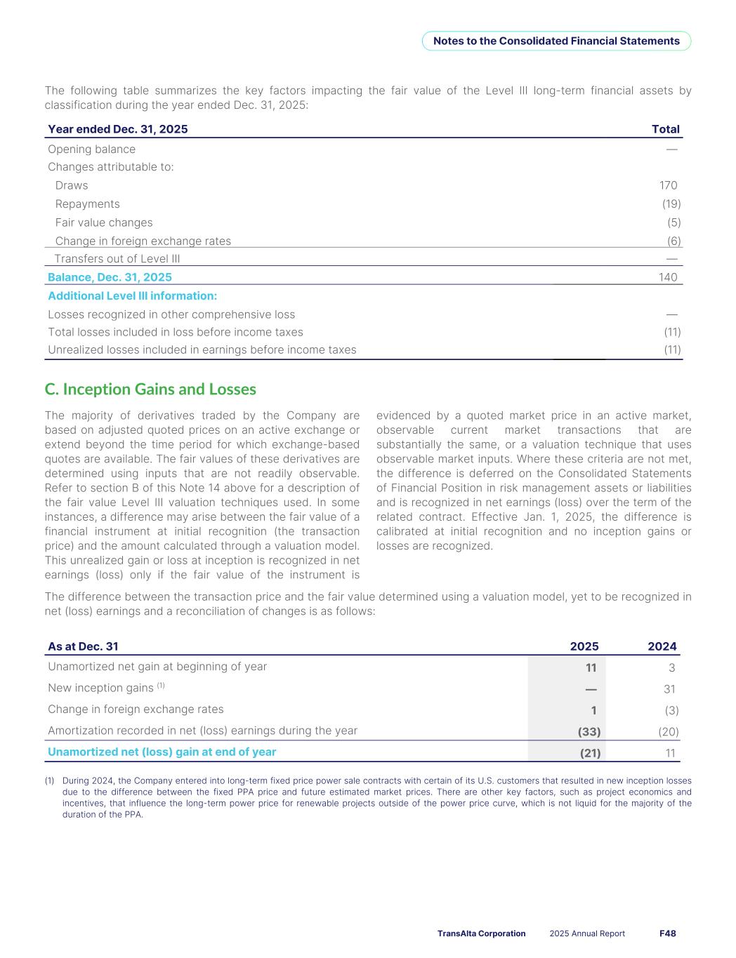 The following table summarizes the key factors impacting the fair value of the Level III long-term financial assets by classification during the year ended Dec. 31, 2025: Year ended Dec. 31, 2025 Total Opening balance — Changes attributable to: Draws 170 Repayments (19) Fair value changes (5) Change in foreign exchange rates (6) Transfers out of Level III — Balance, Dec. 31, 2025 140 Additional Level III information: Losses recognized in other comprehensive loss — Total losses included in loss before income taxes (11) Unrealized losses included in earnings before income taxes (11) C. Inception Gains and Losses The majority of derivatives traded by the Company are based on adjusted quoted prices on an active exchange or extend beyond the time period for which exchange-based quotes are available. The fair values of these derivatives are determined using inputs that are not readily observable. Refer to section B of this Note 14 above for a description of the fair value Level III valuation techniques used. In some instances, a difference may arise between the fair value of a financial instrument at initial recognition (the transaction price) and the amount calculated through a valuation model. This unrealized gain or loss at inception is recognized in net earnings (loss) only if the fair value of the instrument is evidenced by a quoted market price in an active market, observable current market transactions that are substantially the same, or a valuation technique that uses observable market inputs. Where these criteria are not met, the difference is deferred on the Consolidated Statements of Financial Position in risk management assets or liabilities and is recognized in net earnings (loss) over the term of the related contract. Effective Jan. 1, 2025, the difference is calibrated at initial recognition and no inception gains or losses are recognized. The difference between the transaction price and the fair value determined using a valuation model, yet to be recognized in net (loss) earnings and a reconciliation of changes is as follows: As at Dec. 31 2025 2024 Unamortized net gain at beginning of year 11 3 New inception gains (1) — 31 Change in foreign exchange rates 1 (3) Amortization recorded in net (loss) earnings during the year (33) (20) Unamortized net (loss) gain at end of year (21) 11 (1) During 2024, the Company entered into long-term fixed price power sale contracts with certain of its U.S. customers that resulted in new inception losses due to the difference between the fixed PPA price and future estimated market prices. There are other key factors, such as project economics and incentives, that influence the long-term power price for renewable projects outside of the power price curve, which is not liquid for the majority of the duration of the PPA. TransAlta Corporation 2025 Annual Report F48