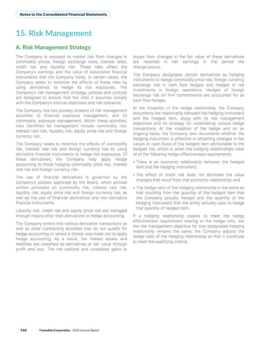 15. Risk Management A. Risk Management Strategy The Company is exposed to market risk from changes in commodity prices, foreign exchange rates, interest rates, credit risk and liquidity risk. These risks affect the Company’s earnings and the value of associated financial instruments that the Company holds. In certain cases, the Company seeks to minimize the effects of these risks by using derivatives to hedge its risk exposures. The Company’s risk management strategy, policies and controls are designed to ensure that the risks it assumes comply with the Company’s internal objectives and risk tolerance. The Company has two primary streams of risk management activities: (i) financial exposure management; and (ii) commodity exposure management. Within these activities, risks identified for management include commodity risk, interest rate risk, liquidity risk, equity price risk and foreign currency risk. The Company seeks to minimize the effects of commodity risk, interest rate risk and foreign currency risk by using derivative financial instruments to hedge risk exposures. Of these derivatives, the Company may apply hedge accounting to those hedging commodity price risk, interest rate risk and foreign currency risk. The use of financial derivatives is governed by the Company’s policies approved by the Board, which provide written principles on commodity risk, interest rate risk, liquidity risk, equity price risk and foreign currency risk, as well as the use of financial derivatives and non-derivative financial instruments. Liquidity risk, credit risk and equity price risk are managed through means other than derivatives or hedge accounting. The Company enters into various derivative transactions as well as other contracting activities that do not qualify for hedge accounting or where a choice was made not to apply hedge accounting. As a result, the related assets and liabilities are classified as derivatives at fair value through profit and loss. The net realized and unrealized gains or losses from changes in the fair value of these derivatives are reported in net earnings in the period the change occurs. The Company designates certain derivatives as hedging instruments to hedge commodity price risk, foreign currency exchange risk in cash flow hedges and hedges of net investments in foreign operations. Hedges of foreign exchange risk on firm commitments are accounted for as cash flow hedges. At the inception of the hedge relationship, the Company documents the relationship between the hedging instrument and the hedged item, along with its risk management objectives and its strategy for undertaking various hedge transactions. At the inception of the hedge and on an ongoing basis, the Company also documents whether the hedging instrument is effective in offsetting changes in fair values or cash flows of the hedged item attributable to the hedged risk, which is when the hedging relationships meet all of the following hedge effectiveness requirements: • There is an economic relationship between the hedged item and the hedging instrument; • The effect of credit risk does not dominate the value changes that result from that economic relationship; and • The hedge ratio of the hedging relationship is the same as that resulting from the quantity of the hedged item that the Company actually hedges and the quantity of the hedging instrument that the entity actually uses to hedge that quantity of hedged item. If a hedging relationship ceases to meet the hedge effectiveness requirement relating to the hedge ratio, but the risk management objective for that designated hedging relationship remains the same, the Company adjusts the hedge ratio of the hedging relationship so that it continues to meet the qualifying criteria. F49 TransAlta Corporation 2025 Annual Report