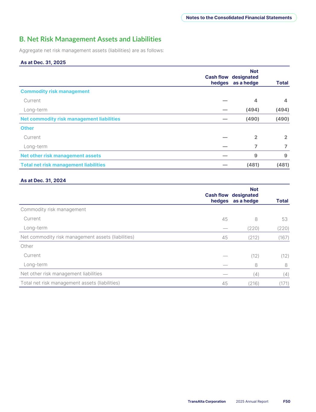 B. Net Risk Management Assets and Liabilities Aggregate net risk management assets (liabilities) are as follows: As at Dec. 31, 2025   Cash flow hedges Not designated as a hedge Total Commodity risk management       Current — 4 4 Long-term — (494) (494) Net commodity risk management liabilities — (490) (490) Other       Current — 2 2 Long-term — 7 7 Net other risk management assets — 9 9 Total net risk management liabilities — (481) (481) As at Dec. 31, 2024 Cash flow hedges Not designated as a hedge Total Commodity risk management       Current 45 8 53 Long-term — (220) (220) Net commodity risk management assets (liabilities) 45 (212) (167) Other       Current — (12) (12) Long-term — 8 8 Net other risk management liabilities — (4) (4) Total net risk management assets (liabilities) 45 (216) (171) TransAlta Corporation 2025 Annual Report F50