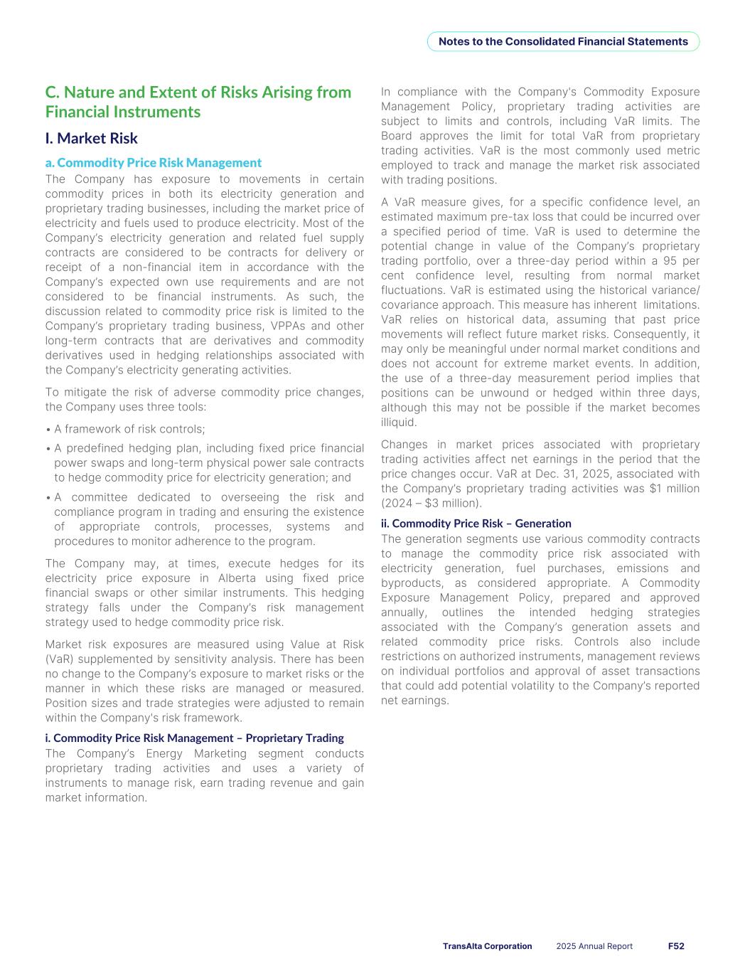 C. Nature and Extent of Risks Arising from Financial Instruments I. Market Risk a. Commodity Price Risk Management The Company has exposure to movements in certain commodity prices in both its electricity generation and proprietary trading businesses, including the market price of electricity and fuels used to produce electricity. Most of the Company’s electricity generation and related fuel supply contracts are considered to be contracts for delivery or receipt of a non-financial item in accordance with the Company’s expected own use requirements and are not considered to be financial instruments. As such, the discussion related to commodity price risk is limited to the Company’s proprietary trading business, VPPAs and other long-term contracts that are derivatives and commodity derivatives used in hedging relationships associated with the Company’s electricity generating activities. To mitigate the risk of adverse commodity price changes, the Company uses three tools: • A framework of risk controls; • A predefined hedging plan, including fixed price financial power swaps and long-term physical power sale contracts to hedge commodity price for electricity generation; and • A committee dedicated to overseeing the risk and compliance program in trading and ensuring the existence of appropriate controls, processes, systems and procedures to monitor adherence to the program. The Company may, at times, execute hedges for its electricity price exposure in Alberta using fixed price financial swaps or other similar instruments. This hedging strategy falls under the Company’s risk management strategy used to hedge commodity price risk. Market risk exposures are measured using Value at Risk (VaR) supplemented by sensitivity analysis. There has been no change to the Company’s exposure to market risks or the manner in which these risks are managed or measured. Position sizes and trade strategies were adjusted to remain within the Company's risk framework. i. Commodity Price Risk Management – Proprietary Trading The Company’s Energy Marketing segment conducts proprietary trading activities and uses a variety of instruments to manage risk, earn trading revenue and gain market information. In compliance with the Company's Commodity Exposure Management Policy, proprietary trading activities are subject to limits and controls, including VaR limits. The Board approves the limit for total VaR from proprietary trading activities. VaR is the most commonly used metric employed to track and manage the market risk associated with trading positions. A VaR measure gives, for a specific confidence level, an estimated maximum pre-tax loss that could be incurred over a specified period of time. VaR is used to determine the potential change in value of the Company’s proprietary trading portfolio, over a three-day period within a 95 per cent confidence level, resulting from normal market fluctuations. VaR is estimated using the historical variance/ covariance approach. This measure has inherent limitations. VaR relies on historical data, assuming that past price movements will reflect future market risks. Consequently, it may only be meaningful under normal market conditions and does not account for extreme market events. In addition, the use of a three-day measurement period implies that positions can be unwound or hedged within three days, although this may not be possible if the market becomes illiquid. Changes in market prices associated with proprietary trading activities affect net earnings in the period that the price changes occur. VaR at Dec. 31, 2025, associated with the Company’s proprietary trading activities was $1 million (2024 – $3 million). ii. Commodity Price Risk – Generation The generation segments use various commodity contracts to manage the commodity price risk associated with electricity generation, fuel purchases, emissions and byproducts, as considered appropriate. A Commodity Exposure Management Policy, prepared and approved annually, outlines the intended hedging strategies associated with the Company’s generation assets and related commodity price risks. Controls also include restrictions on authorized instruments, management reviews on individual portfolios and approval of asset transactions that could add potential volatility to the Company’s reported net earnings. TransAlta Corporation 2025 Annual Report F52