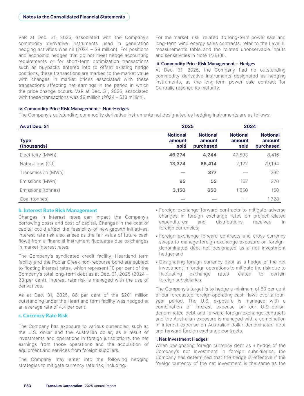 VaR at Dec. 31, 2025, associated with the Company’s commodity derivative instruments used in generation hedging activities was nil (2024 – $8 million). For positions and economic hedges that do not meet hedge accounting requirements or for short-term optimization transactions such as buybacks entered into to offset existing hedge positions, these transactions are marked to the market value with changes in market prices associated with these transactions affecting net earnings in the period in which the price change occurs. VaR at Dec. 31, 2025, associated with these transactions was $9 million (2024 – $13 million). For the market risk related to long-term power sale and long-term wind energy sales contracts, refer to the Level III measurements table and the related unobservable inputs and sensitivities in Note 14(B)(II). iii. Commodity Price Risk Management – Hedges At Dec. 31, 2025, the Company had no outstanding commodity derivative instruments designated as hedging instruments, as the long-term power sale contract for Centralia reached its maturity. iv. Commodity Price Risk Management – Non-Hedges The Company’s outstanding commodity derivative instruments not designated as hedging instruments are as follows: As at Dec. 31 2025 2024 Type (thousands) Notional amount sold Notional amount purchased Notional amount sold Notional amount purchased Electricity (MWh) 46,274 4,244 47,593 8,416 Natural gas (GJ) 13,374 66,414 2,122 79,194 Transmission (MWh) — 377 — 292 Emissions (MWh) 95 55 167 370 Emissions (tonnes) 3,150 650 1,850 150 Coal (tonnes) — — — 1,728 b. Interest Rate Risk Management Changes in interest rates can impact the Company’s borrowing costs and cost of capital. Changes in the cost of capital could affect the feasibility of new growth initiatives. Interest rate risk also arises as the fair value of future cash flows from a financial instrument fluctuates due to changes in market interest rates. The Company's syndicated credit facility, Heartland term facility and the Poplar Creek non-recourse bond are subject to floating interest rates, which represent 10 per cent of the Company’s total long-term debt as at Dec. 31, 2025 (2024 – 23 per cent). Interest rate risk is managed with the use of derivatives. As at Dec. 31, 2025, 86 per cent of the $201 million outstanding under the Heartland term facility was hedged at an average rate of 4.4 per cent. c. Currency Rate Risk The Company has exposure to various currencies, such as the U.S. dollar and the Australian dollar, as a result of investments and operations in foreign jurisdictions, the net earnings from those operations and the acquisition of equipment and services from foreign suppliers. The Company may enter into the following hedging strategies to mitigate currency rate risk, including: • Foreign exchange forward contracts to mitigate adverse changes in foreign exchange rates on project-related expenditures and distributions received in foreign currencies; • Foreign exchange forward contracts and cross-currency swaps to manage foreign exchange exposure on foreign- denominated debt not designated as a net investment hedge; and • Designating foreign currency debt as a hedge of the net investment in foreign operations to mitigate the risk due to fluctuating exchange rates related to certain foreign subsidiaries. The Company's target is to hedge a minimum of 60 per cent of our forecasted foreign operating cash flows over a four- year period. The U.S. exposure is managed with a combination of interest expense on our U.S.-dollar- denominated debt and forward foreign exchange contracts and the Australian exposure is managed with a combination of interest expense on Australian-dollar-denominated debt and forward foreign exchange contracts. i. Net Investment Hedges When designating foreign currency debt as a hedge of the Company’s net investment in foreign subsidiaries, the Company has determined that the hedge is effective if the foreign currency of the net investment is the same as the F53 TransAlta Corporation 2025 Annual Report