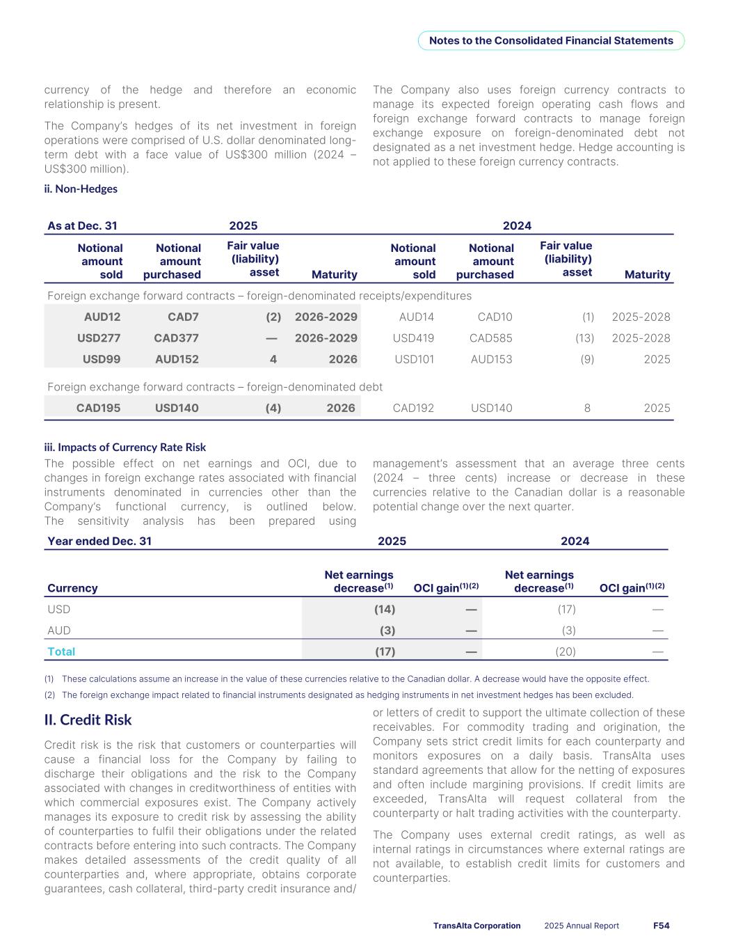 currency of the hedge and therefore an economic relationship is present. The Company’s hedges of its net investment in foreign operations were comprised of U.S. dollar denominated long- term debt with a face value of US$300 million (2024 – US$300 million). ii. Non-Hedges The Company also uses foreign currency contracts to manage its expected foreign operating cash flows and foreign exchange forward contracts to manage foreign exchange exposure on foreign-denominated debt not designated as a net investment hedge. Hedge accounting is not applied to these foreign currency contracts. As at Dec. 31 2025 2024 Notional amount sold Notional amount purchased Fair value (liability) asset Maturity Notional amount sold Notional amount purchased Fair value (liability) asset Maturity Foreign exchange forward contracts – foreign-denominated receipts/expenditures AUD12 CAD7 (2) 2026-2029 AUD14 CAD10 (1) 2025-2028 USD277 CAD377 — 2026-2029 USD419 CAD585 (13) 2025-2028 USD99 AUD152 4 2026 USD101 AUD153 (9) 2025 Foreign exchange forward contracts – foreign-denominated debt CAD195 USD140 (4) 2026 CAD192 USD140 8 2025 iii. Impacts of Currency Rate Risk The possible effect on net earnings and OCI, due to changes in foreign exchange rates associated with financial instruments denominated in currencies other than the Company’s functional currency, is outlined below. The  sensitivity analysis has been prepared using management’s assessment that an average three cents (2024 – three cents) increase or decrease in these currencies relative to the Canadian dollar is a reasonable potential change over the next quarter. Year ended Dec. 31 2025 2024 Currency Net earnings decrease(1) OCI gain(1)(2) Net earnings decrease(1) OCI gain(1)(2) USD (14) — (17) — AUD (3) — (3) — Total (17) — (20) — (1) These calculations assume an increase in the value of these currencies relative to the Canadian dollar. A decrease would have the opposite effect. (2) The foreign exchange impact related to financial instruments designated as hedging instruments in net investment hedges has been excluded. II. Credit Risk Credit risk is the risk that customers or counterparties will cause a financial loss for the Company by failing to discharge their obligations and the risk to the Company associated with changes in creditworthiness of entities with which commercial exposures exist. The Company actively manages its exposure to credit risk by assessing the ability of counterparties to fulfil their obligations under the related contracts before entering into such contracts. The Company makes detailed assessments of the credit quality of all counterparties and, where appropriate, obtains corporate guarantees, cash collateral, third-party credit insurance and/ or letters of credit to support the ultimate collection of these receivables. For commodity trading and origination, the Company sets strict credit limits for each counterparty and monitors exposures on a daily basis. TransAlta uses standard agreements that allow for the netting of exposures and often include margining provisions. If credit limits are exceeded, TransAlta will request collateral from the counterparty or halt trading activities with the counterparty. The Company uses external credit ratings, as well as internal ratings in circumstances where external ratings are not available, to establish credit limits for customers and counterparties. TransAlta Corporation 2025 Annual Report F54