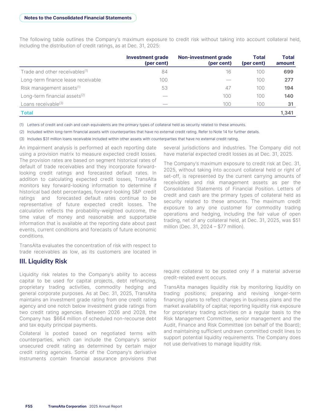 The following table outlines the Company’s maximum exposure to credit risk without taking into account collateral held, including the distribution of credit ratings, as at Dec. 31, 2025:   Investment grade (per cent) Non-investment grade (per cent) Total (per cent) Total amount Trade and other receivables(1) 84 16 100 699 Long-term finance lease receivable 100 — 100 277 Risk management assets(1) 53 47 100 194 Long-term financial assets(2) — 100 100 140 Loans receivable(3) — 100 100 31 Total       1,341 (1) Letters of credit and cash and cash equivalents are the primary types of collateral held as security related to these amounts. (2) Included within long-term financial assets with counterparties that have no external credit rating. Refer to Note 14 for further details. (3) Includes $31 million loans receivable included within other assets with counterparties that have no external credit rating. An impairment analysis is performed at each reporting date using a provision matrix to measure expected credit losses. The provision rates are based on segment historical rates of default of trade receivables and they incorporate forward- looking credit ratings and forecasted default rates. In addition to calculating expected credit losses, TransAlta monitors key forward-looking information to determine if historical bad debt percentages, forward-looking S&P credit ratings and forecasted default rates continue to be representative of future expected credit losses. The calculation reflects the probability-weighted outcome, the time value of money and reasonable and supportable information that is available at the reporting date about past events, current conditions and forecasts of future economic conditions. TransAlta evaluates the concentration of risk with respect to trade receivables as low, as its customers are located in several jurisdictions and industries. The Company did not have material expected credit losses as at Dec. 31, 2025. The Company’s maximum exposure to credit risk at Dec. 31, 2025, without taking into account collateral held or right of set-off, is represented by the current carrying amounts of receivables and risk management assets as per the Consolidated Statements of Financial Position. Letters of credit and cash are the primary types of collateral held as security related to these amounts. The maximum credit exposure to any one customer for commodity trading operations and hedging, including the fair value of open trading, net of any collateral held, at Dec. 31, 2025, was $51 million (Dec. 31, 2024 – $77 million). III. Liquidity Risk Liquidity risk relates to the Company’s ability to access capital to be used for capital projects, debt refinancing, proprietary trading activities, commodity hedging and general corporate purposes. As at Dec. 31, 2025, TransAlta maintains an investment grade rating from one credit rating agency and one notch below investment grade ratings from two credit rating agencies. Between 2026 and 2028, the Company has $664 million of scheduled non-recourse debt and tax equity principal payments. Collateral is posted based on negotiated terms with counterparties, which can include the Company’s senior unsecured credit rating as determined by certain major credit rating agencies. Some of the Company’s derivative instruments contain financial assurance provisions that require collateral to be posted only if a material adverse credit-related event occurs. TransAlta manages liquidity risk by monitoring liquidity on trading positions; preparing and revising longer-term financing plans to reflect changes in business plans and the market availability of capital; reporting liquidity risk exposure for proprietary trading activities on a regular basis to the Risk Management Committee, senior management and the Audit, Finance and Risk Committee (on behalf of the Board); and maintaining sufficient undrawn committed credit lines to support potential liquidity requirements. The Company does not use derivatives to manage liquidity risk. F55 TransAlta Corporation 2025 Annual Report