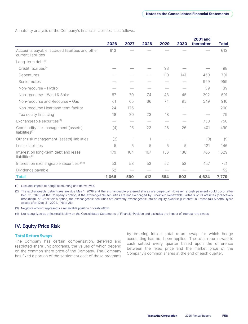 A maturity analysis of the Company's financial liabilities is as follows:   2026 2027 2028 2029 2030 2031 and thereafter Total Accounts payable, accrued liabilities and other current liabilities 613 — — — — — 613 Long-term debt(1) Credit facilities(1) — — — 98 — — 98 Debentures — — — 110 141 450 701 Senior notes — — — — — 959 959 Non-recourse – Hydro — — — — — 39 39 Non-recourse – Wind & Solar 67 70 74 43 45 202 501 Non-recourse and Recourse – Gas 61 65 66 74 95 549 910 Non-recourse Heartland term facility 24 176 — — — — 200 Tax equity financing 18 20 23 18 — — 79 Exchangeable securities(2) — — — — — 750 750 Commodity risk management (assets) liabilities(3) (4) 16 23 28 26 401 490 Other risk management (assets) liabilities (2) 1 1 — — (9) (9) Lease liabilities 5 5 5 5 5 121 146 Interest on long-term debt and lease liabilities(4) 179 184 167 156 138 705 1,529 Interest on exchangeable securities(2)(4) 53 53 53 52 53 457 721 Dividends payable 52 — — — — — 52 Total 1,066 590 412 584 503 4,624 7,779 (1) Excludes impact of hedge accounting and derivatives. (2) The exchangeable debentures are due May 1, 2039 and the exchangeable preferred shares are perpetual. However, a cash payment could occur after Dec. 31, 2028, at the Company's option, if the exchangeable securities are not exchanged by Brookfield Renewable Partners or its affiliates (collectively Brookfield). At Brookfield's option, the exchangeable securities are currently exchangeable into an equity ownership interest in TransAlta’s Alberta Hydro Assets after Dec. 31, 2024. (Note 26). (3) Negative amount represents a receivable position or cash inflow. (4) Not recognized as a financial liability on the Consolidated Statements of Financial Position and excludes the impact of interest rate swaps. IV. Equity Price Risk Total Return Swaps The Company has certain compensation, deferred and restricted share unit programs, the values of which depend on the common share price of the Company. The Company has fixed a portion of the settlement cost of these programs by entering into a total return swap for which hedge accounting has not been applied. The total return swap is cash settled every quarter based upon the difference between the fixed price and the market price of the Company’s common shares at the end of each quarter. TransAlta Corporation 2025 Annual Report F56