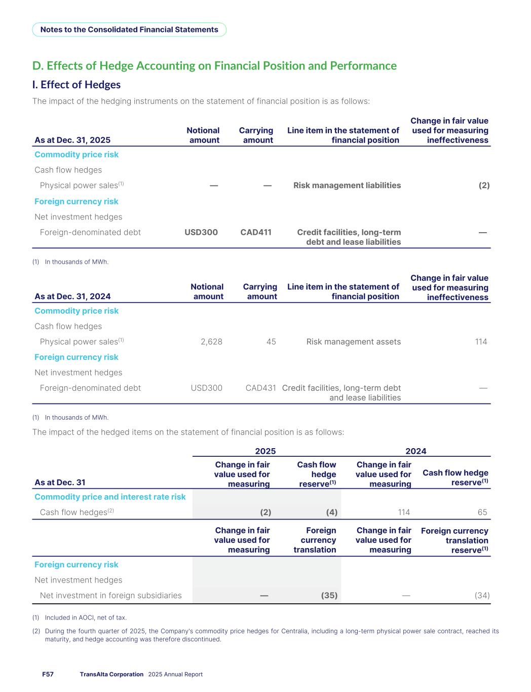D. Effects of Hedge Accounting on Financial Position and Performance I. Effect of Hedges The impact of the hedging instruments on the statement of financial position is as follows: As at Dec. 31, 2025 Notional amount Carrying amount Line item in the statement of financial position Change in fair value used for measuring ineffectiveness Commodity price risk Cash flow hedges Physical power sales(1) — — Risk management liabilities (2) Foreign currency risk Net investment hedges Foreign-denominated debt USD300 CAD411 Credit facilities, long-term debt and lease liabilities — (1) In thousands of MWh. As at Dec. 31, 2024 Notional amount Carrying amount Line item in the statement of financial position Change in fair value used for measuring ineffectiveness Commodity price risk Cash flow hedges Physical power sales(1) 2,628 45 Risk management assets 114 Foreign currency risk Net investment hedges Foreign-denominated debt USD300 CAD431 Credit facilities, long-term debt and lease liabilities — (1) In thousands of MWh. The impact of the hedged items on the statement of financial position is as follows: As at Dec. 31 2025 2024 Change in fair value used for measuring Cash flow hedge reserve(1) Change in fair value used for measuring Cash flow hedge reserve(1) Commodity price and interest rate risk Cash flow hedges(2) (2) (4) 114 65 Change in fair value used for measuring ineffectiveness Foreign currency translation reserve(1) Change in fair value used for measuring ineffectiveness Foreign currency translation reserve(1) Foreign currency risk Net investment hedges Net investment in foreign subsidiaries — (35) — (34) (1) Included in AOCI, net of tax. (2) During the fourth quarter of 2025, the Company's commodity price hedges for Centralia, including a long-term physical power sale contract, reached its maturity, and hedge accounting was therefore discontinued. F57 TransAlta Corporation 2025 Annual Report